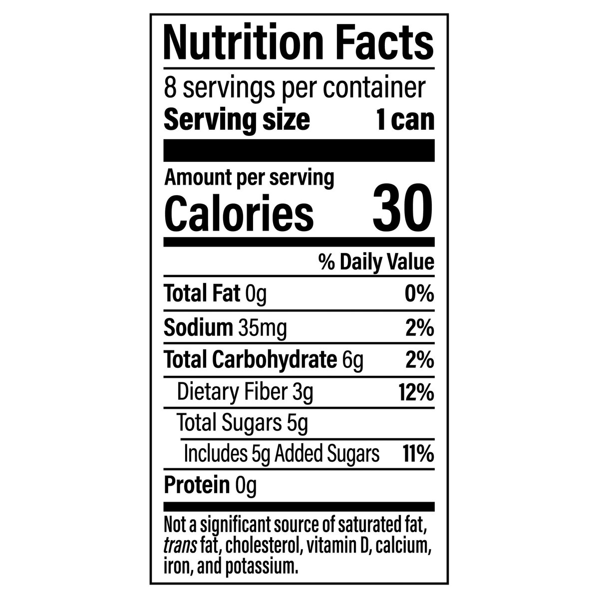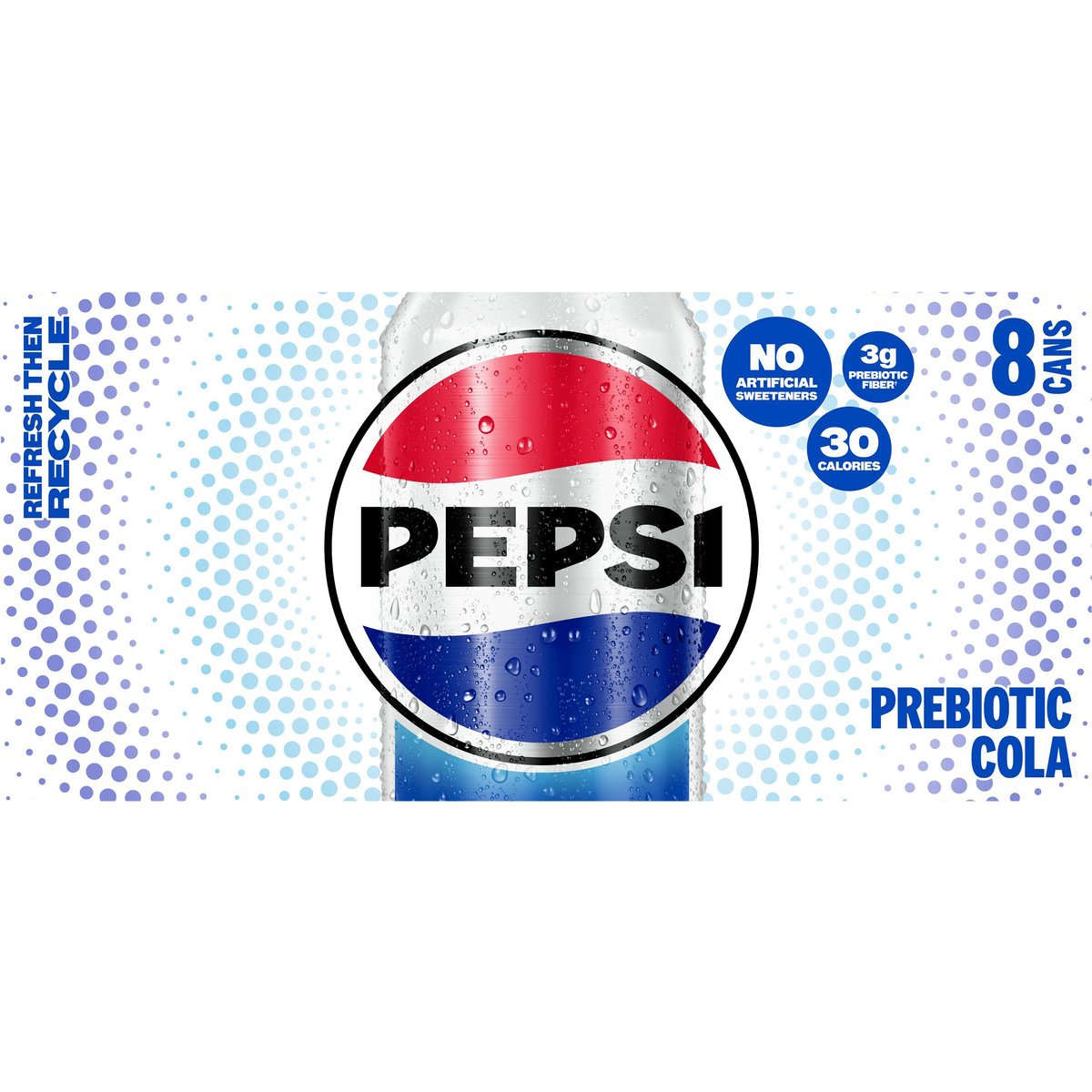 3 g prebiotic fiber(a). 30 calories. Per Can: 30 calories; 0 g sat fat (0% DV); 35 mg sodium (2% DV); 5 g added sugars (11% DV). (a) 10 g of soluble corn fiber daily has been shown to provide a prebiotic effect. Each can provides 3 g of soluble corn fiber. Caffeine Content: 38 mg/12 fl oz. No artificial sweeteners. See unit container for manufacturer's identity. how2recycle.info. SmartLabel: Scan for more food information or call 800.433.2652. We're here to help. Pepsi.com or 800.433.2652. Refresh then recycle.