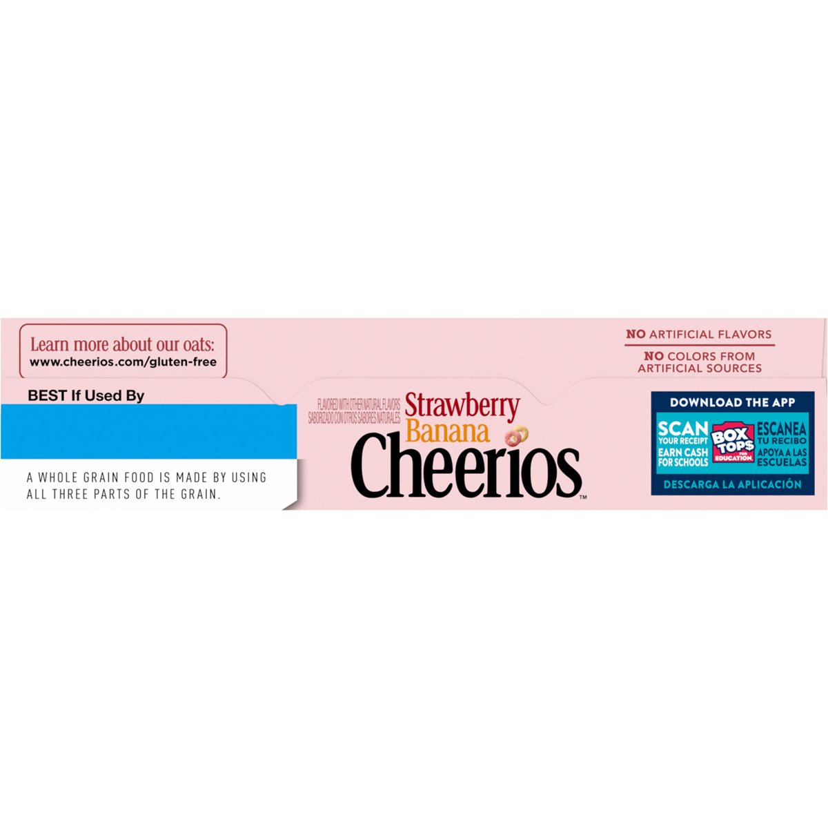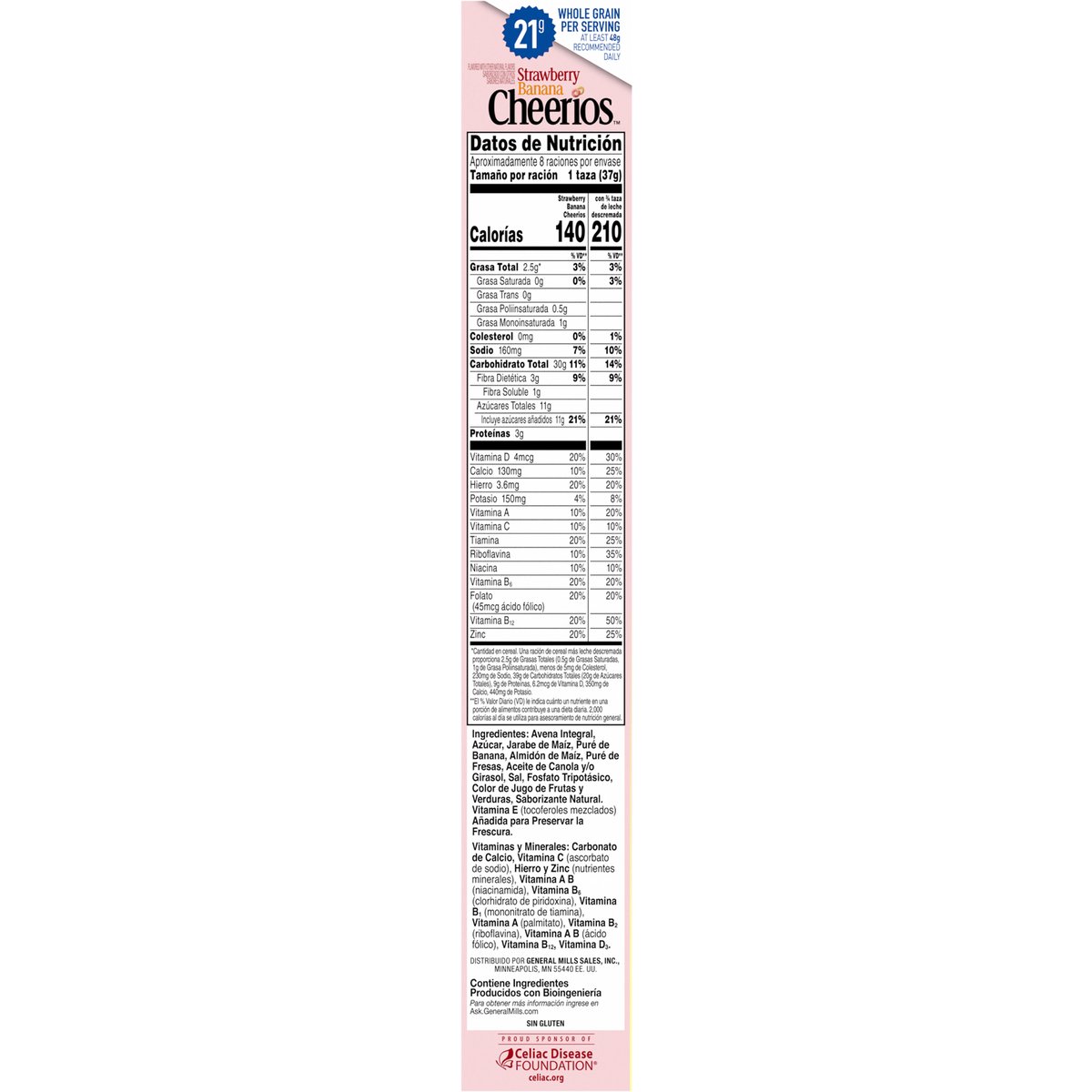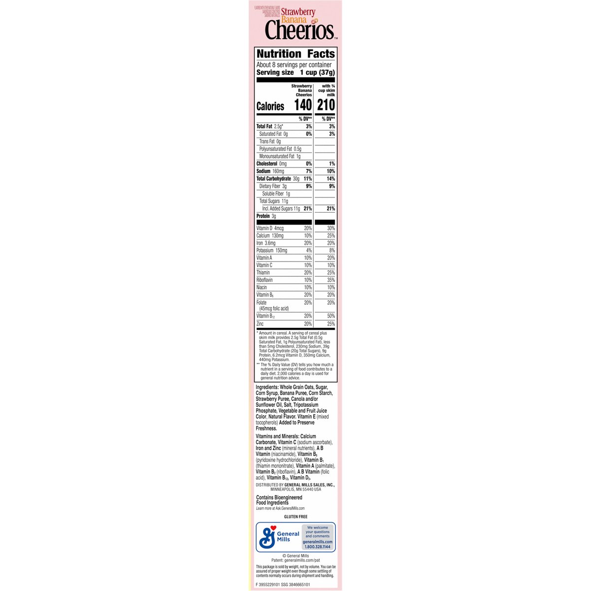 Sweetened whole grain oat cereal. Flavored with other natural flavors. No artificial flavors. Per 1 Cup Serving: 140 calories; 0 g sat fat (0% DV); 160 mg sodium (7% DV); 11 g added sugars (21% DV). Gluten free. 21 g whole grain per serving at least 48 g recommended daily. Can help lower cholesterol* as part of a heart healthy diet. See nutrition facts for as prepared information. * Three grams of soluble fiber daily from whole grain oat foods, like strawberry banana Cheerios cereal, in a diet low in saturated fat and cholesterol, may reduce the risk of heart disease. Strawberry banana Cheerios cereal provides .75 grams per serving. Contains bioengineered food ingredients. Learn more at Ask.GeneralMills.com. A whole grain food is made by using all three parts of the grain. No colors from artificial sources. Good mornings start with Cheerios. So many delicious flavors made with 100% Whole grain oats. This package is sold by weight, not by volume. You can be assured of proper weight even though some settling of contents normally occurs during shipment and handling. Ask.GeneralMills.com. generalmills.com. how2recycle.info. Learn more about our oats: www.cheerios.com/gluten-free. We welcome your questions and comments generalmills.com; 1.800.328.1144. Box Tops for Education: Download the app. Scan your receipt. Earn cash for schools. Proud Sponsor of Celiac Disease Foundation. celiac.org. Good morning start with Cheerios. Apple Cinnamon. Very Berry. Strawberry Banana. Honey Nut. Chocolate. Fruity. Frosted. So many delicious flavors made with 100% whole grain oats. Certified 100% recycled paperboard.