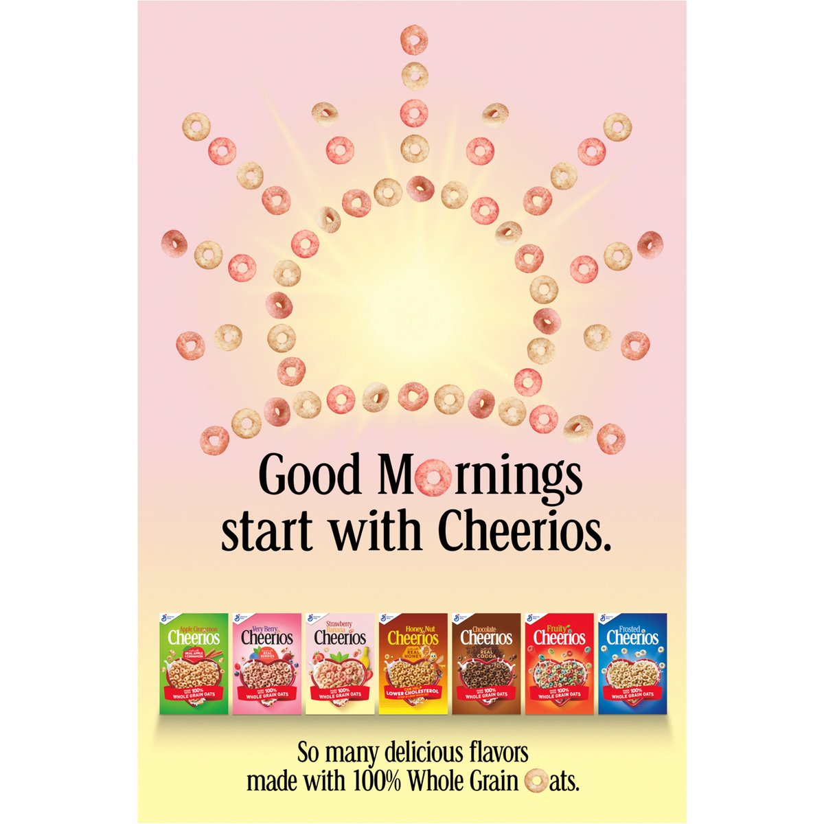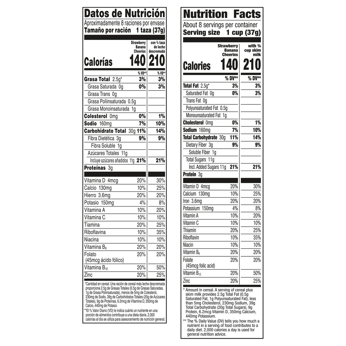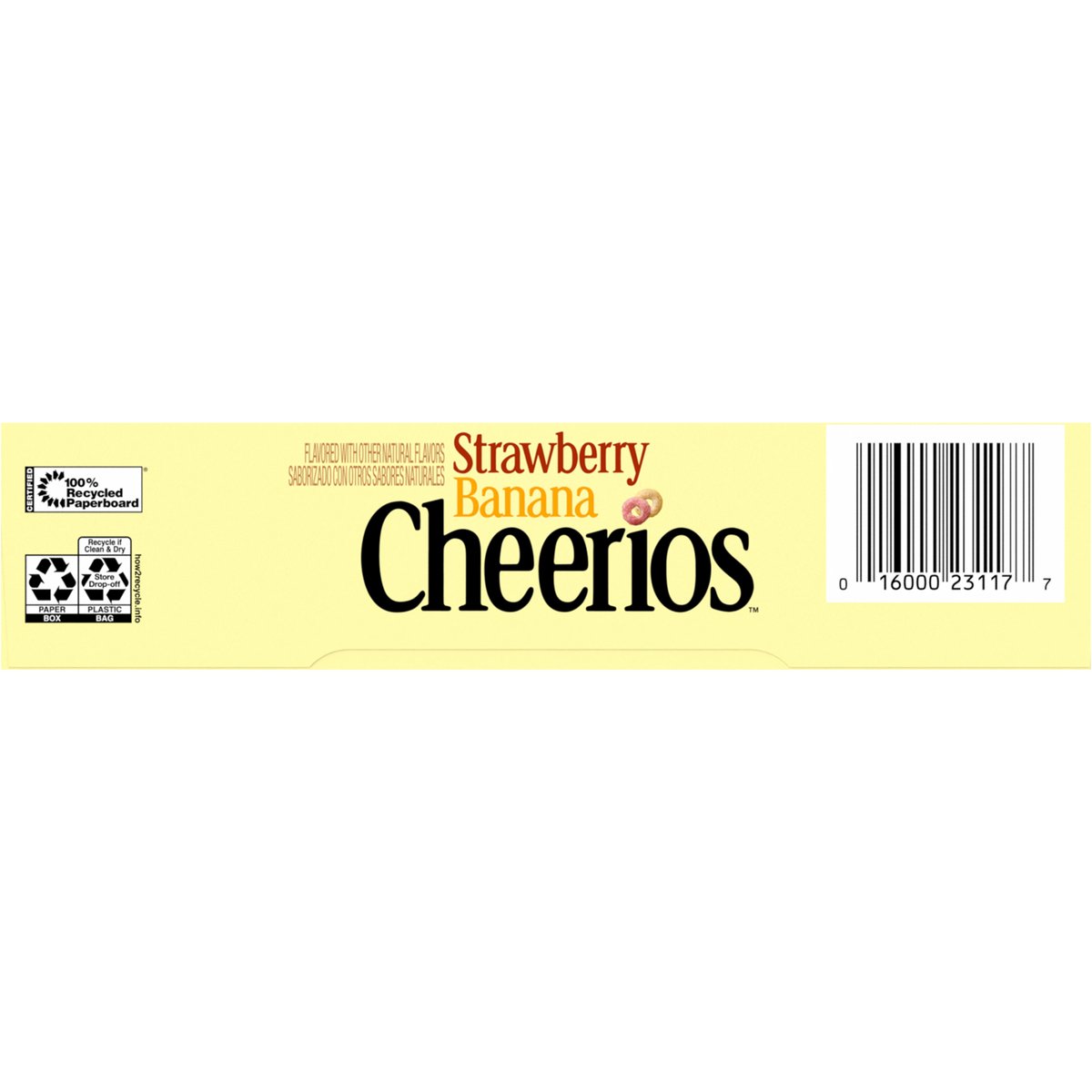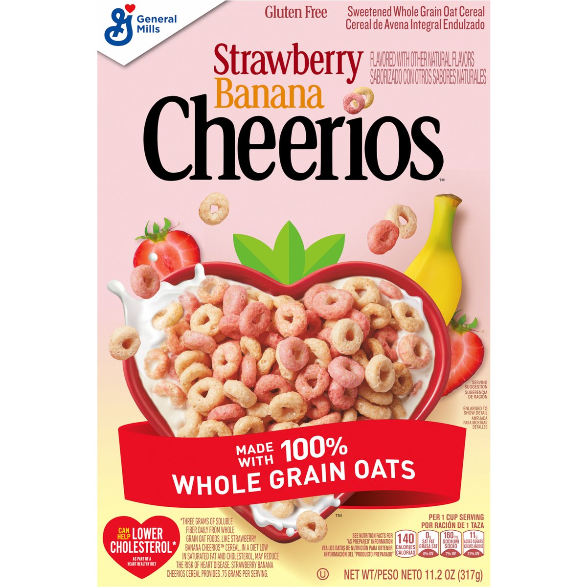 Sweetened whole grain oat cereal. Flavored with other natural flavors. No artificial flavors. Per 1 Cup Serving: 140 calories; 0 g sat fat (0% DV); 160 mg sodium (7% DV); 11 g added sugars (21% DV). Gluten free. 21 g whole grain per serving at least 48 g recommended daily. Can help lower cholesterol* as part of a heart healthy diet. See nutrition facts for as prepared information. * Three grams of soluble fiber daily from whole grain oat foods, like strawberry banana Cheerios cereal, in a diet low in saturated fat and cholesterol, may reduce the risk of heart disease. Strawberry banana Cheerios cereal provides .75 grams per serving. Contains bioengineered food ingredients. Learn more at Ask.GeneralMills.com. A whole grain food is made by using all three parts of the grain. No colors from artificial sources. Good mornings start with Cheerios. So many delicious flavors made with 100% Whole grain oats. This package is sold by weight, not by volume. You can be assured of proper weight even though some settling of contents normally occurs during shipment and handling. Ask.GeneralMills.com. generalmills.com. how2recycle.info. Learn more about our oats: www.cheerios.com/gluten-free. We welcome your questions and comments generalmills.com; 1.800.328.1144. Box Tops for Education: Download the app. Scan your receipt. Earn cash for schools. Proud Sponsor of Celiac Disease Foundation. celiac.org. Good morning start with Cheerios. Apple Cinnamon. Very Berry. Strawberry Banana. Honey Nut. Chocolate. Fruity. Frosted. So many delicious flavors made with 100% whole grain oats. Certified 100% recycled paperboard.