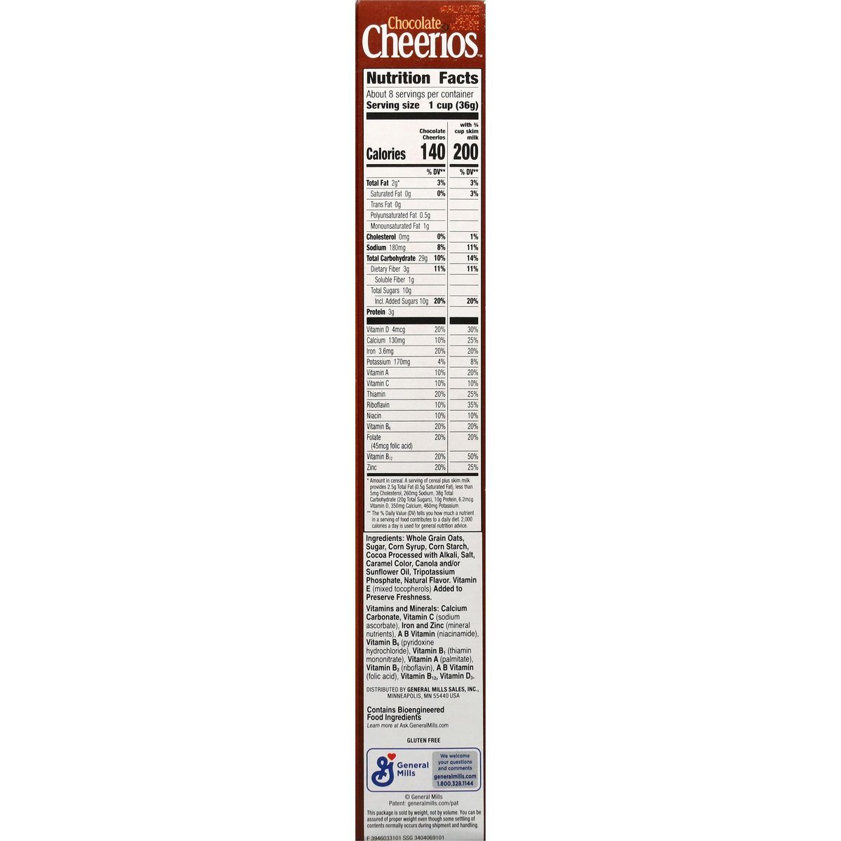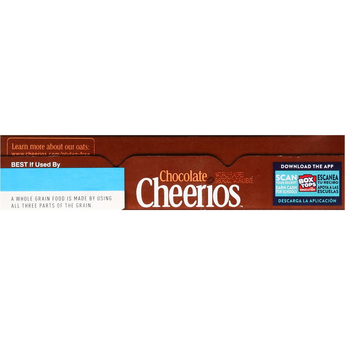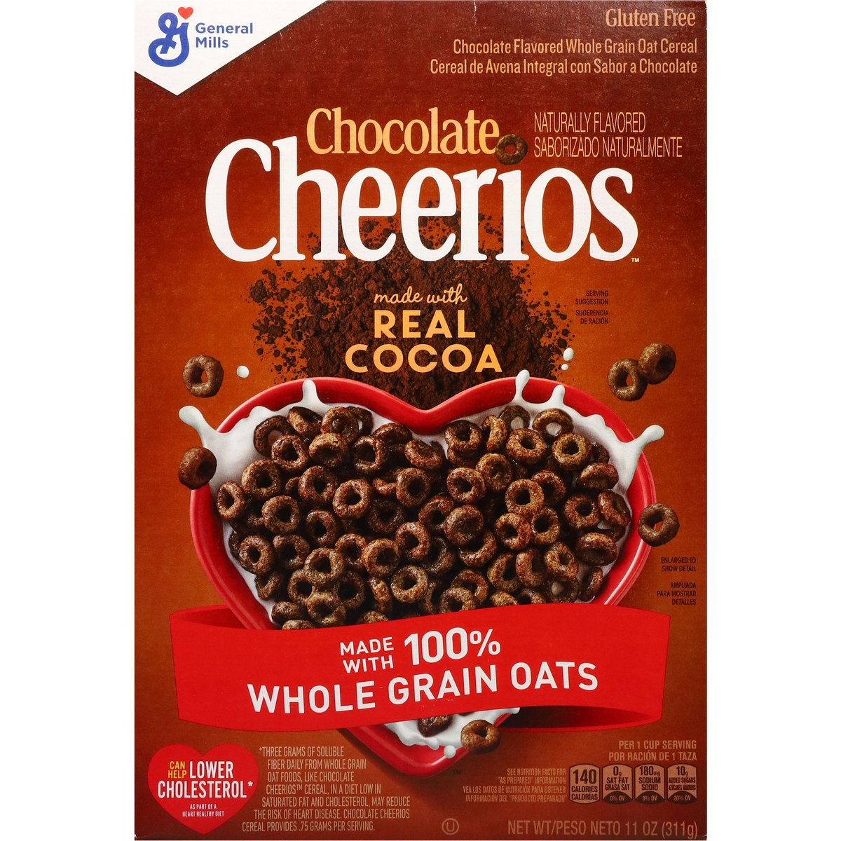 Chocolate flavored whole grain oat cereal. Naturally flavored. Per 1 Cup Serving: 140 calories; 0 g sat fat (0% DV); 180 mg sodium (8% DV); 10 g added sugars (20% DV). Gluten free. Made with 100% whole grain oats. 21 g whole grain per serving. At least 48 g recommended daily. A whole grain food is made by using all three parts of the grain. Can help lower cholesterol* as part of a heart healthy diet. See nutrition facts for "as prepared" information. * Three grams of soluble fiber daily from whole grain oat foods, like chocolate, may reduce the risk of heart disease. Chocolate Cheerios Cereal Provides. 75 grams per serving. Contains bioengineered food ingredients. Learn more at Ask.GeneralMills.com. General Mills. Good morning start with Cheerios. So many delicious flavors made with 100% Whole grain oats. This package is sold by weight, not by volume. You can be assured of proper weight even though some settling of contents normally occurs during shipment and handling. A whole grain food is made by using all three parts of the grain. generalmills.com. how2recycle.info. We welcome your questions and comments generalmills.com. 1.800.231.0308. Box Tops for Education: Download the app. Scan your receipt, earn cash for schools. Proud sponsor of Celiac Disease Foundation. celiac.org. Certified 100% recycled paperboard.