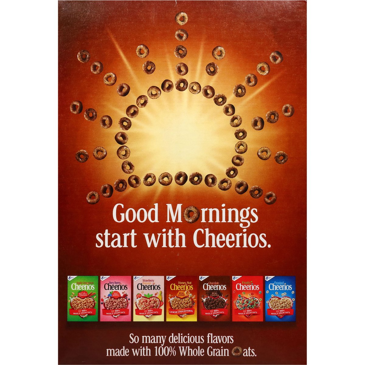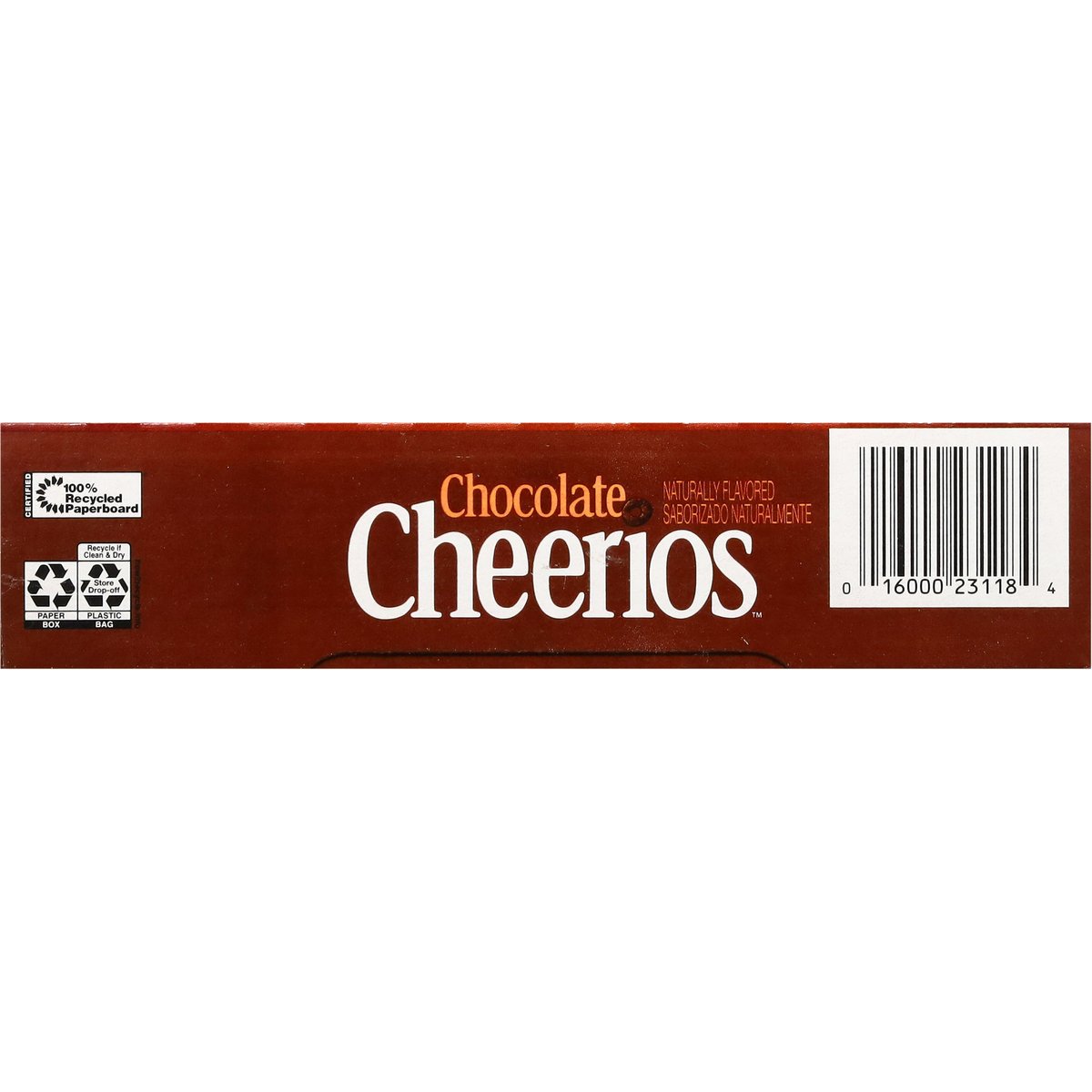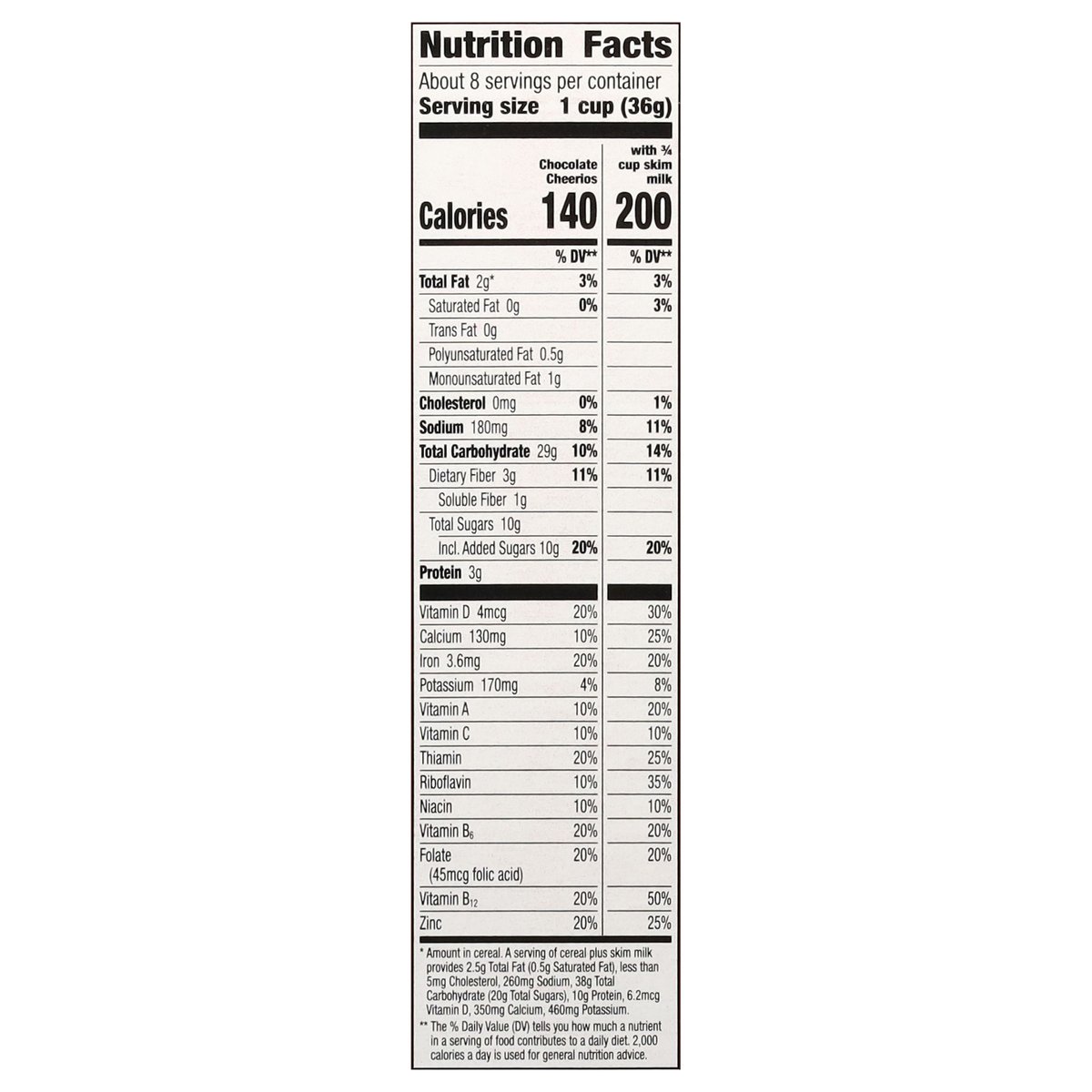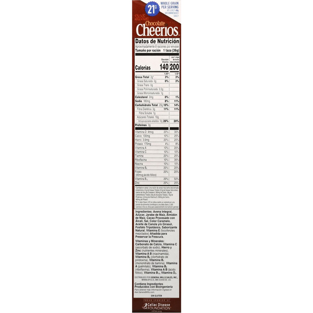 Chocolate flavored whole grain oat cereal. Naturally flavored. Per 1 Cup Serving: 140 calories; 0 g sat fat (0% DV); 180 mg sodium (8% DV); 10 g added sugars (20% DV). Gluten free. Made with 100% whole grain oats. 21 g whole grain per serving. At least 48 g recommended daily. A whole grain food is made by using all three parts of the grain. Can help lower cholesterol* as part of a heart healthy diet. See nutrition facts for "as prepared" information. * Three grams of soluble fiber daily from whole grain oat foods, like chocolate, may reduce the risk of heart disease. Chocolate Cheerios Cereal Provides. 75 grams per serving. Contains bioengineered food ingredients. Learn more at Ask.GeneralMills.com. General Mills. Good morning start with Cheerios. So many delicious flavors made with 100% Whole grain oats. This package is sold by weight, not by volume. You can be assured of proper weight even though some settling of contents normally occurs during shipment and handling. A whole grain food is made by using all three parts of the grain. generalmills.com. how2recycle.info. We welcome your questions and comments generalmills.com. 1.800.231.0308. Box Tops for Education: Download the app. Scan your receipt, earn cash for schools. Proud sponsor of Celiac Disease Foundation. celiac.org. Certified 100% recycled paperboard.