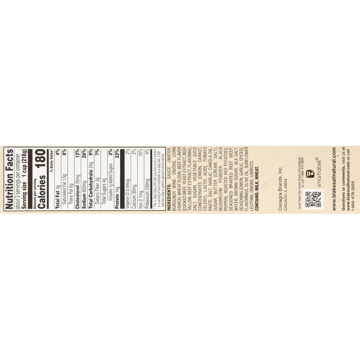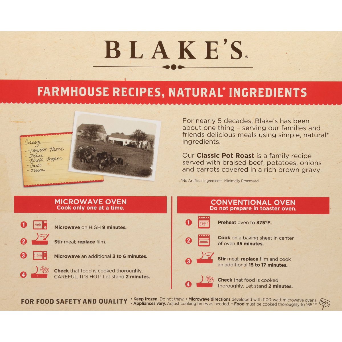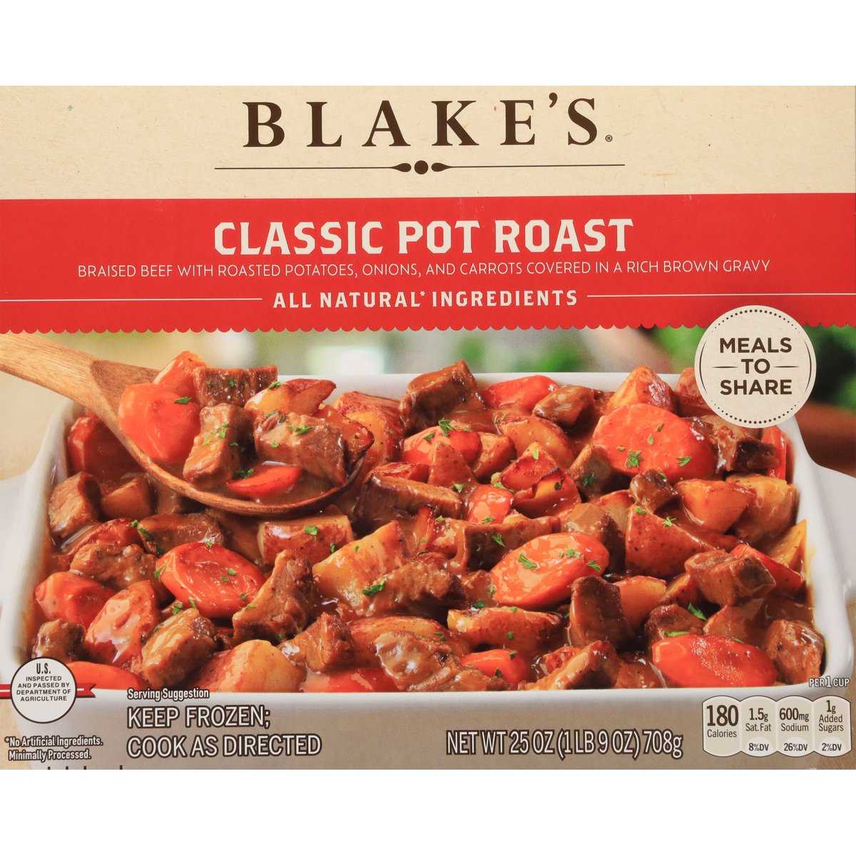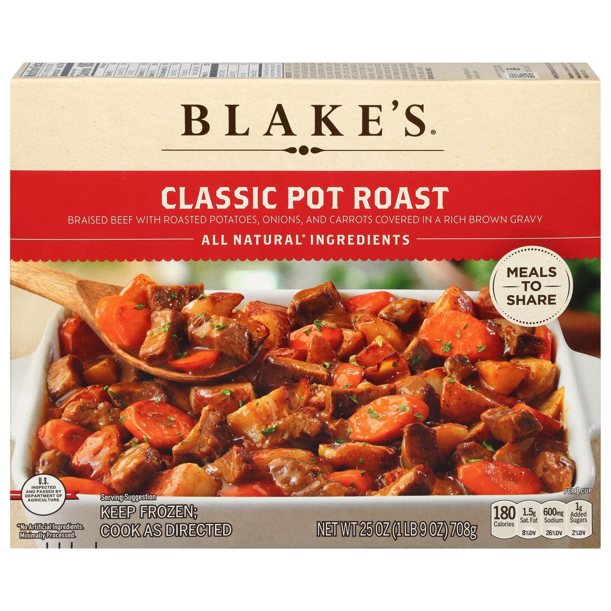 Braised beef with roasted potatoes, onions, and carrots covered in a rich brown gravy. Per 1 Cup: 180 calories; 1.5 sat. fat (8% DV); 600 mg sodium (26% DV): 1 g added sugars (2% DV). Meals to share. Farmhouse recipes, natural* ingredients. Gravy: Tomato paste; flour; black pepper; garlic; onion. For nearly 5 decades, Blake's has been about one thing - serving our families and friends delicious meals using simple, natural* ingredients. Our Classic Pot Roast is a family recipe served with braised beef, potatoes, onions and carrots covered in a rich brown gravy. * No artificial ingredients. Minimally processed. U.S. inspected and passed by Department of Agriculture. www.blakesallnatural.com. SmartLabel: Scan for more food information or call 1-866-479-3859. Questions or comments, visit us at www.blakesallnatural.com or call 1-866-479-3859.