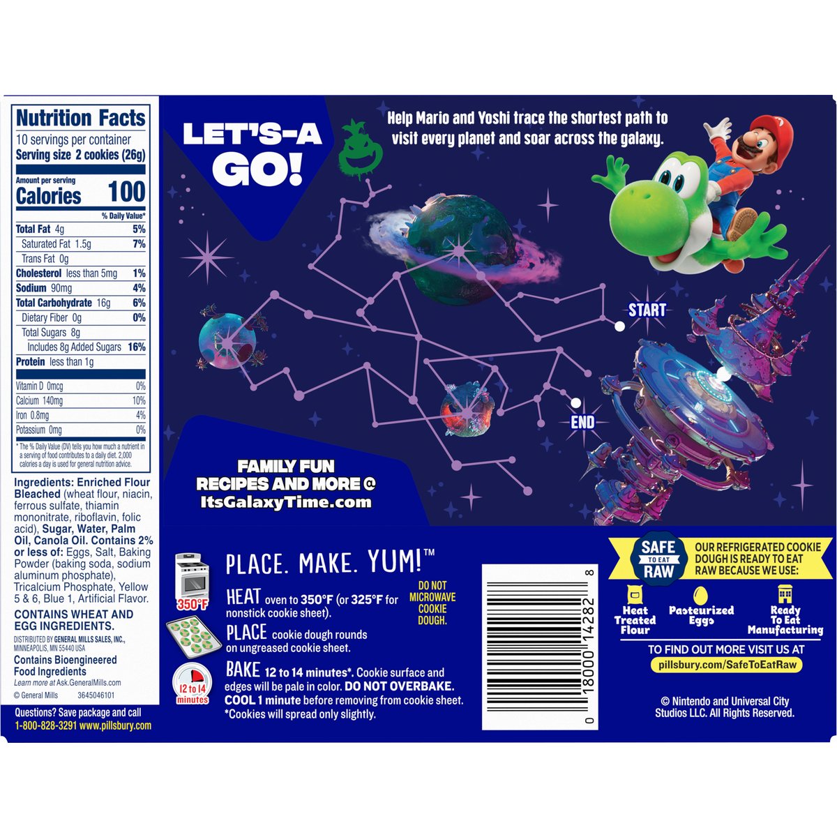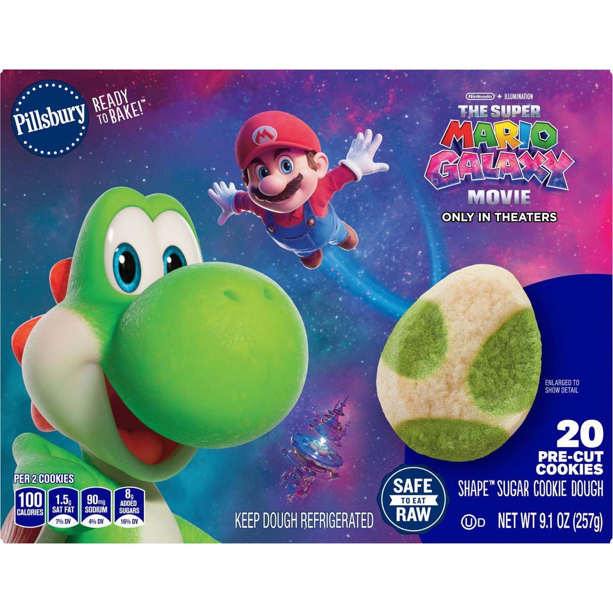 Shape sugar cookie dough. Per 2 Cookies: 100 calories; 1.5 g sat fat (7% DV); 90 mg sodium (4% DV); 8 g added sugars (16% DV). Contains bioengineered food ingredients. Learn more at Ask.GeneralMills.com. Ready to bake! Nintendo + Illumination. The Super Mario Galaxy movie only in theaters. Safe to Eat Raw: Our refrigerated cookie dough is ready to eat raw because we use: Heat treated flour. Pasteurized egg. Ready to eat manufacturing. www.pillsbury.com. ItsGalaxyTime.com. Ask.GeneralMills.com. how2recycle.info. Questions? Save package and call 1-800-828-3291; www.pillsbury.com. Family fun recipes and more @ ItsGalaxyTime.com. To find out more visit us at pillsbury.com/SafeToEatRaw. Box Tops for Education: Download the app. Scan your receipt. Earn cash for schools.