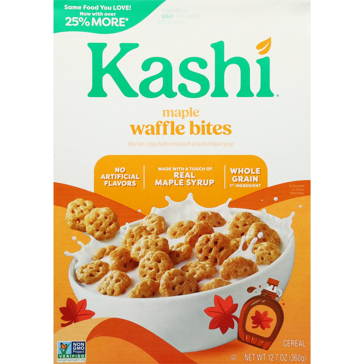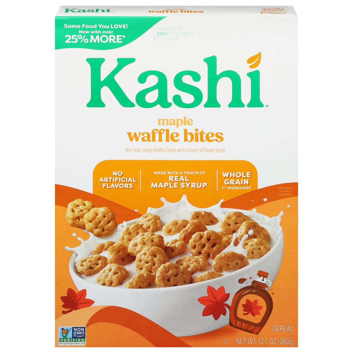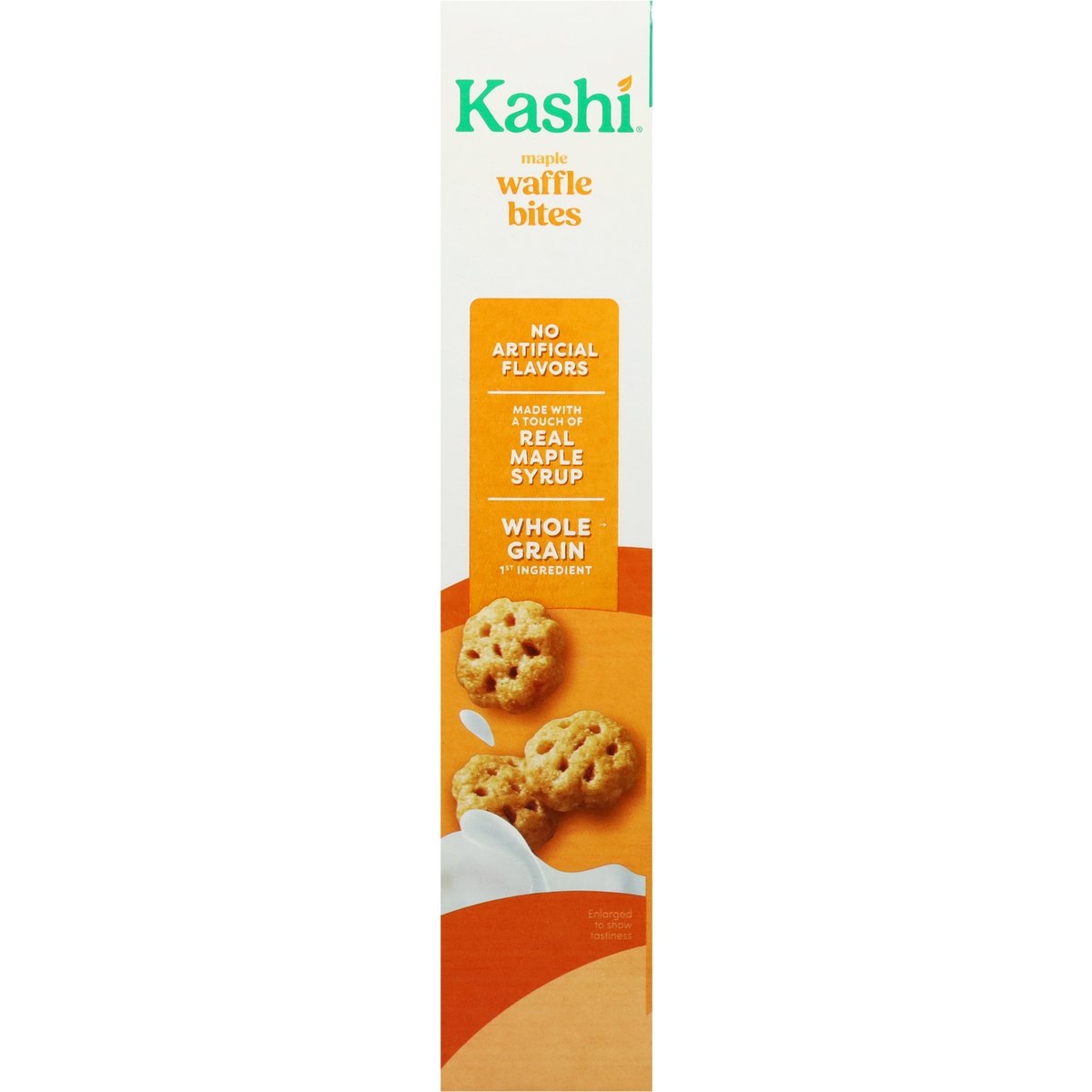 Bite-size, crispy waffle cereal with a touch of maple syrup. No artificial flavors. Vegan. 22 g whole grain per serving. Eat 48g or more of whole grains daily. Non-GMO Project verified. nongmoproject.org. Same food you love! Now with over 25% more*. Made with a touch of real maple syrup. Contents may settle. Product is sold by weight not volume. Bite size waffle cereal. Big maple waffle. Taste. With real maple syrup and a good source of fiber, these mini waffles are a tasty choice everyone can agree on! Delicious food that nourishes. *Compared to Kashi maple waffle bites 9.5 oz box. www.kashi.com. how2recycle.info. Scan for feel-good food and tips that make eating well easy! Have something to share? www.kashi.com. Certified 100% recycled paperboard.