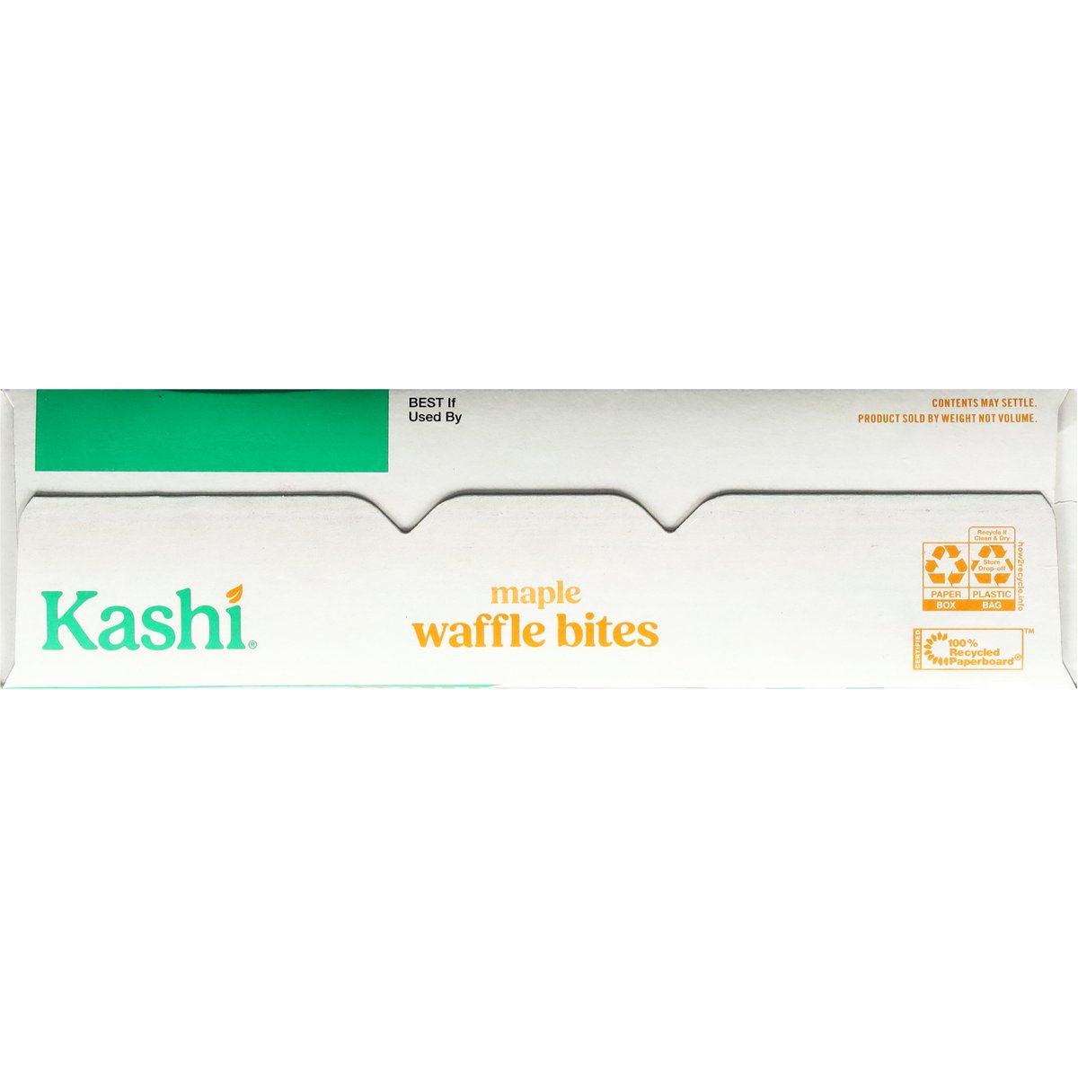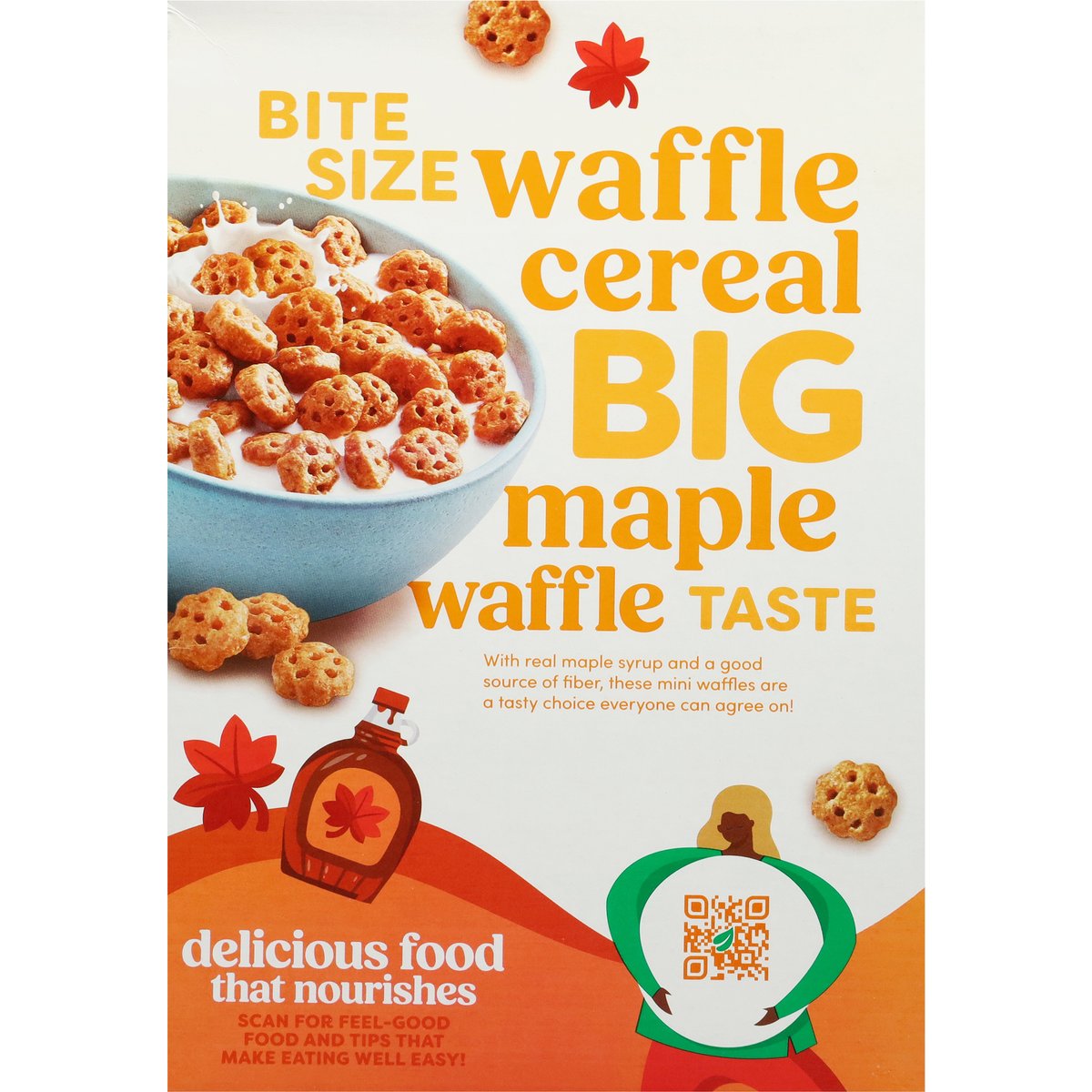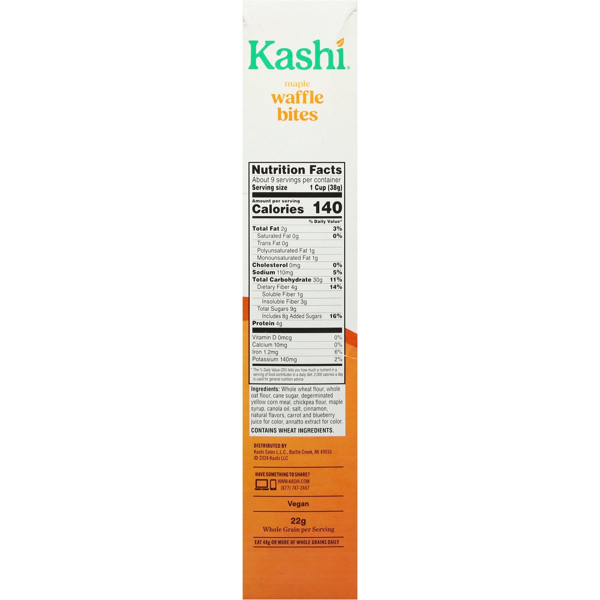 Bite-size, crispy waffle cereal with a touch of maple syrup. No artificial flavors. Vegan. 22 g whole grain per serving. Eat 48g or more of whole grains daily. Non-GMO Project verified. nongmoproject.org. Same food you love! Now with over 25% more*. Made with a touch of real maple syrup. Contents may settle. Product is sold by weight not volume. Bite size waffle cereal. Big maple waffle. Taste. With real maple syrup and a good source of fiber, these mini waffles are a tasty choice everyone can agree on! Delicious food that nourishes. *Compared to Kashi maple waffle bites 9.5 oz box. www.kashi.com. how2recycle.info. Scan for feel-good food and tips that make eating well easy! Have something to share? www.kashi.com. Certified 100% recycled paperboard.