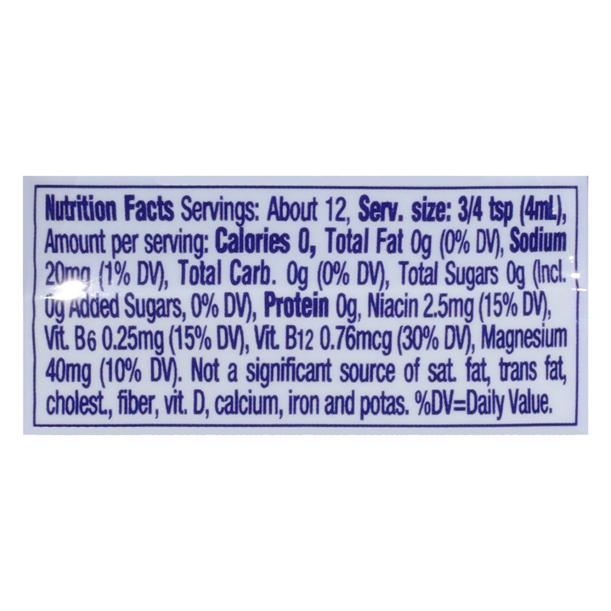 Natural flavor with other natural flavors. 0 calories per 3/4 tsp. Magnesium & B Vitamins. Good source of magnesium. Good source of B vitamins 3,6 & 12. Chill, your way. One squeeze per 12 fl oz. Protect from extreme temperatures. Always dilute. Helps hydrate when prepared as directed. (800) 431-1002.