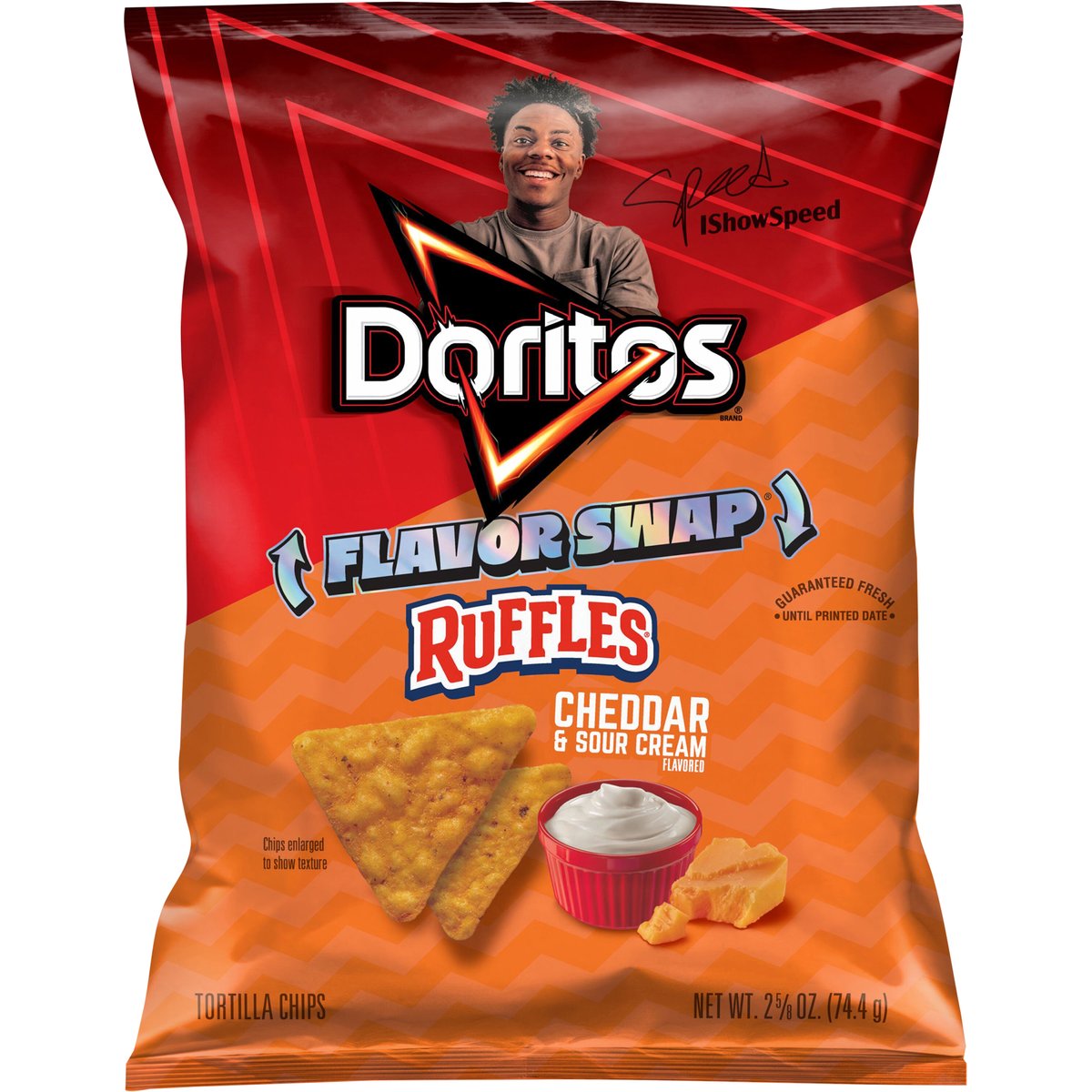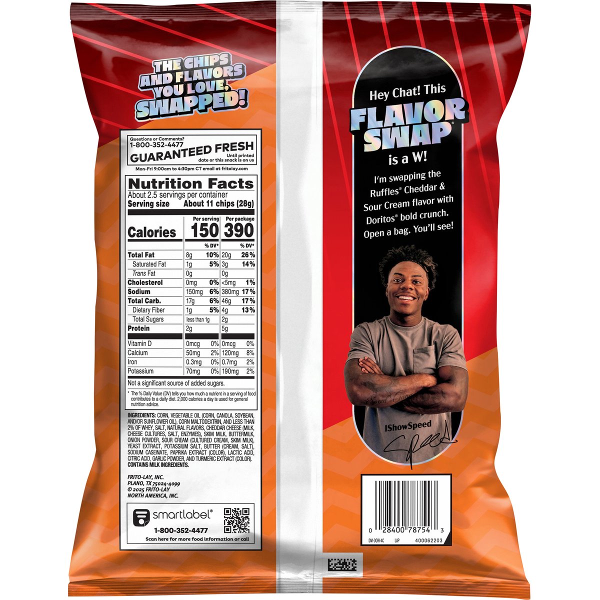 The chips and flavors you love, swapped! Hey chat! This Flavor Swap is a W! I’m swapping the Ruffles Cheddar & Sour Cream flavor with Doritos bold crunch. Open a bag. You’ll see! - IShowSpeed. fritolay.com. SmartLabel: Scan for more food information or call 1-800-352-4477. Questions or comments? 1-800-352-4477 Mon-Fri 9:00am to 4:30pm CT email at fritolay.com. Guaranteed fresh until printed date or this snack is on us.