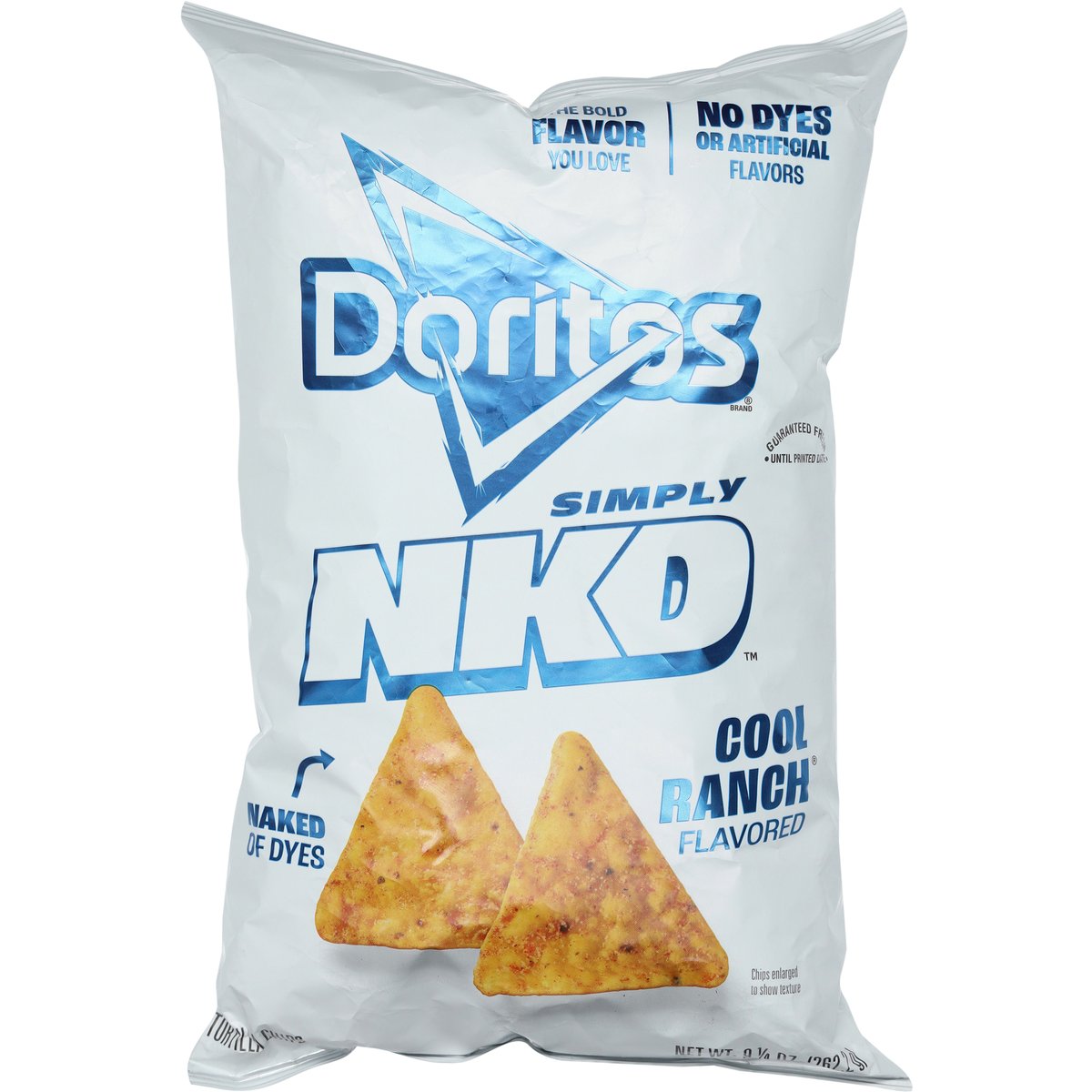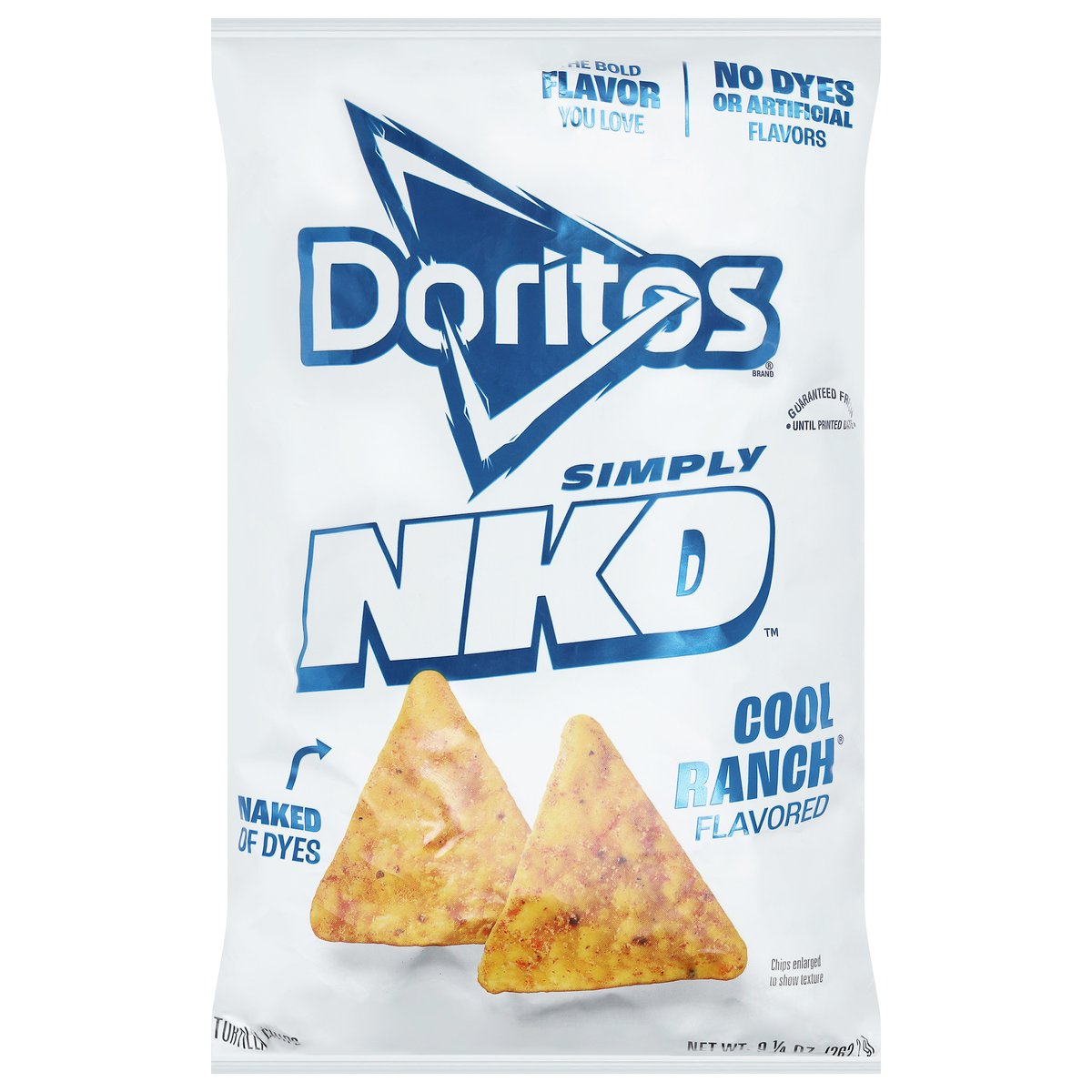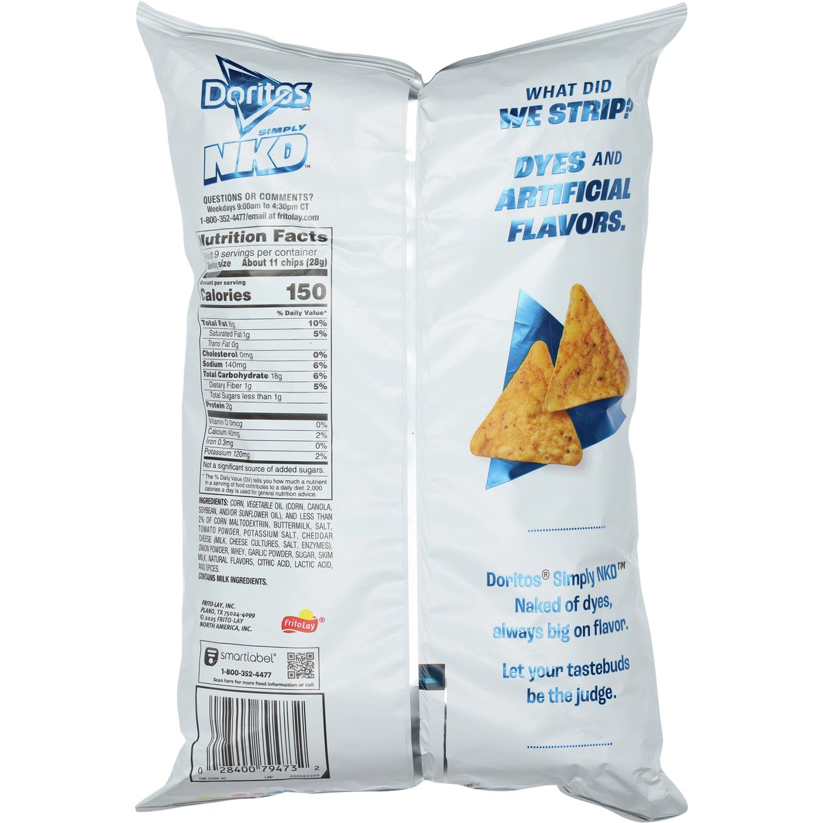The bold flavor you love. No dyes or artificial flavors. Naked of dyes. What did we strip? Dyes and artificial flavors. Doritos Simply NKD: Naked of dyes, always big on flavor. Let your tastebuds be the judge. fritolay.com. SmartLabel: 1-800-352-4477. Scan for more food information or call. Questions or comments? Weekdays 9:00am to 4:30pm CT 1-800-352-4477/email at fritolay.com.