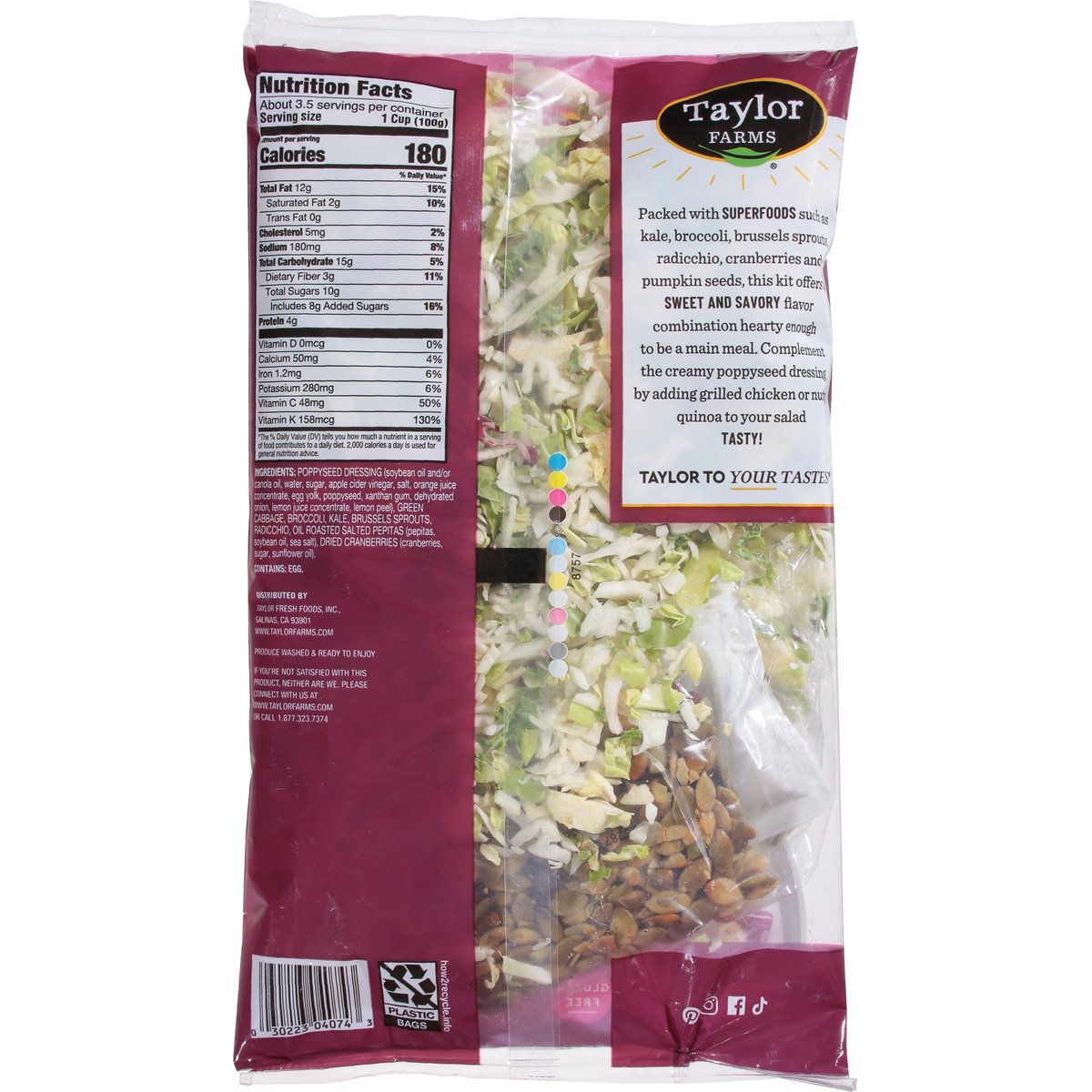 Broccoli, green cabbage, kale, brussels sprouts, pepitas, radicchio, cranberries with creamy poppyseed dressing. Gluten free. Excellent source of vitamins C & K. New look! Contains 6 superfoods. Contains 5 vegetables. Produce washed & ready to enjoy. Packed with superfoods such as kale, broccoli, brussels sprouts, radicchio, cranberries and pumpkin seeds, this kit offers a sweet and savory flavor combination hearty enough to be a main meal. Complement the creamy poppyseed dressing by adding grilled chicken or nutty quinoa to your salad tasty! Taylor to your tastes. If you're not satisfied with this product, neither are we. Please connect with us at www.taylorfarms.com or 1.877.323.7374. www.taylorfarms.com. how2recycle.info. Pinterest. Instagram. Facebook. TikTok. 1.877.323.7374.