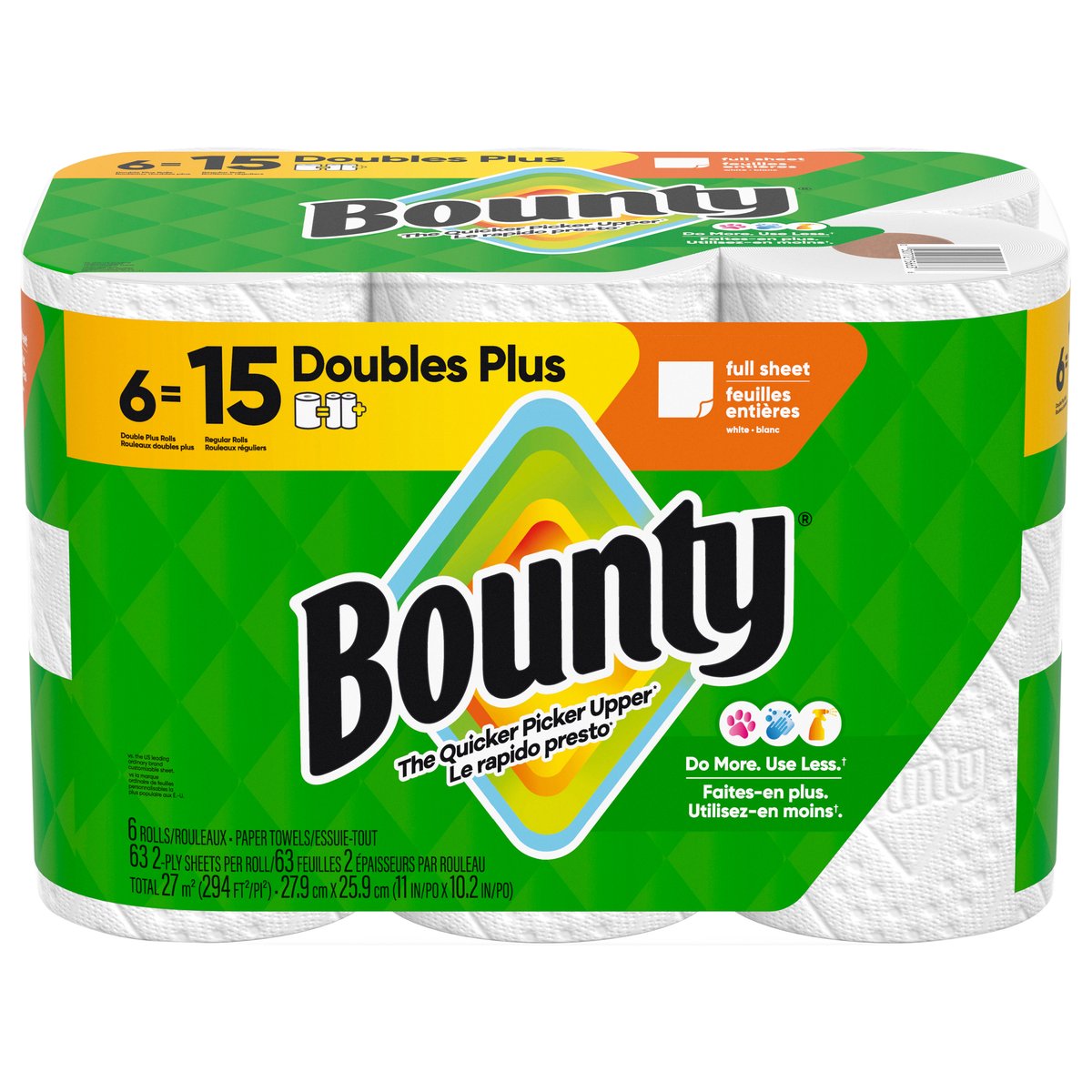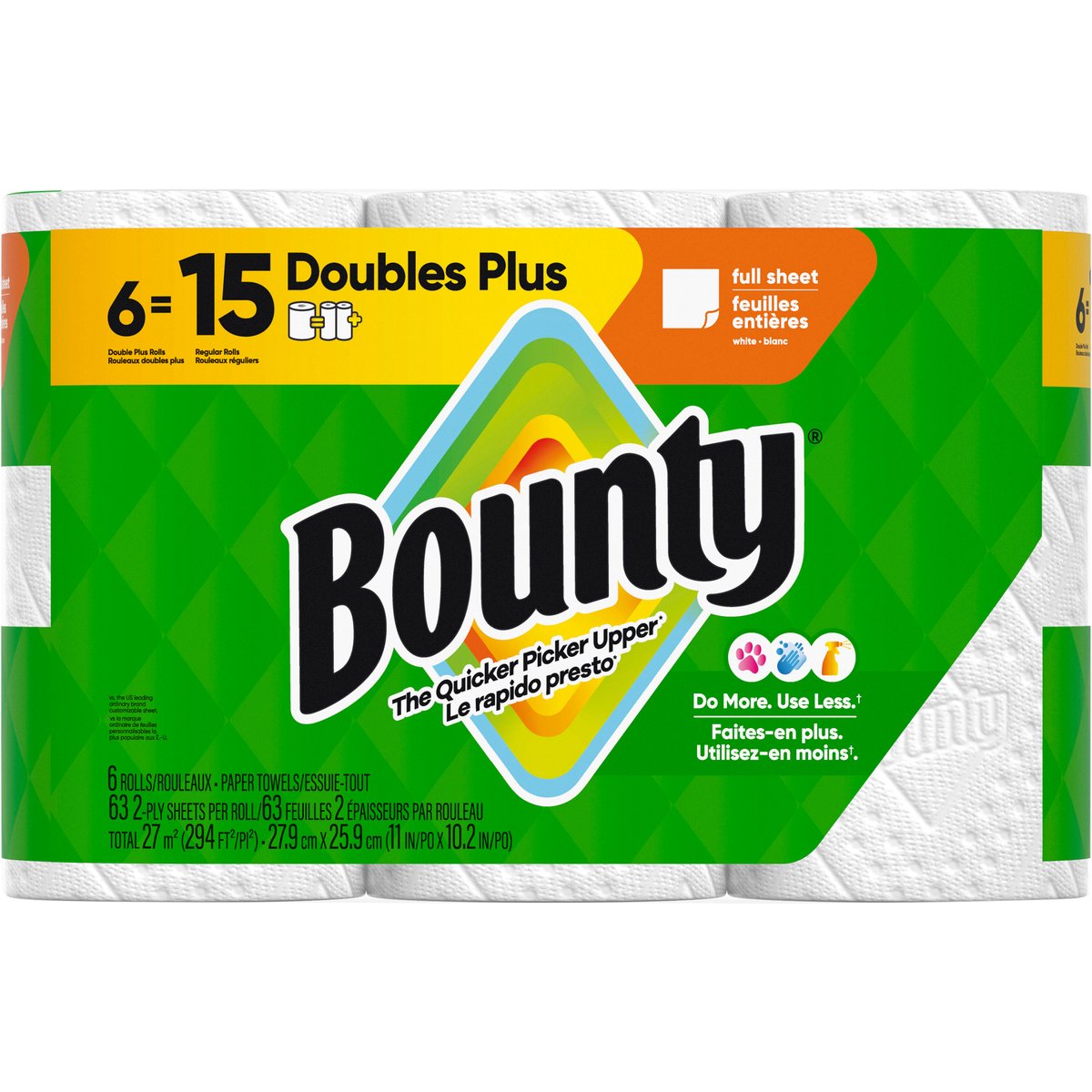 27.9 cm x 25.9 cm (11 in x 10.2 in). Total 27 sq m (294 sq ft). 6 double plus rolls = 15 regular rolls. Full sheet. White. The quicker picker upper*. Do more. Use less (a). (a) vs. the US leading ordinary brand customizable sheet. * vs. leading ordinary brand. www.pg.com. www.BountyTowels.com. Questions? Comments? Call 1-800-9-Bounty. www.BountyTowels.com. Protect. Grow. Restore. Learn how Bounty helps to protect, grow and restore forests at bountytowels.com/learnmore. Made in the USA from domestic and imported materials.