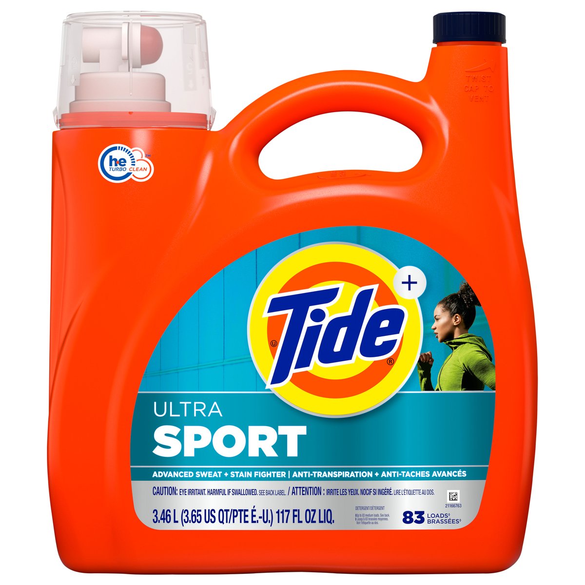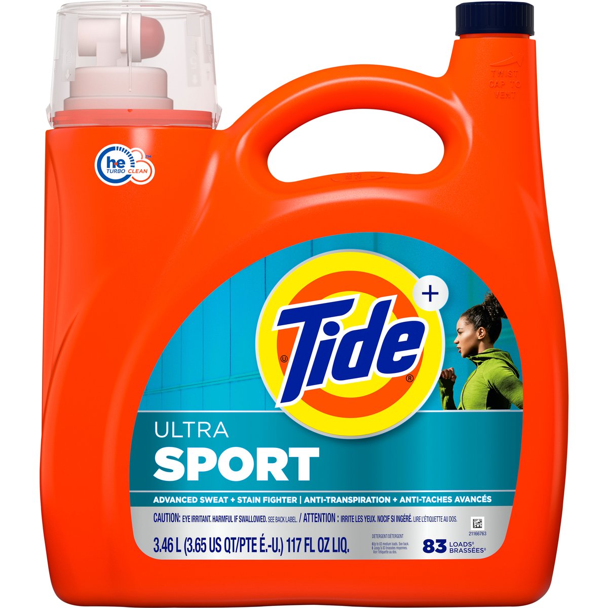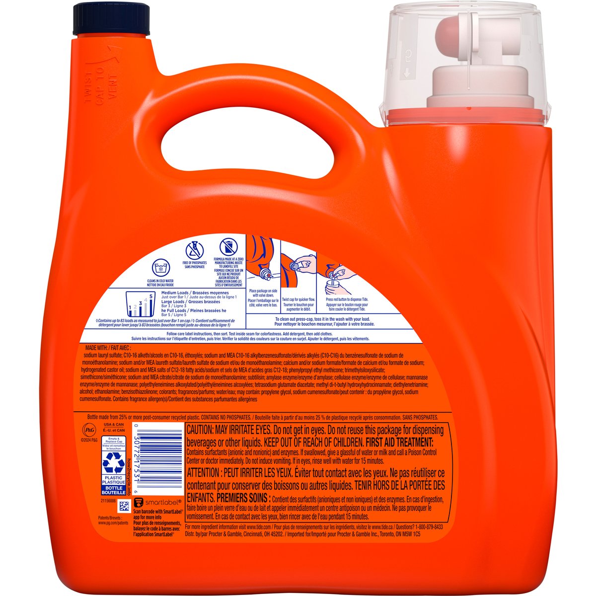 83 loads (a). (a) Up to 83 medium loads. See back. (a) Contains up to 83 loads as measured to just over Bar 1 on cap. Advanced sweat + stain fighter. Cleans in cold water. Free of phosphates. Contains no phosphates. HE. Turbo clean. how2recycle.info. www.tide.com. SmartLabel. Scan barcode with SmartLabel app for more info. For more ingredient information visit www.tide.com. Questions? 1-800-879-8433. Bottle made from 25% or more post-consumer recycled plastic. Formula made at a zero manufacturing waste to landfill site.