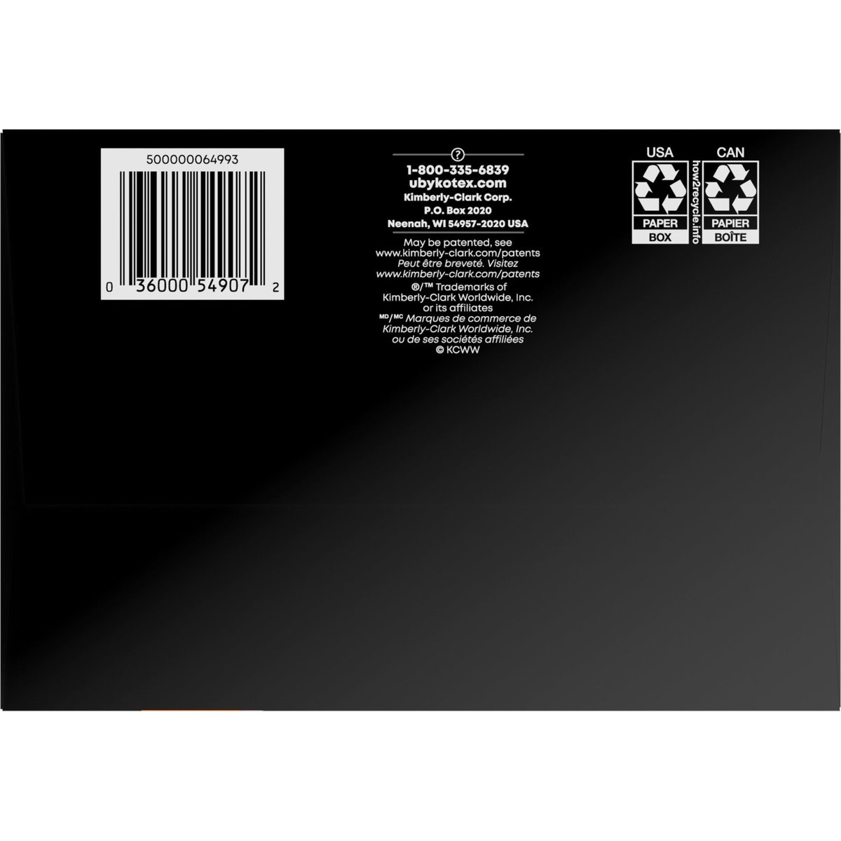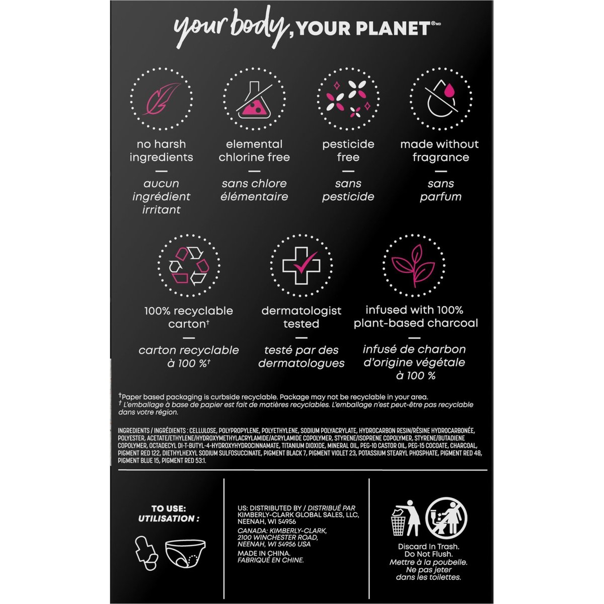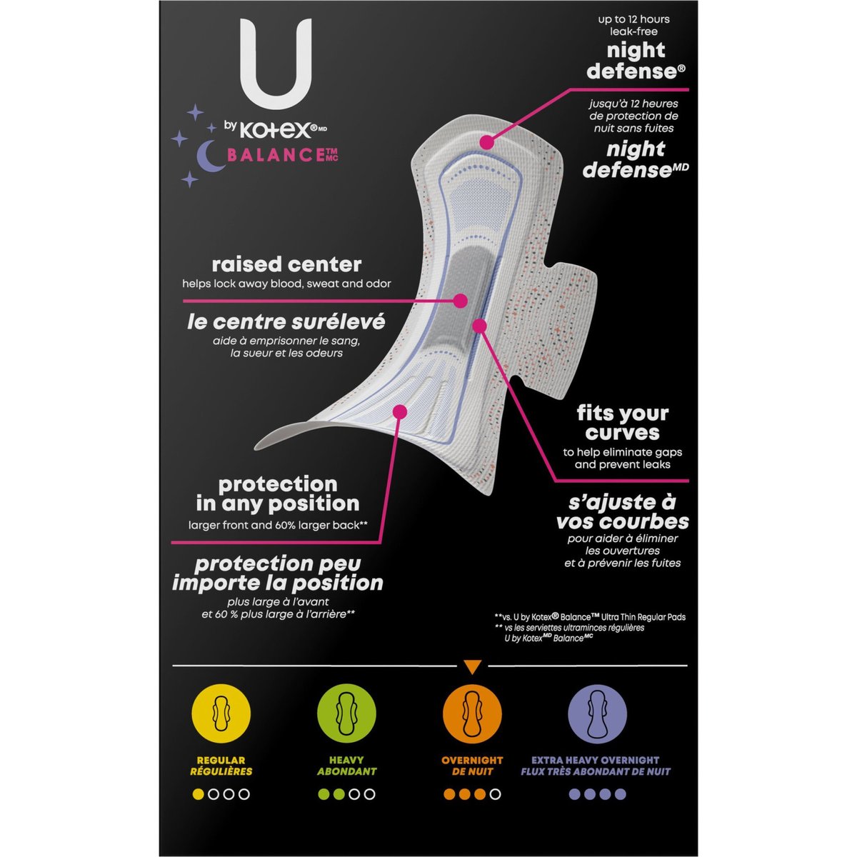 Previously anciennement. Trusted protection. Cushioncore with charcoal helps stop odor. Up to 12 hrs night defense. 60% larger back (vs. U by Kotex balance regular pad) plus large. Up to 12 hrs night defense. Cusioncore absorbs instantly for up to 100% leakfree. Helps stop odor infused with 100% plant-based charcoal. Protection in any position larger front and 60% larger back (vs U by Kotex Balance Regular Pad). No harsh ingredients. Elemental chlorine free. Pesticide free. Made without fragrance. Dermatologist tested. how2recycle.info. ubykotex.com. Questions? 1-800-335-6839 ubykotex.com. Consumer Services, Kimberly-Clark Corp., P.O. Box 2020, Neenah, WI 54957-2020 USA. 100% Recyclable carton (paper based packaging is curbside recyclable. Package may not be recyclable in you area). Made in the USA from domestic and imported material.