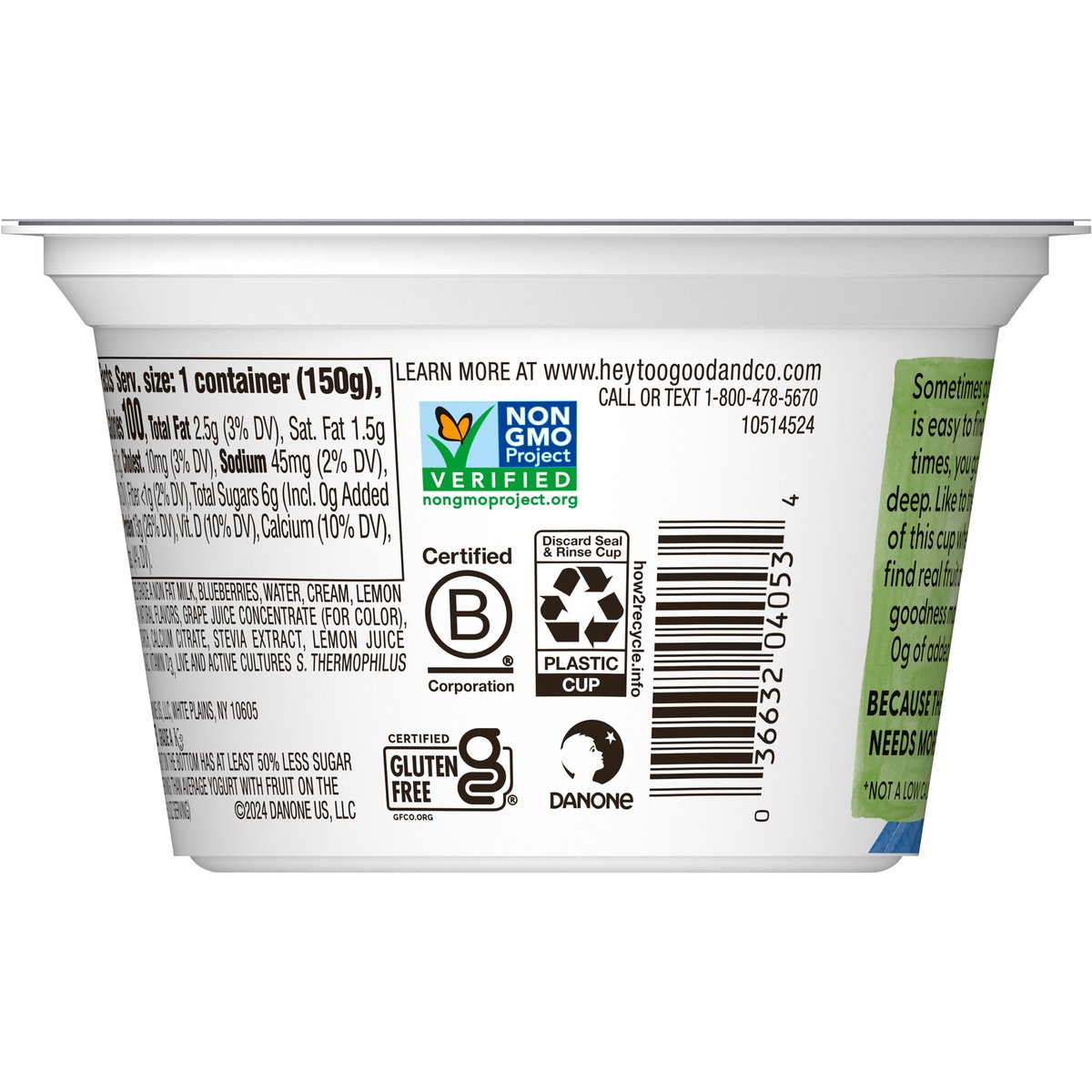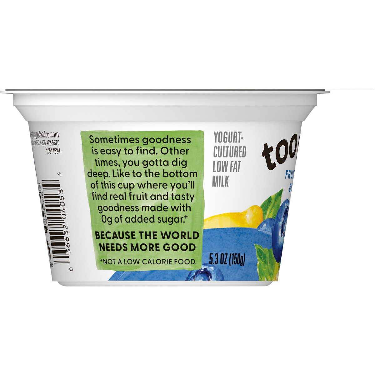 Yogurt-cultured low fat milk. Certified gluten free. 50% less sugar*. * Than average yogurt with fruit on the bottom. * Too Good & Co. Fruit on the Bottom has at least 50% less sugar {6-7 g per 5.3 oz serving} than average yogurt with fruit on the bottom {16 g per 5.3 oz serving}. Non-GMO Project verified. nongmoproject.org. Fruit on the bottom. No artificial sweeteners. Sometimes goodness is easy to find. Other times, you gotta dig deep. Like to the bottom of this cup where you’ll find real fruit and tasty goodness made with 0 g of added sugar*. Because the world needs more good. * Not a low calorie food. Grade A. www.heytoogoodandco.com. how2recycle.info. Learn more at www.heytoogoodandco.com. Call or text 1-800-478-5670. Certified B Corporation.