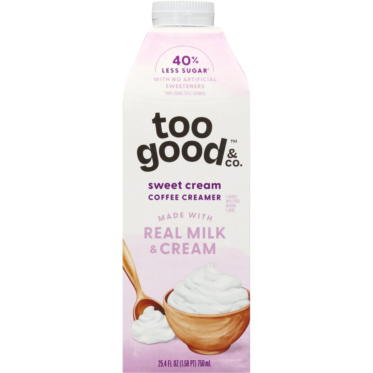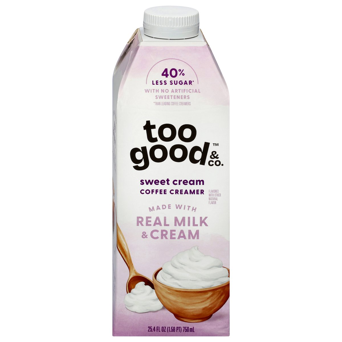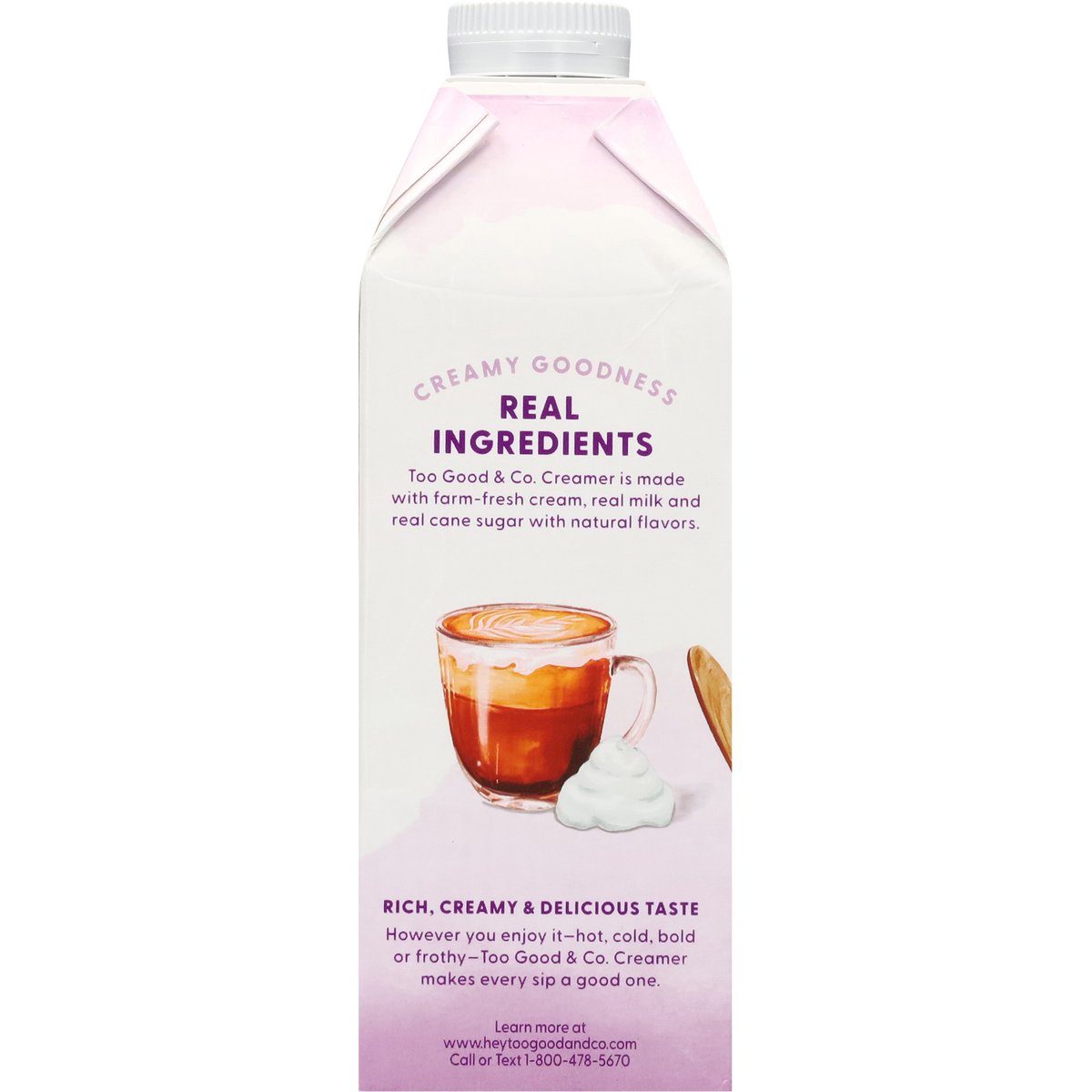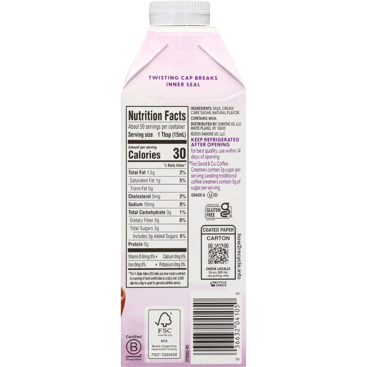 Flavored with other natural flavor. Certified gluten free. gfco.org. 40% less sugar* with no artificial sweeteners. * Than leading coffee creamers. * Too Good & Co. Coffee Creamers contain 3 g sugar per serving; Leading traditional coffee creamers contain 5 g of sugar per serving. Goodness you can trust. 3g of sugar and real tasty and ingredients in every sip. No artificial sweeteners. No added gums or oils. No artificial flavors. No preservatives. Because the world needs more good. Creamy goodness. Real ingredients. Too Good & Co. Creamer is made with farm-fresh cream, real milk and real cane sugar with natural flavors. Rich, creamy & delicious taste. However you enjoy it-hot, cold, bold or frothy-too good & co. Creamer makes every sip a good one. Grade A. www.heytoogoodandco.com. how2recycle.info. Scan QR for recycling info. Learn more at www.heytoogoodandco.com. Call or text 1-800-478-5670. Certified B Corporation. FSC: Mix - Board | Supporting responsible forestry. www.fsc.org.