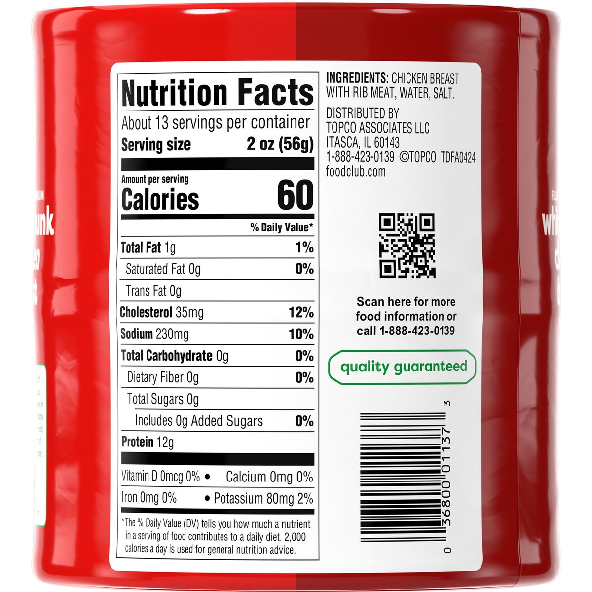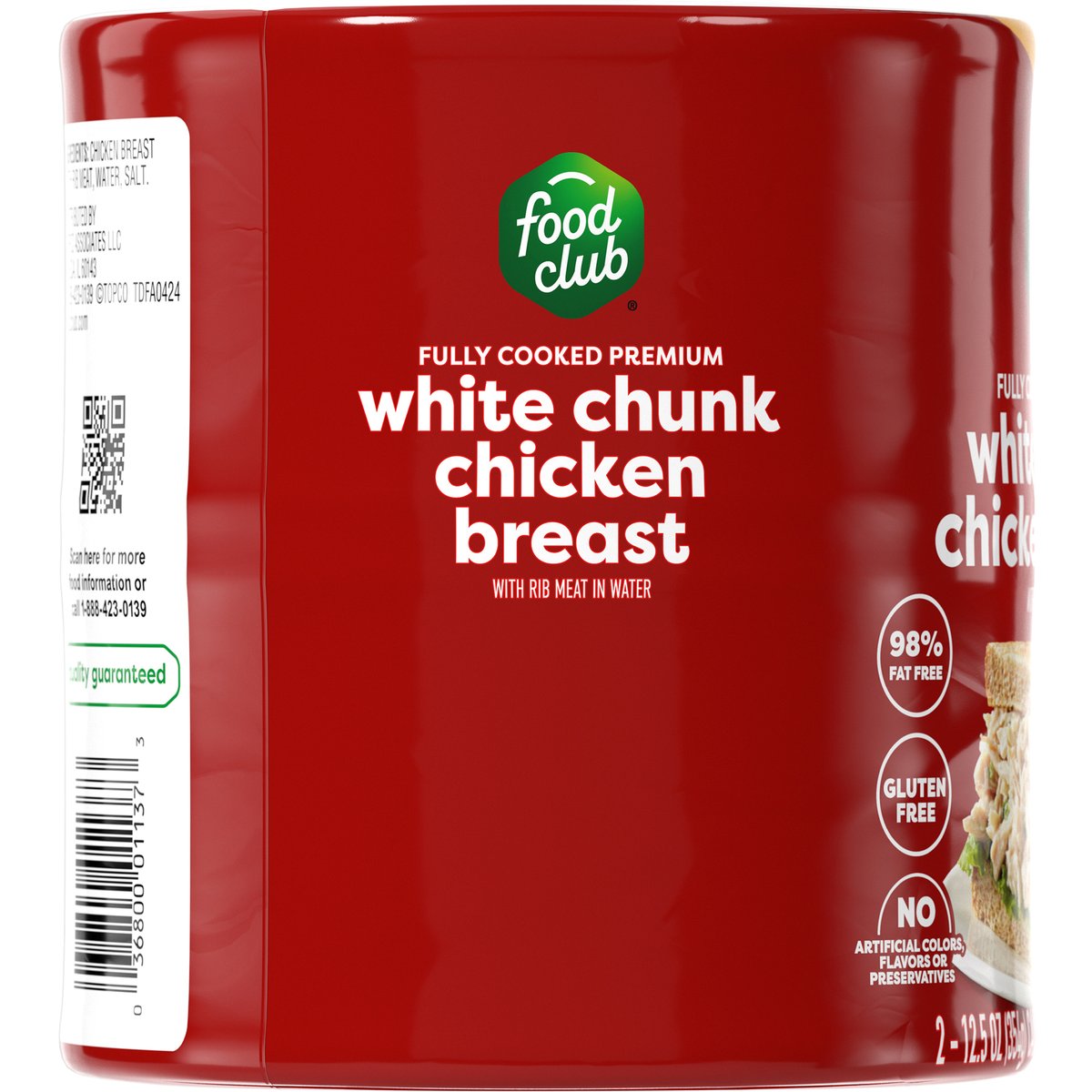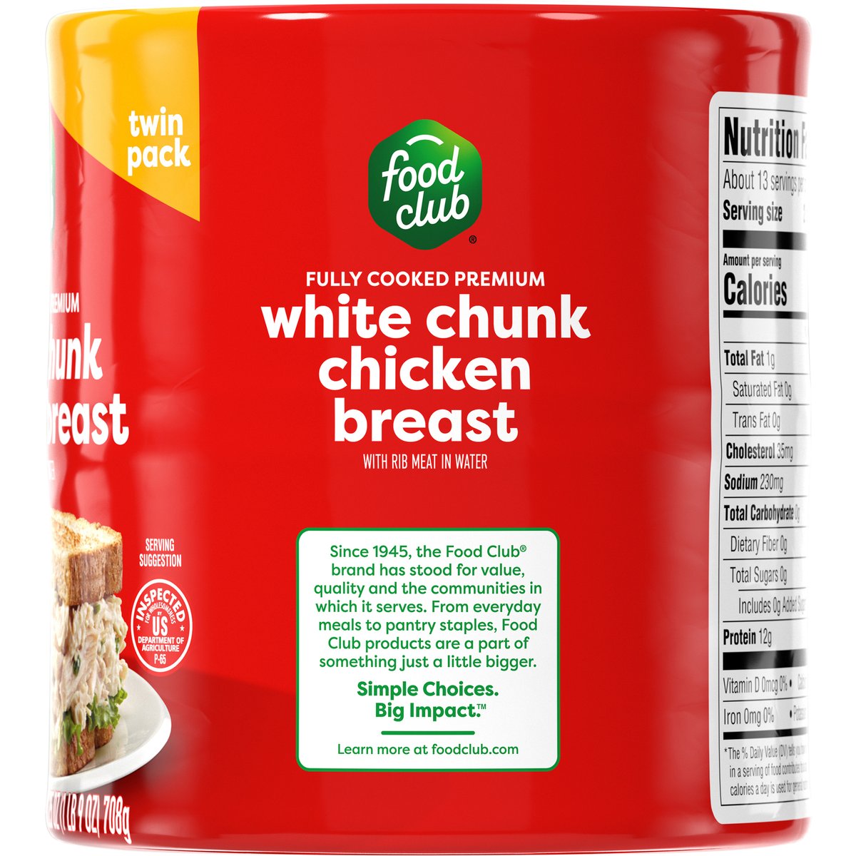 Fully cooked premium white chunk chicken breast with rib meat in water. No artificial colors, flavors or preservatives. Gluten free. 98% fat free. Since 1945, the Food Club brand has stood for value, quality and the communities in which it serves. From everyday meals to pantry staples, Food Club products are a part of something just a little bigger. Simple choices. Big impact. Quality guaranteed. Inspected for wholesomeness by U.S. Department of Agriculture. foodclub.com. Scan for more food information or call 1-888-423-0139. 1-888-423-0139. Learn more at foodclub.com.