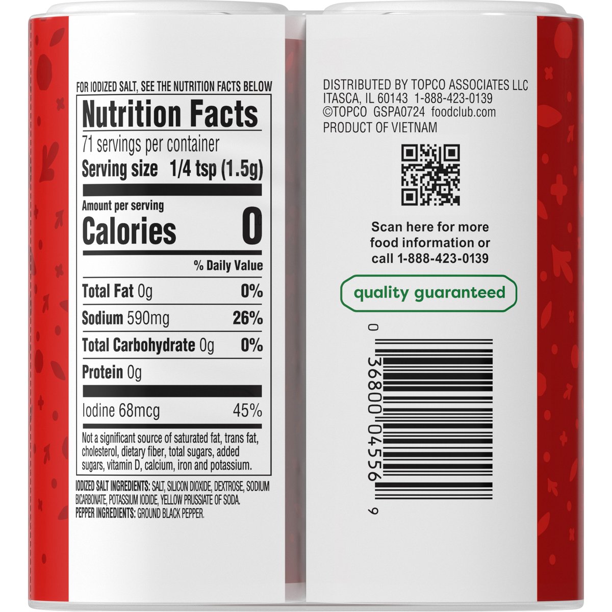 Iodized salt & pepper. No artificial flavors or preservatives. This salt supplies iodide, a necessary nutrient. For Iodized Salt see the nutrition facts below. Quality guaranteed. foodclub.com. Scan for more food information or call 1-888-423-0139. 1-888-423-0139. Product of Vietnam.