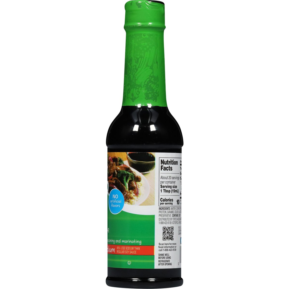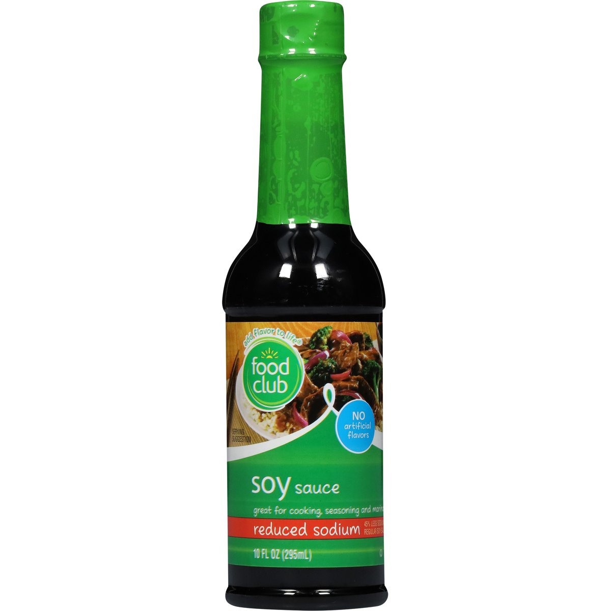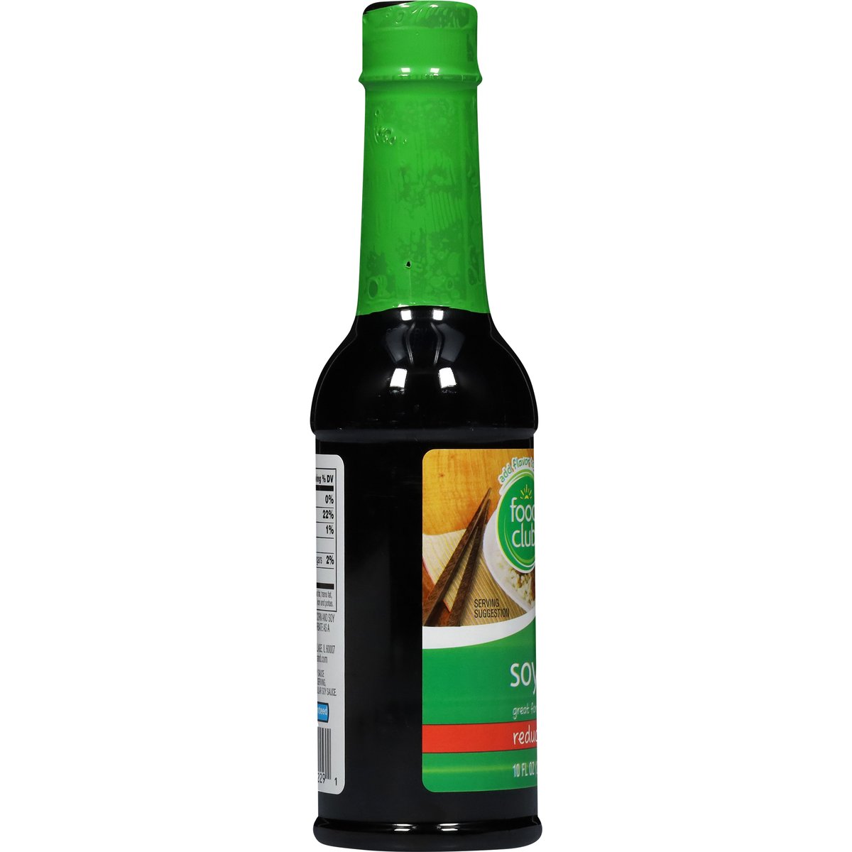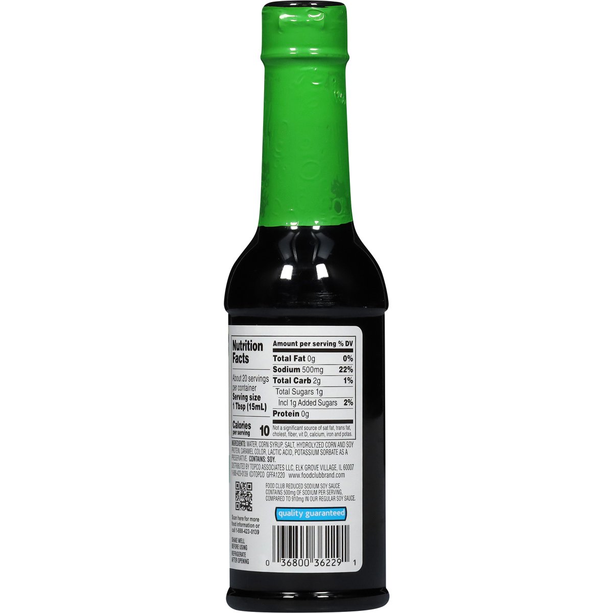 No artificial flavors. Reduced sodium. 45% less sodium than regular soy sauce. Food Club reduced sodium soy sauce contains 500 mg of sodium per serving compared to 910 mg in our regular soy sauce. Add flavor to life. Great for cooking, seasoning & marinating. Quality guaranteed. www.foodclubbrand.com. Scan for more food information or call 1-888-423-0139. 1-888-423-0139.