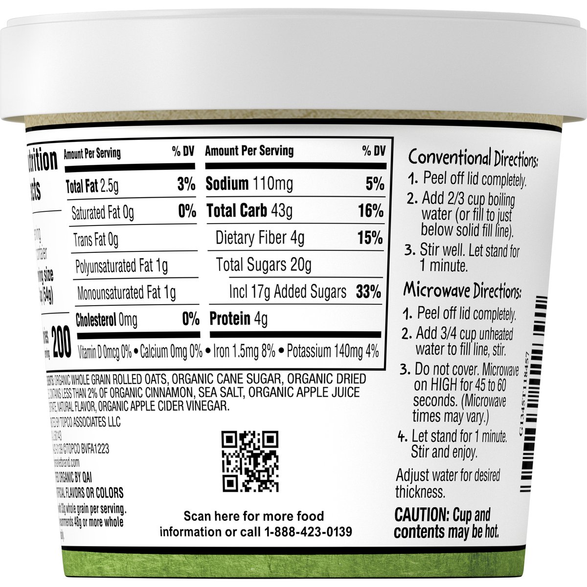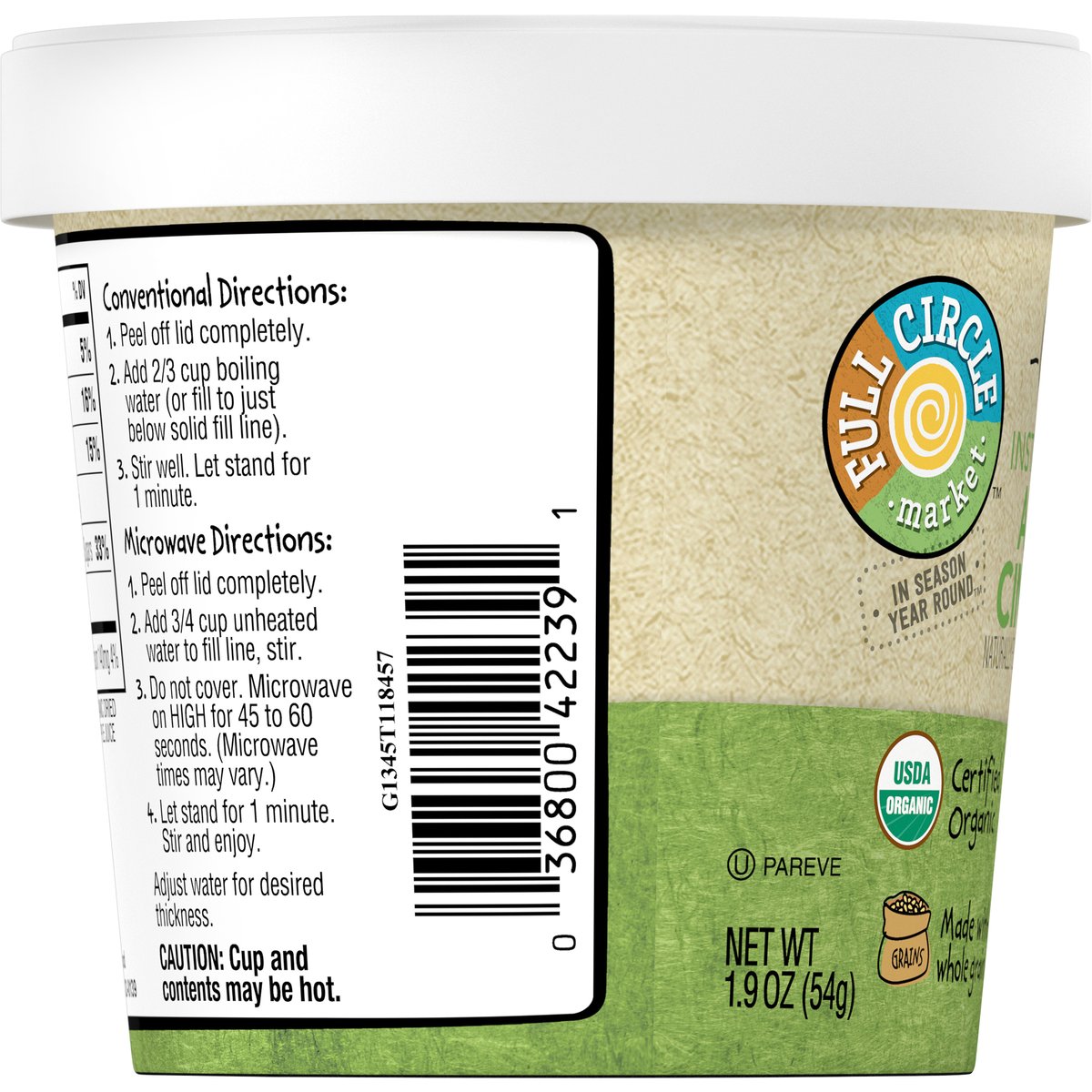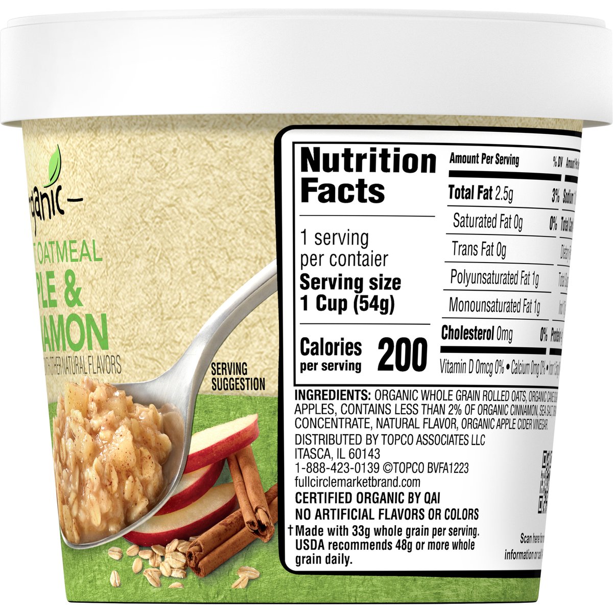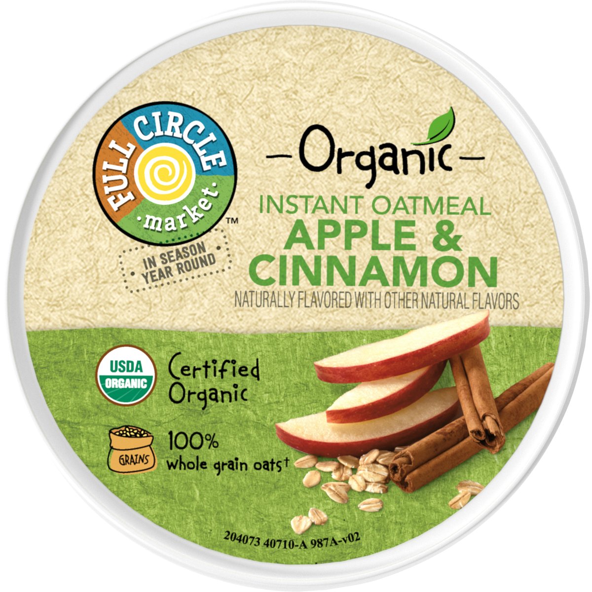 Naturally flavored with other natural flavors. No artificial flavors or colors. USDA Organic. Certified Organic. Certified Organic by QAI. Made with whole grain oats (Made with 33 g whole grain per serving. USDA recommends 48 g or more whole grain daily). In season year round. fullcirclemarketbrand.com. Scan for more food information or call 1-888-423-0139. 1-888-423-0139.