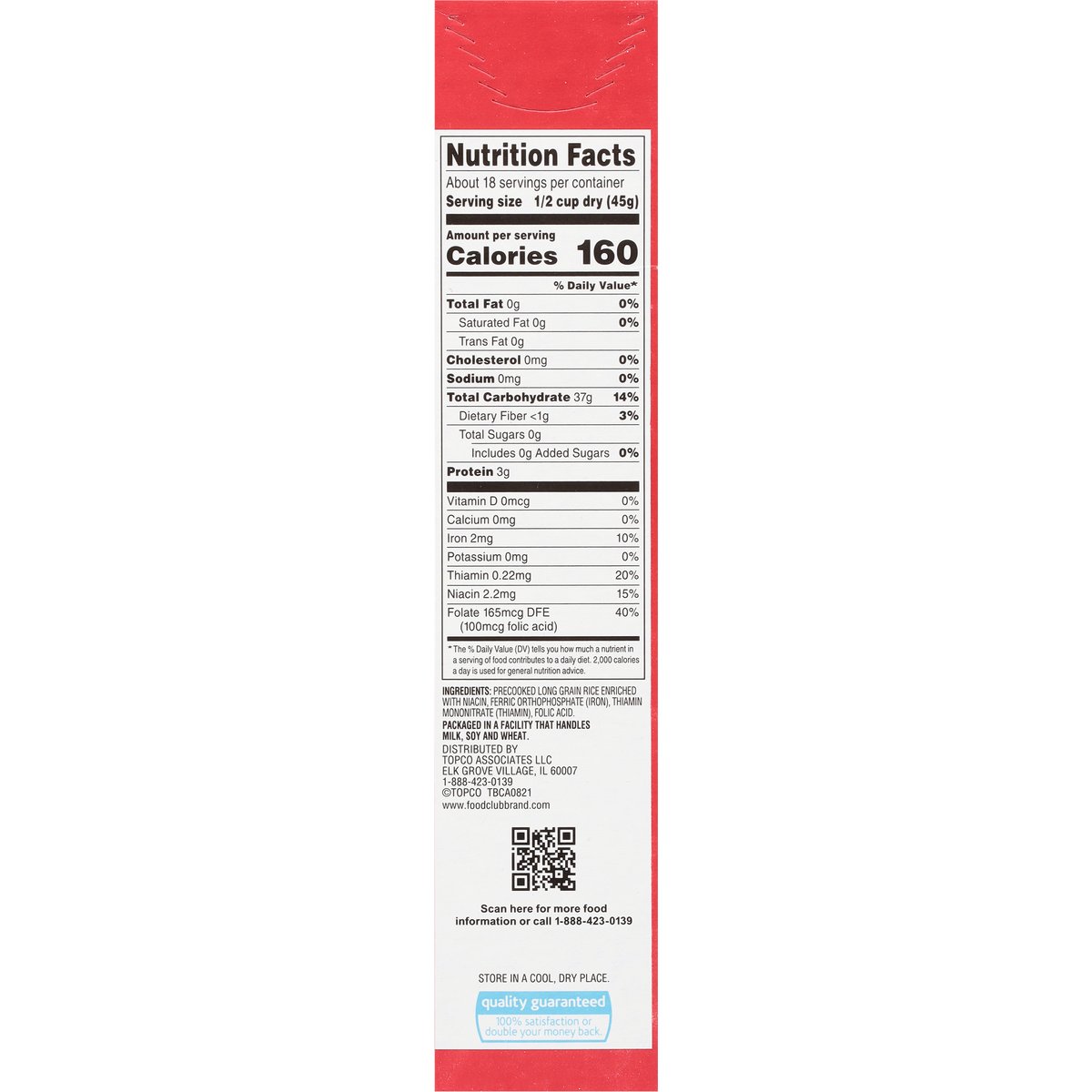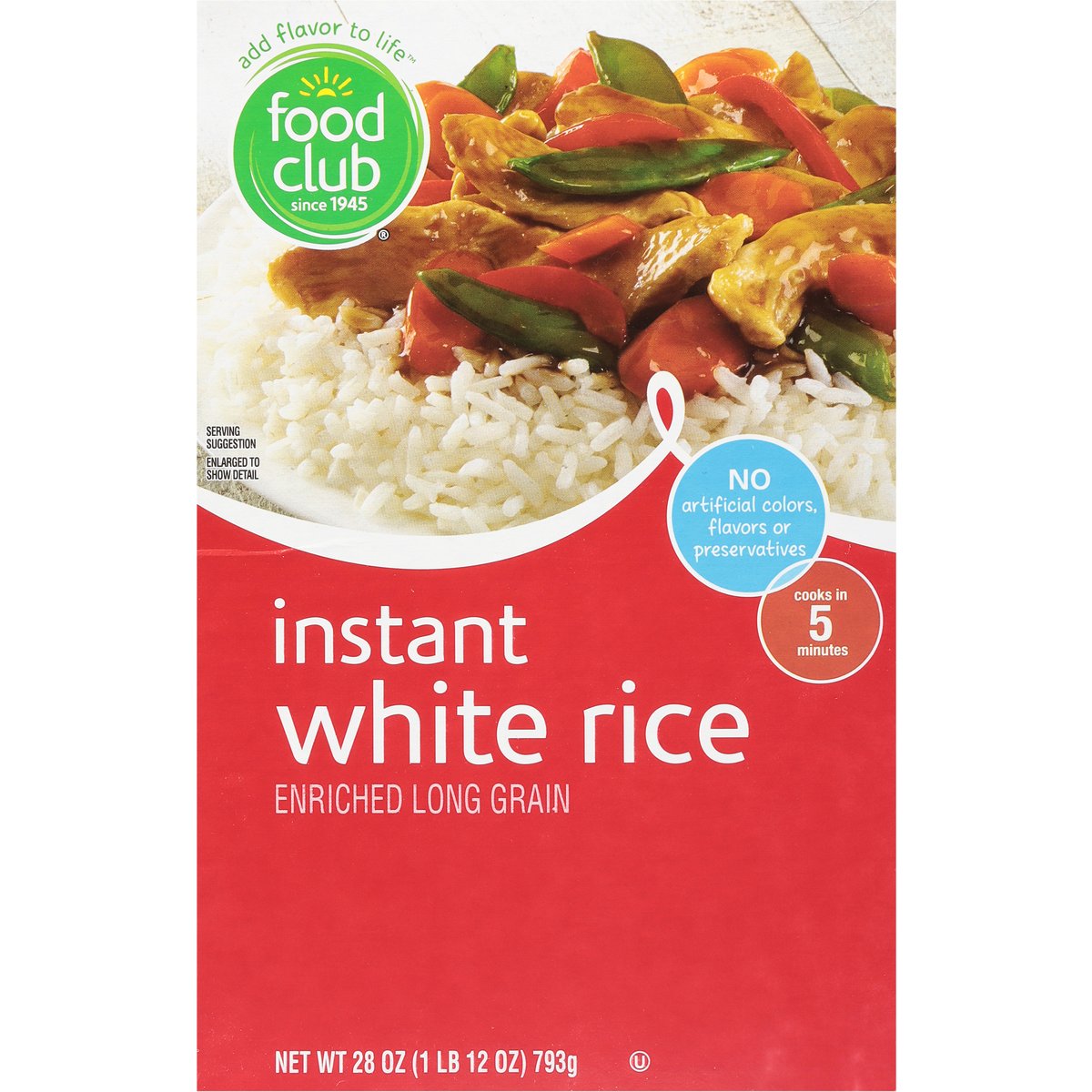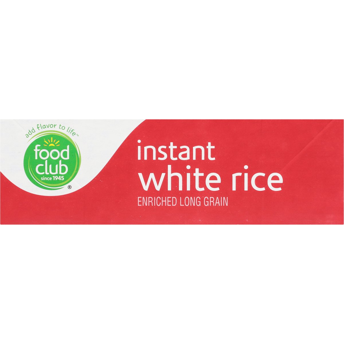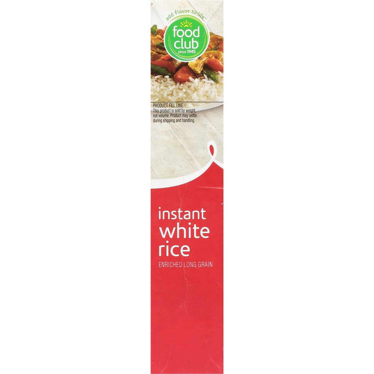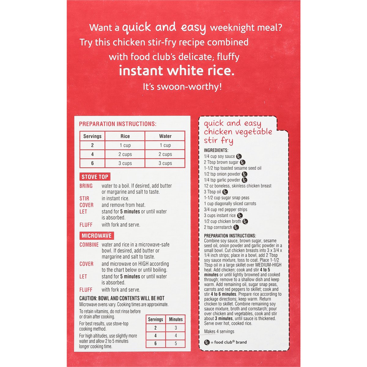 Enriched long grain. No artificial colors, flavors or preservatives. Add flavor to life. Since 1945. Cooks in 5 minutes. Want a quick and easy weeknight meal? Try this chicken stir-fry recipe combined with Food Club's delicate, fluffy instant white rice. It's swoon-worthy! This product is sold by weight not volume. Product may settle during shipping and handling. Quality Guaranteed: 100% satisfaction or double your money back. www.foodclubbrand.com. Scan for more food information or call 1-888-423-0139. Please recycle.
