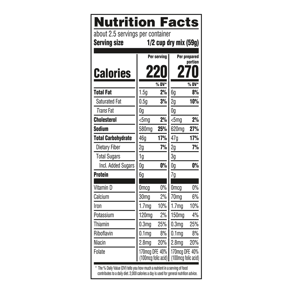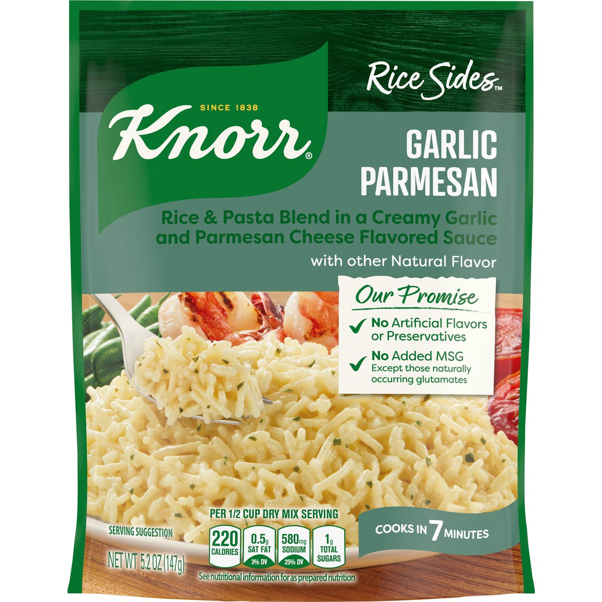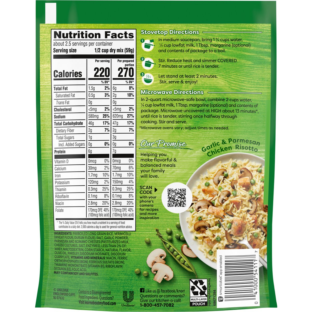 Rice & pasta blend in a creamy garlic and parmesan cheese flavored sauce. With other natural flavors. No artificial flavor or preservatives. Per 1/2 Cup Dry Mix Serving: 220 calories; 0.5 g sat fat (3% DV); 580 mg sodium (25% DV); 1 g total sugars. See nutrition information for as prepared nutrition. Contains a bioengineered food ingredient. Questions? Visit learnaboutmyfood.com. Knorr - Since 1838. Our Promise: No added MSG except those naturally occurring glutamates. Cooks in 7 minutes. Our Promise: Helping you make flavorful & balanced meals your family will love. learnaboutmyfood.com. how2recycle.info. Like us (at) Facebook/knorr. SmartLabel app enabled. Scan code with your phone's camera for recipes and more inspiration. Questions or comments? Give our kitchen a call! 1-800-457-7082.