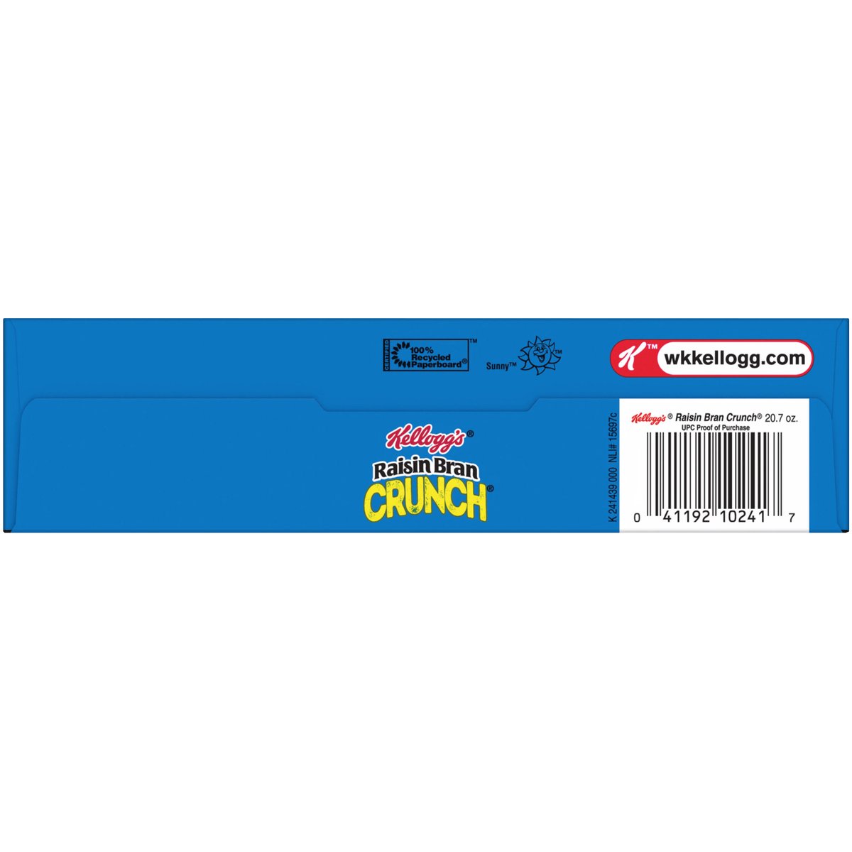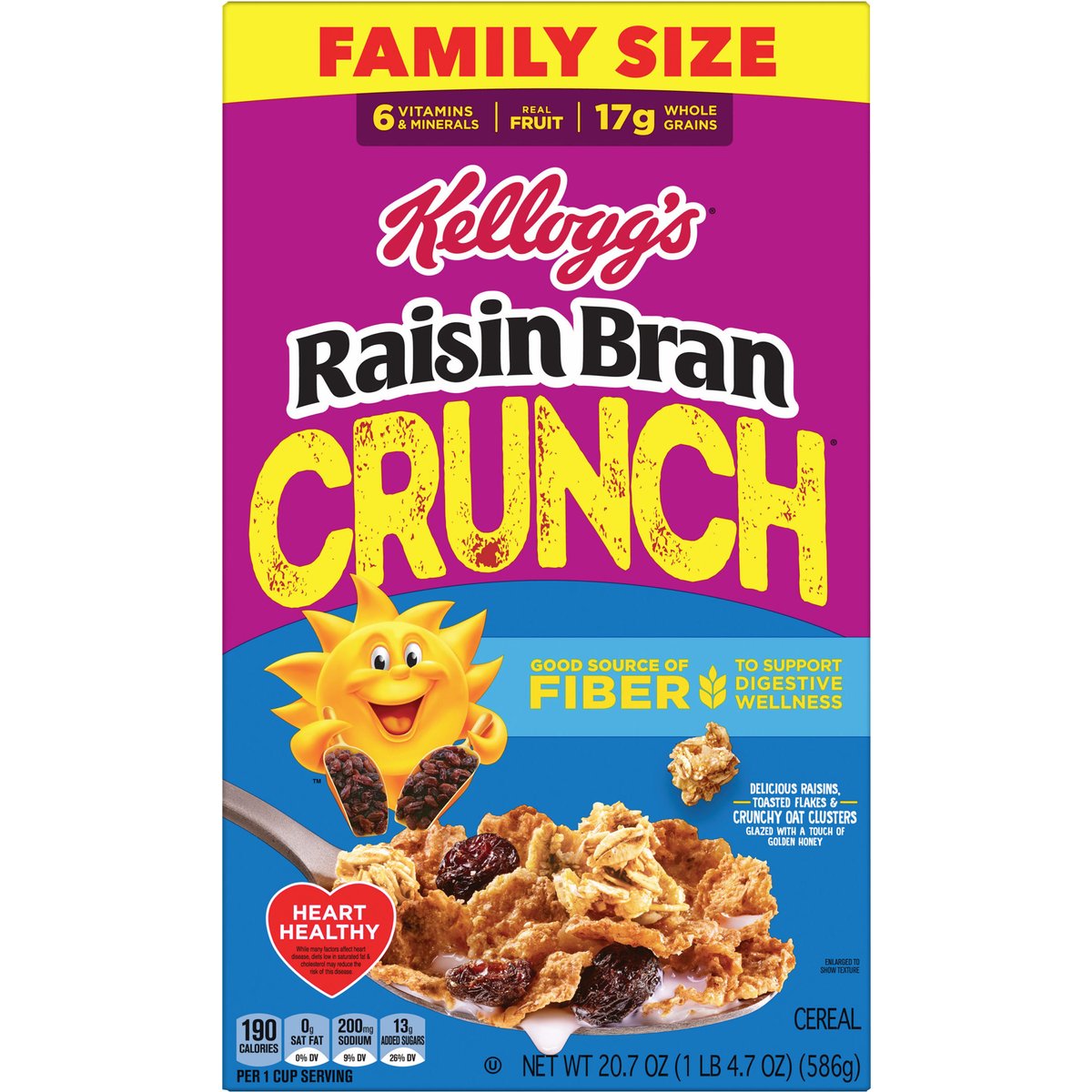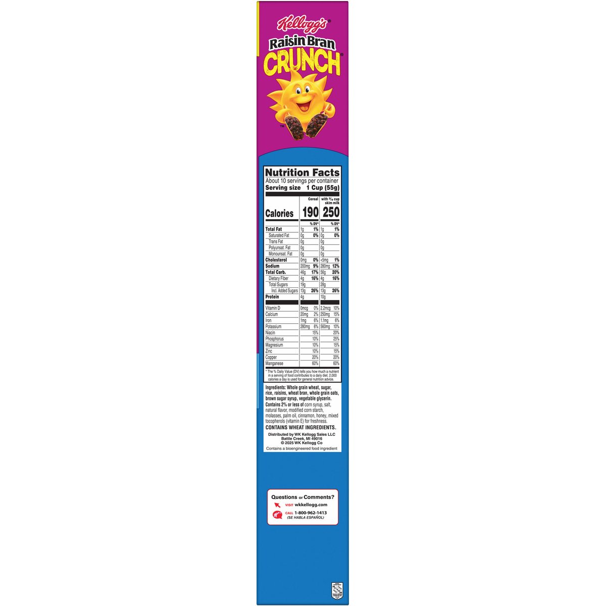 Delicious raisins, toasted flakes & crunchy oat clusters glazed with a touch of golden honey. Per 1 Cup Serving: 190 calories; 0 g sat fat (0% DV); 200 mg sodium (9% DV); 19 g total sugars. Heart Healthy: While many factors affect heart disease, diets low in saturated fat & cholesterol may reduce the risk of this disease. Good Source of Fiber Contains a bioengineered food ingredients. Two scoops! Did you know? Fiber is a super nutrient that helps support digestive health. Kellogg's Raisin Bran Crunch Original is a good source of fiber with a delicious blend of crispy bran flakes & sweet crunchy oat clusters. Fiber helps support digestive health, an important part of overall wellness. Our best in every bite. wkkellogg.com. how2recycle.info. Did you know? Kelloggs.com/didyouknow. Explore all the good stuff you may not know about your favorite cereals at kelloggs.com/didyouknow. Questions or comments? Visit wkkellogg.com. Call 1-800-962-1413. BCTGM: Bakery Confectionery Tobacco Workers & Grain Millers union made. AFL CIO CLC. Certified 100% recycled paperboard.