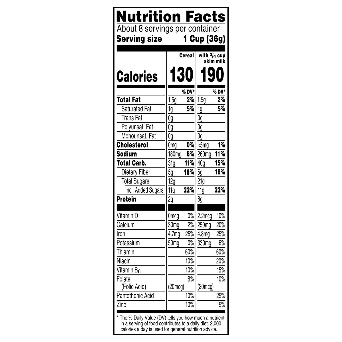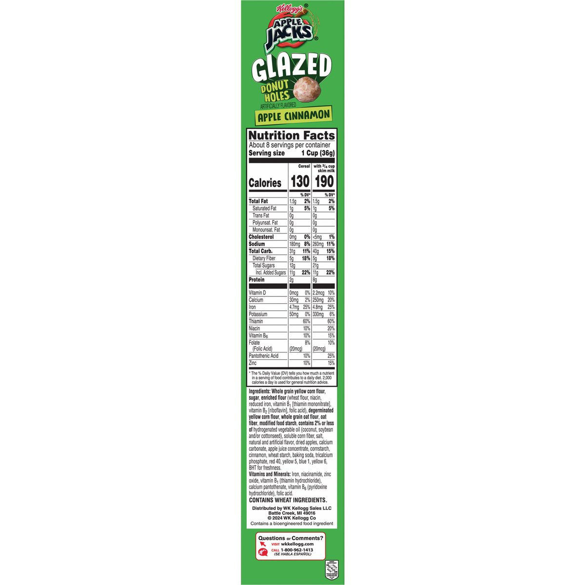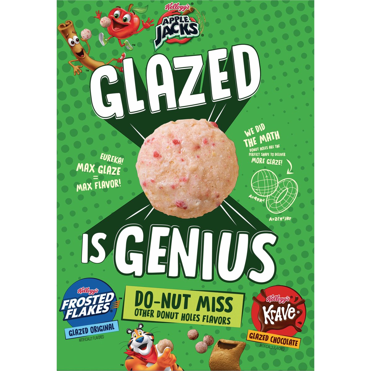 Artificially flavored. Per 1 Cup Serving: 130 calories; 1 g sat fat (5% DV); 180 mg sodium (8% DV); 12 g total sugars. Contains a bioengineered food ingredient. New! Eureka! Max glaze = max flavor! We did the math donut holes are the perfect shape to deliver more glaze! Glazed is genius. wkkellogg.com. how2recycle.info. Questions or comments? Visit wkkellogg.com. Call 1-800-962-1413. BCTGM: Bakery Confectionery Tobacco Workers & Grain Millers union made. AFL CIO CLC Do-not miss other nut holes flavors. Kellogg's Frosted Flakes. Kellogg's Krave Glazed Chocolate.