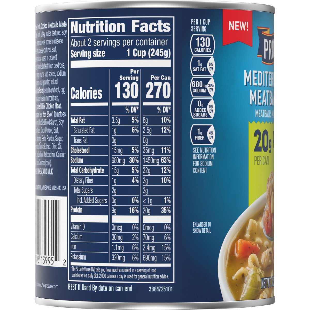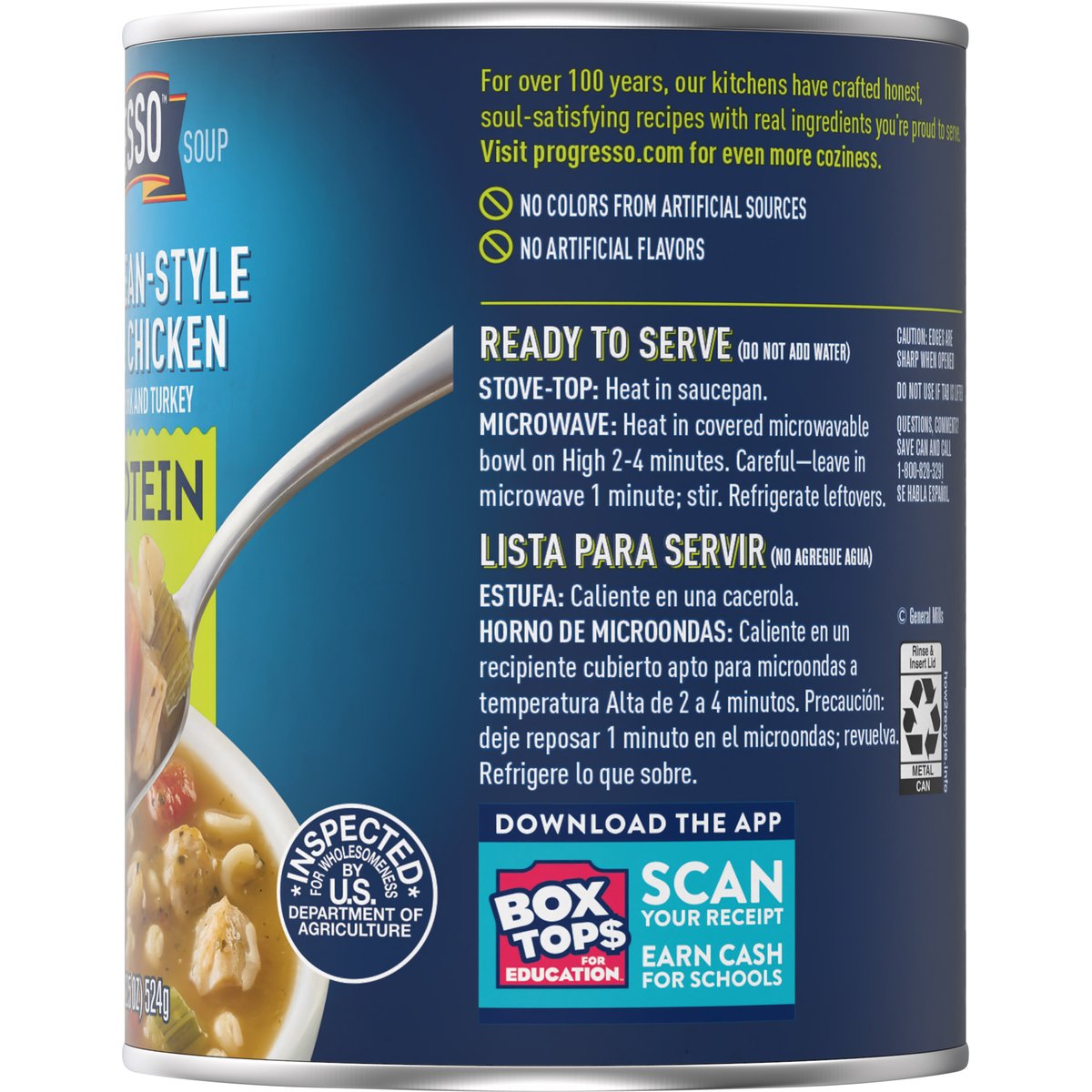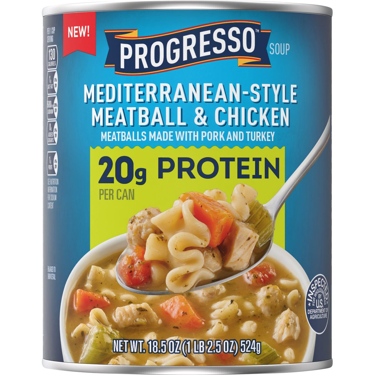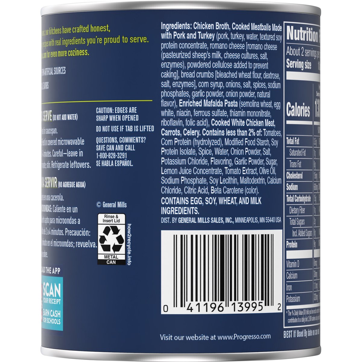 Meatballs made with pork and turkey. No artificial flavors. 20 g protein per can. Per 1 Cup Serving: 130 calories; 1 g sat fat (6% DV); 680 mg sodium (30% DV); 0 g added sugars (0% DV); 1 g fiber (4% DV). See nutrition information for sodium content. New! For over 100 years, our kitchens have crafted honest, soul-satisfying recipes with real ingredients you’re proud to serve. No colors from artificial sources. Inspected for wholesomeness by U.S. Department of Agriculture. how2recycle.info. www.Progresso.com. Visit progresso.com for even more coziness. Questions, Comments? Save can and call 1-800-828-3291. Visit our website at www.Progresso.com. Box Tops for Education: Download the app. Scan your receipt. Earn cash for schools.