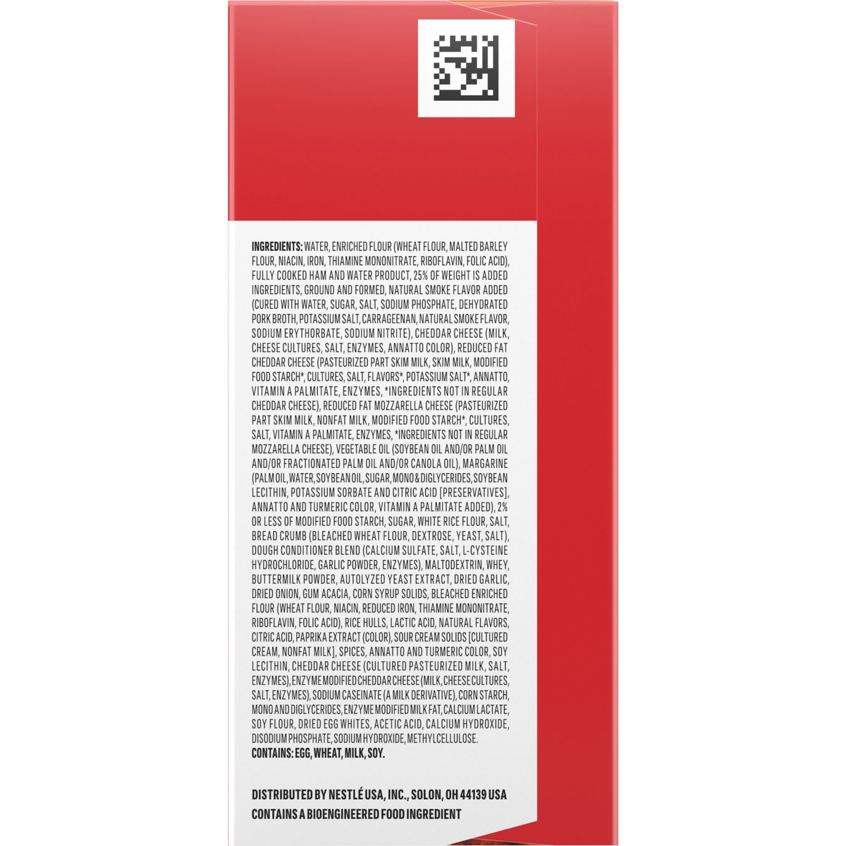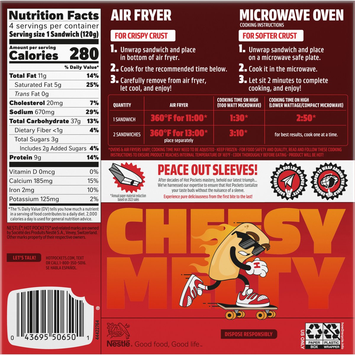 Extra* cheesy ham & cheddar with reduced fat mozzarella and cheddar cheeses and sauce in a crispy. * as compared to hot pockets regular ham & cheddar. Per 1 Sandwich: 280 calories; 5 g sat fat (25% DV); 670 mg sodium (29% DV); 3 g total sugars; 185 mg calcium (15% DV); 2 mg iron (10% DV). See nutrition information for total fat and sodium content. Nestle good food, good life. Let's talk: Hotpockts.com text or call 1-800-350-5016. Contains bioengineered food ingredients. U.S. inspected and passed by Department of Agriculture. Hotpockts.com. how2recycle.info. 1-800-350-5016. Peace out sleeves: After decades of Hot Pockets mastery, behold our latest triumph. We've harnessed our expertise to ensure that Hot Pockets tantalize your taste buds without the nuisance of a sleeve. Experience pure deliciousness from the first bite to the last. Seven over 5,000,000 lbs of paper waste*. *Annual paper material reductions based on 2023 sales.