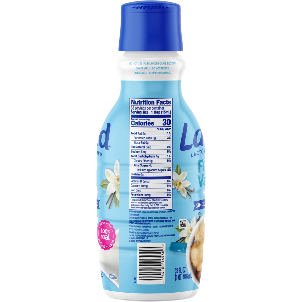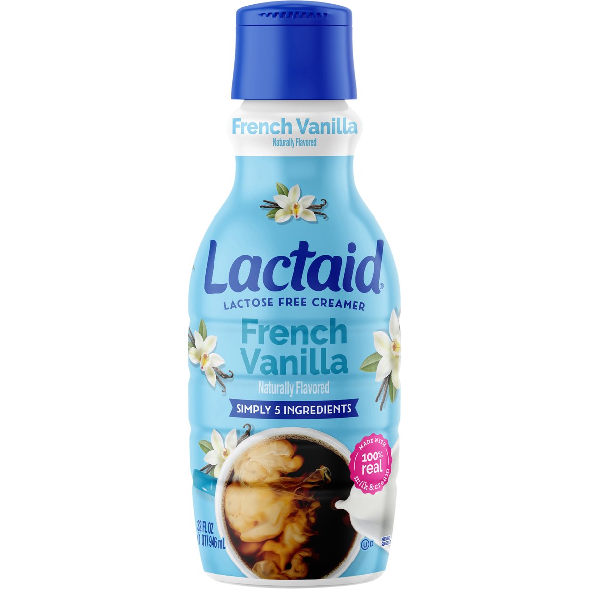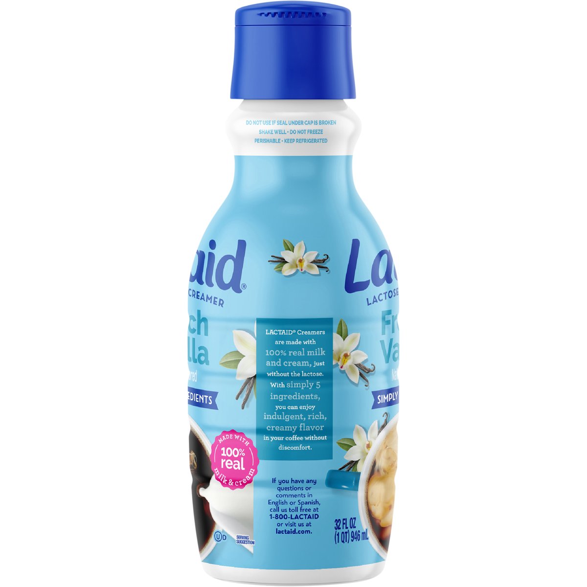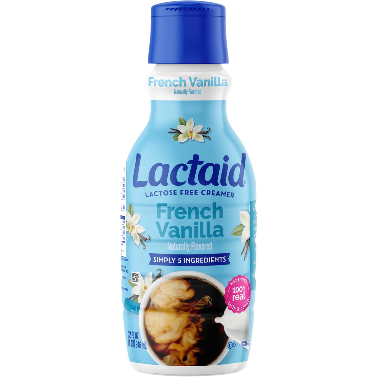 Naturally flavored. Lactose free. Simply 5 ingredients. Ultra-pasteurized. Processed and packaged at plant stamped. Lactaid Creamers are made with 100% real milk and cream, just without the lactose. With simply 5 ingredients, you can enjoy indulgent, rich, creamy flavor in your coffee without discomfort. Grade A. lactaid.com. If you have any questions or comments in English or Spanish, call us toll free at 1-800-Lactaid or visit us at lactaid.com.