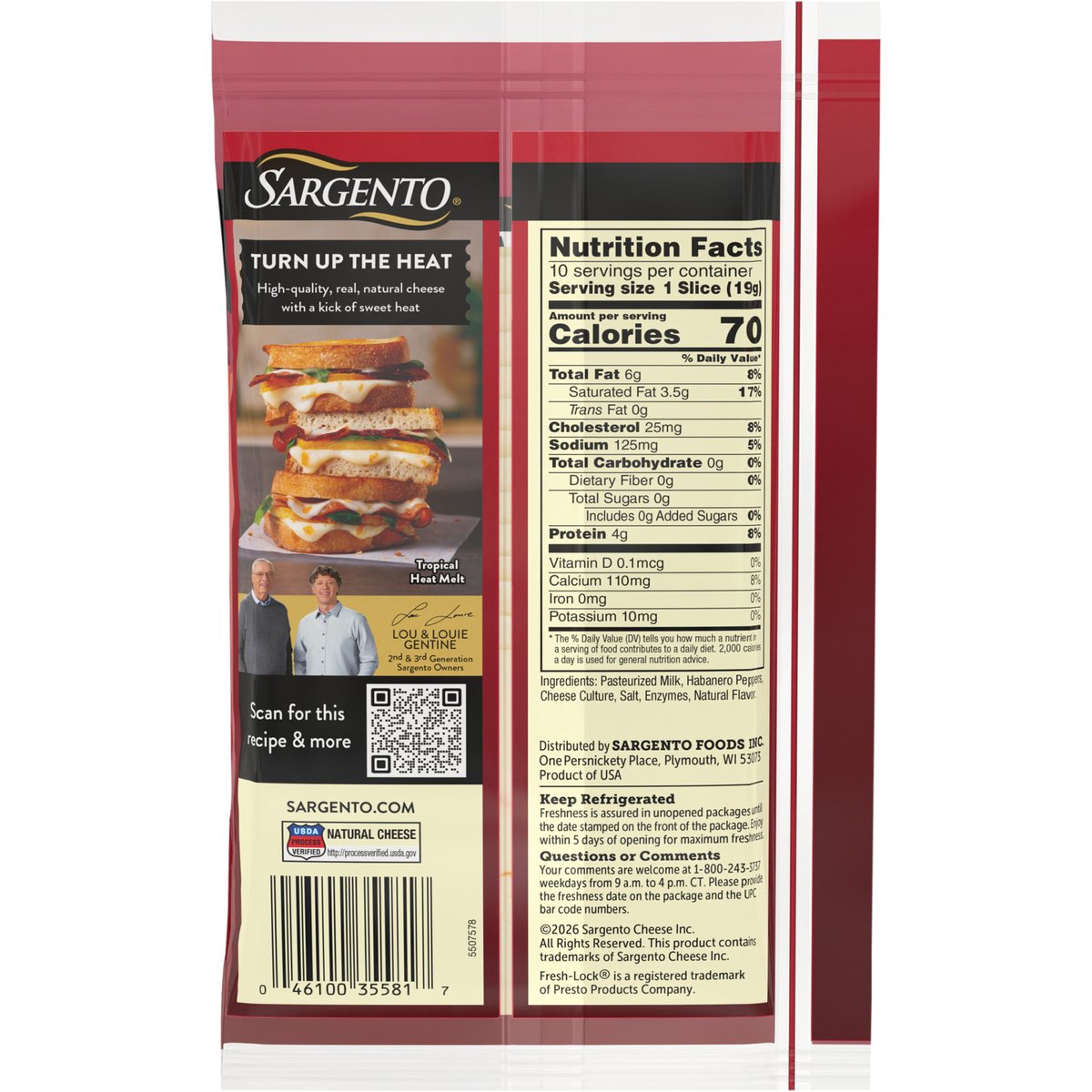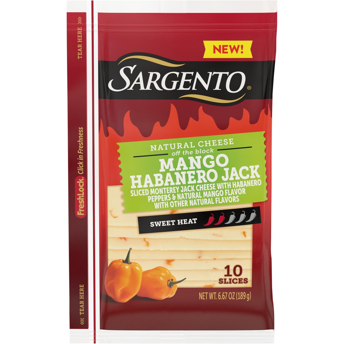 Sliced Monterey jack cheese with habanero peppers & natural mango flavor with other natural flavors. New! Turn up the heat. High-quality, real, natural cheese with a kick of sweet heat. Tropical heat melt. - Lou & Louie Gentine 2nd & 3rd generation Sargento owners. USDA Process Verified. Natural cheese. http://processverified.usda.gov. sargento.com. Scan for this recipe & more. Questions or Comments: Your comments are welcome at 1-800-243-3737 weekdays from 9 a.m. to 4 p.m. CT. Please provide the freshness date on the package and the UPC bar code numbers. FreshLock click in freshness. Product of USA.