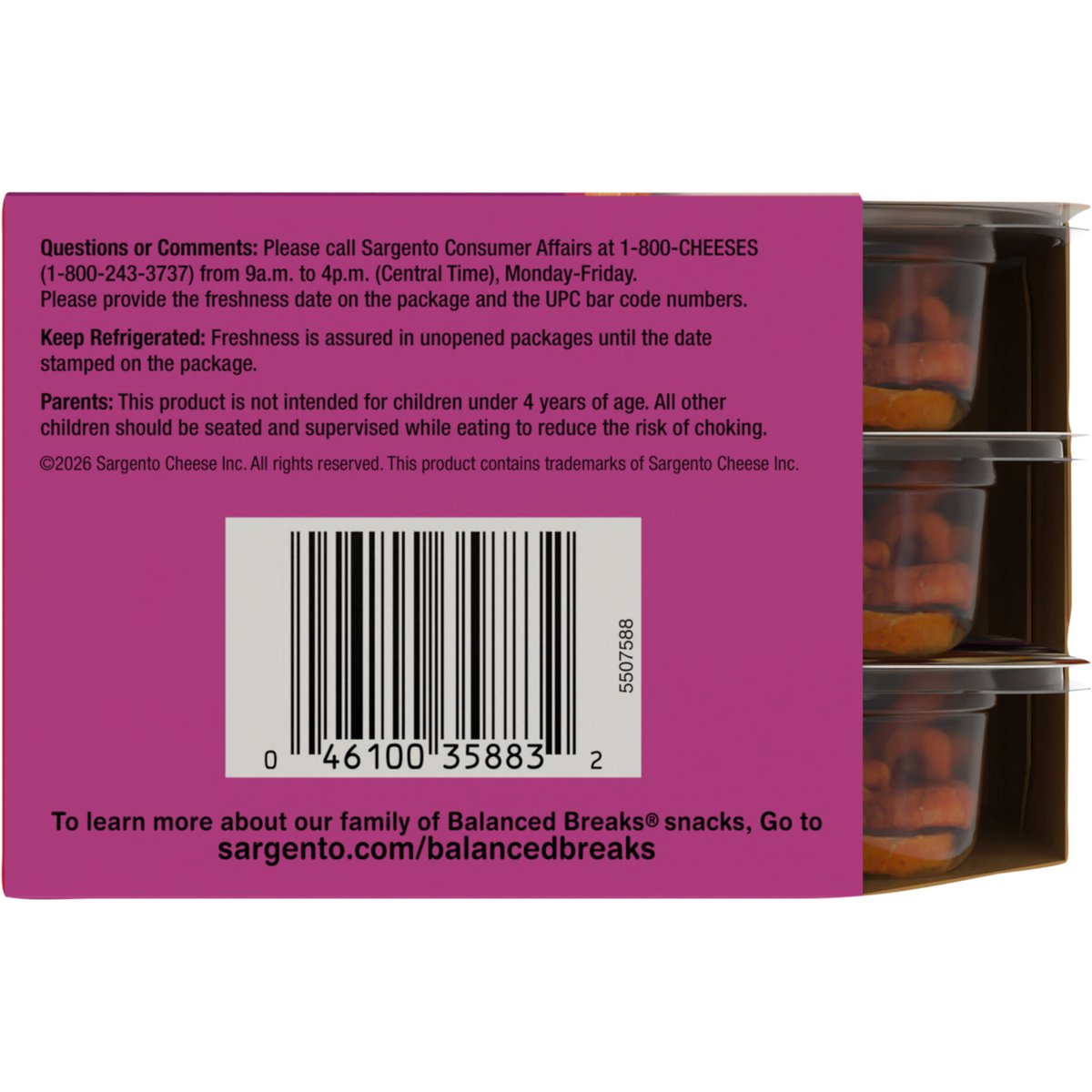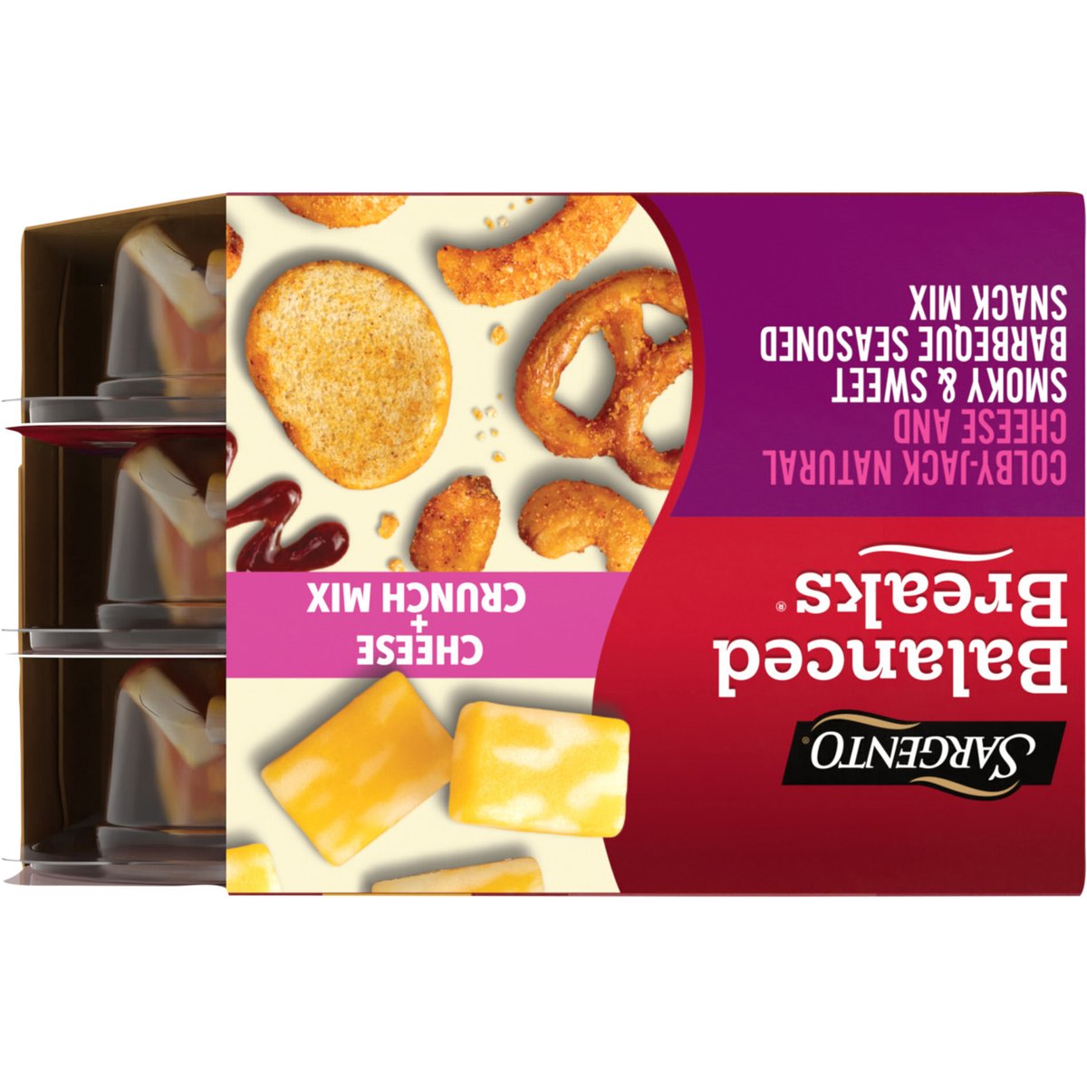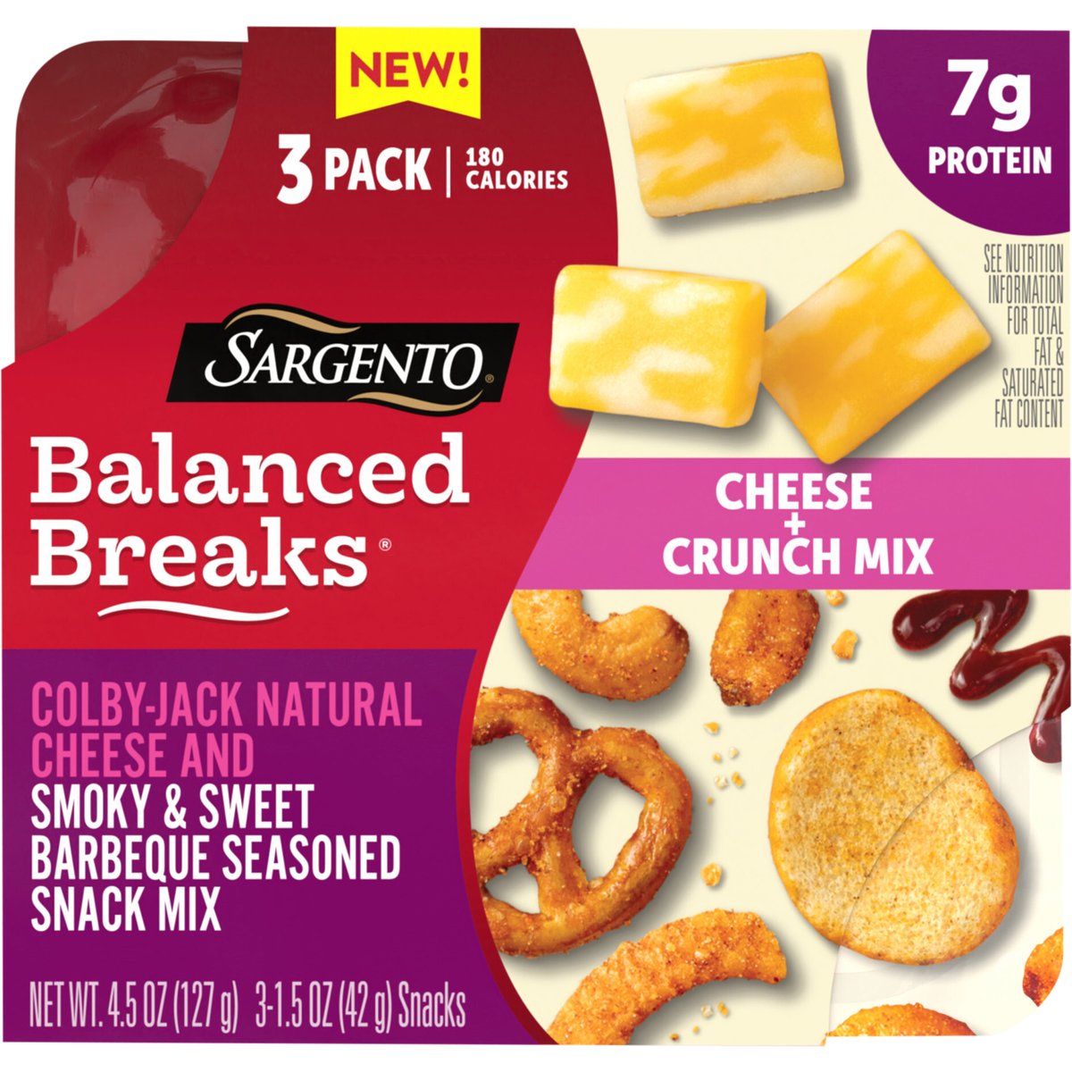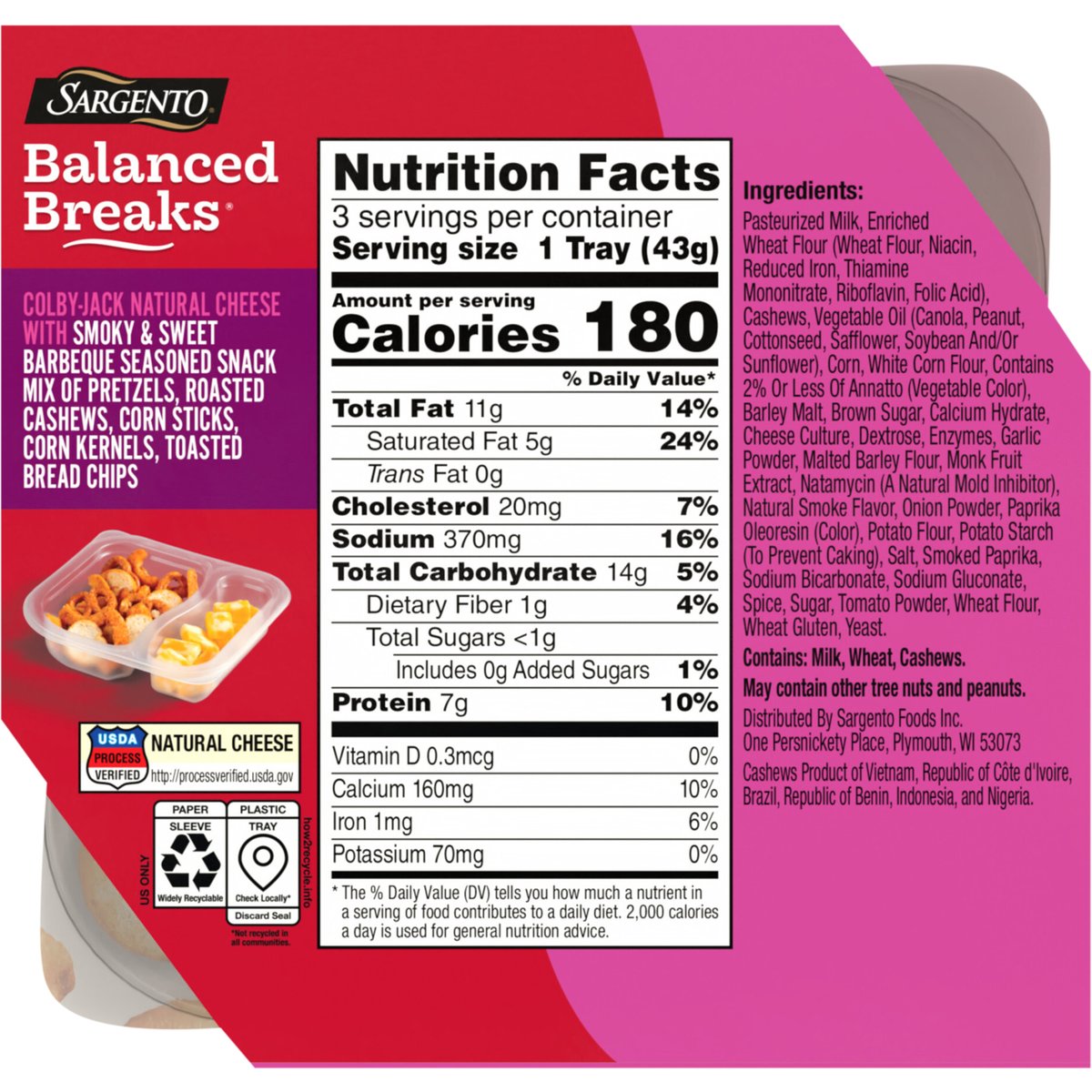 Colby-Jack natural cheese and smoky & sweet barbeque seasoned snack mix. 180 calories. 7 g protein. See nutrition information for total fat & saturated fat content. New! Colby-jack natural cheese with smoky & sweet barbeque seasoned snack mix of pretzels, roasted cashews, corn sticks, corn kernels, toasted bread chips. Lou & Louie. 2nd & 3rd Generation Owners. USDA Process Verified: Natural Cheese. http://processverified.usda.gov. how2recycle.info. sargento.com/balancebreaks. Questions or Comments: Please call Sargento Consumer Affairs at 1-800-Cheeses (1-800-243-3737) from 9a.m. to 4p.m. (Central Time), Monday-Friday. Please provide the freshness date on the package and the UPC bar code numbers. To learn more about our family of Balanced Breaks snacks, Go to sargento.com/balancedbreaks. Cashews Product of Vietnam, Republic of Cote d'Ivoire, Brazil, Republic of Benin, Indonesia, and Nigeria.