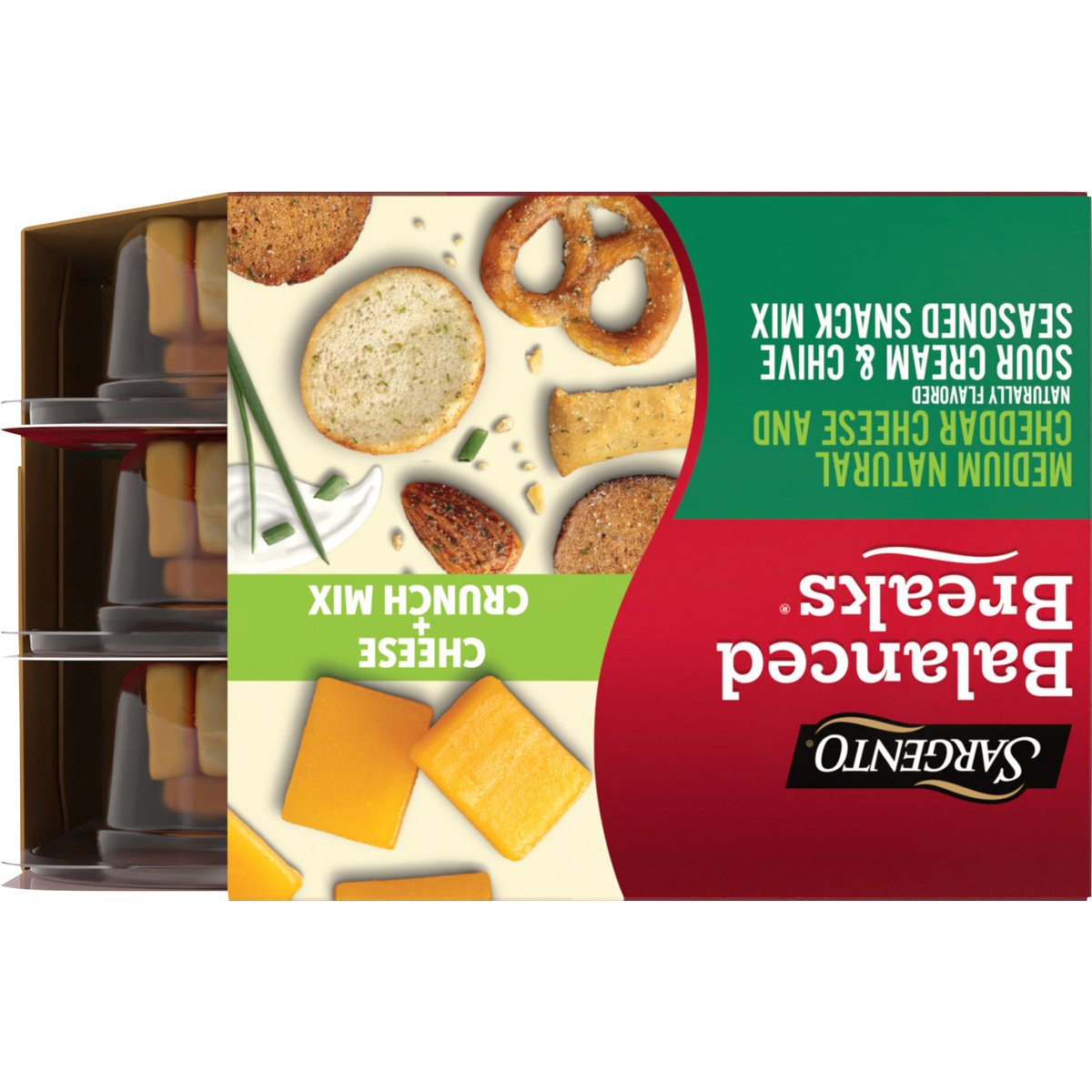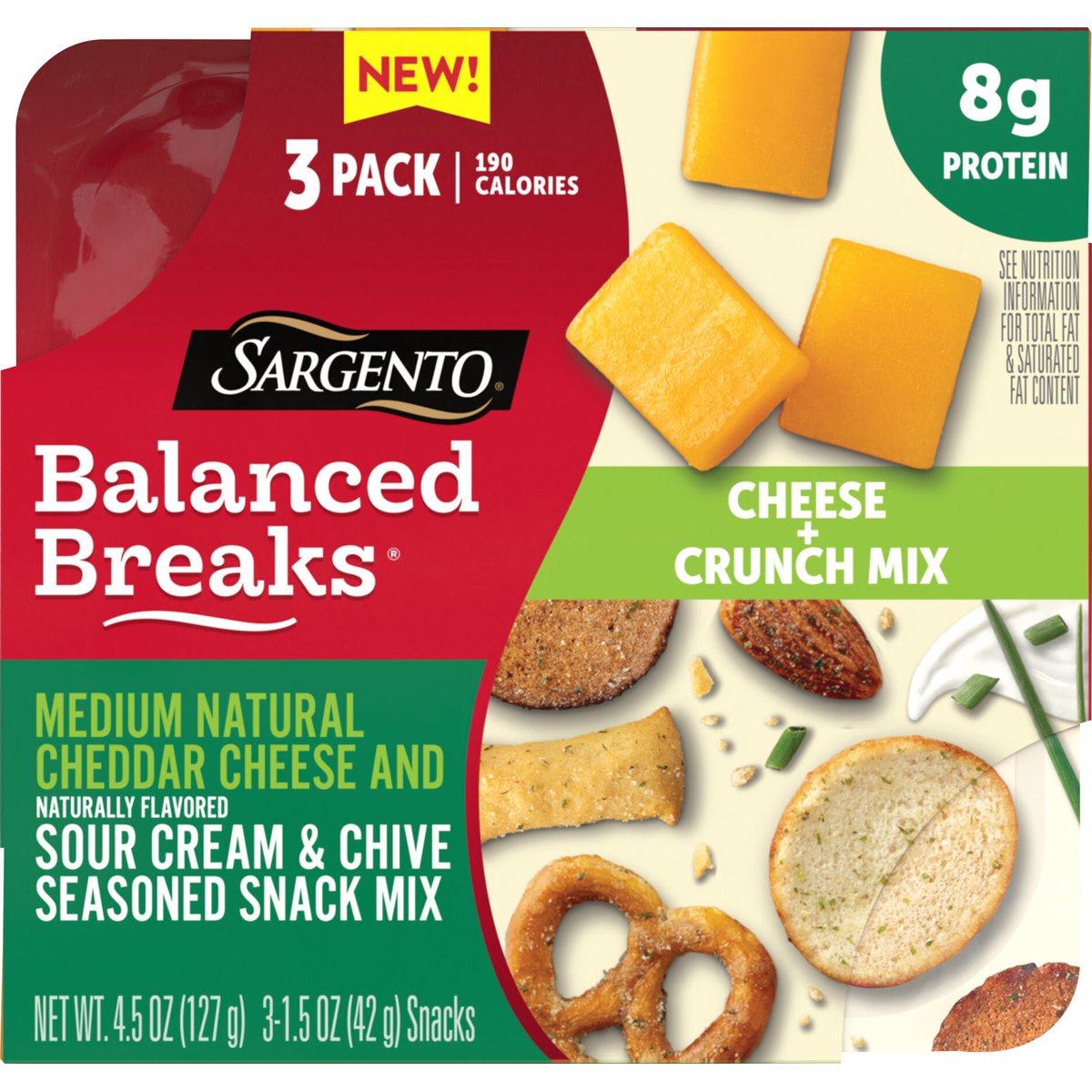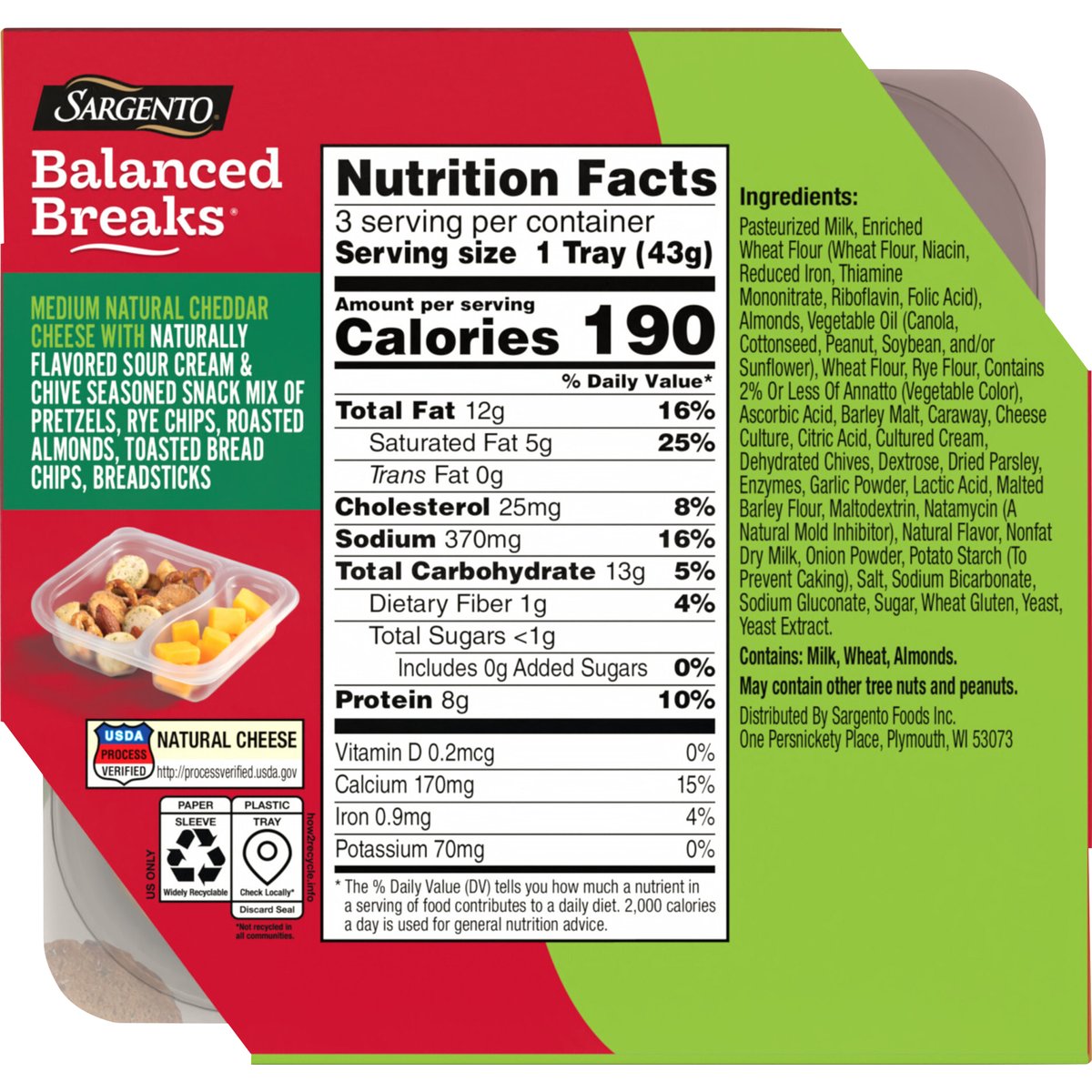 Medium natural cheddar cheese with naturally flavored sour cream & chive seasoned snack mix of pretzels, rye chips, roasted almonds, toasted bread chips, breadsticks. Naturally flavored. 8 g protein. 190 calories. See nutrition information for total fat & saturated fat content. New! Lou & Louie. 2nd & 3rd Generation Owners. USDA Process Verified: Grassfed. Natural Cheese. http://processverified.usda.gov. how2recycle.info. sargento.com/balancedbreaks. Questions or Comments: Please call Sargento Consumer Affairs at 1-800-Cheeses (1-800-243-3737) from 9a.m. to 4p.m. (Central Time), Monday-Friday. Please provide the freshness date on the package and the UPC bar code numbers. To learn more about our family of Balanced Breaks snacks, Go to sargento.com/balancedbreaks.