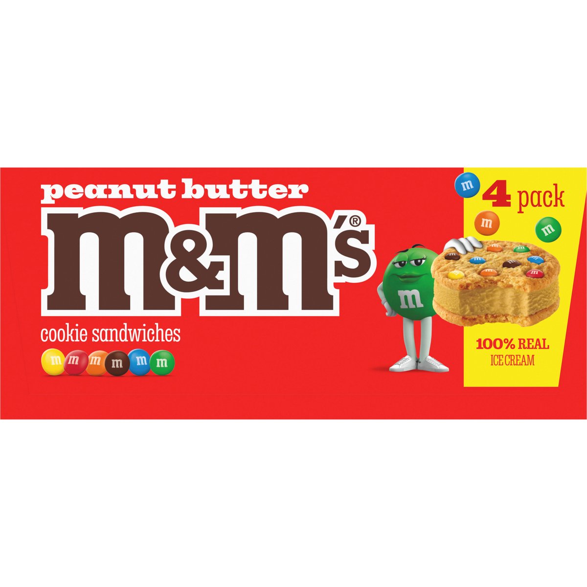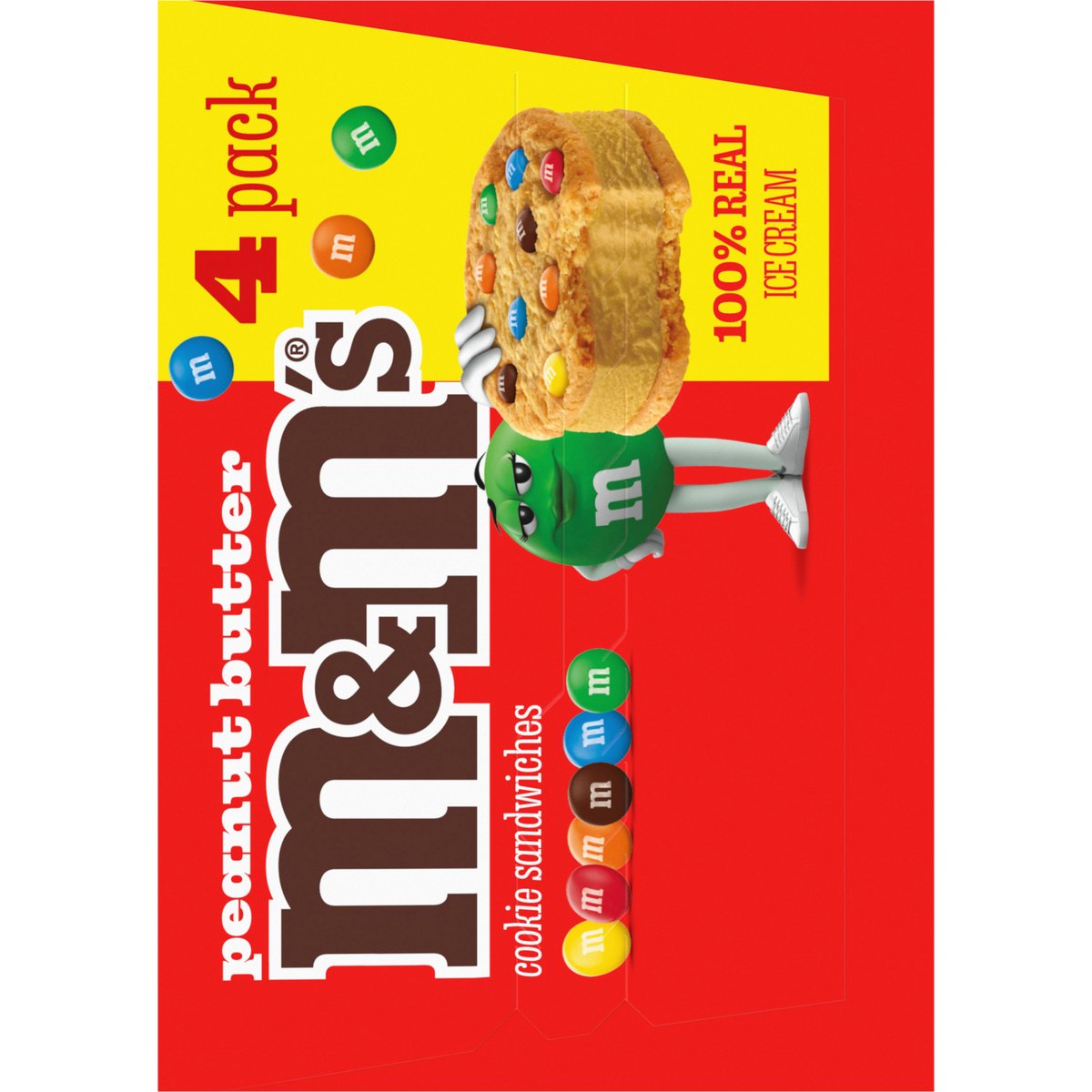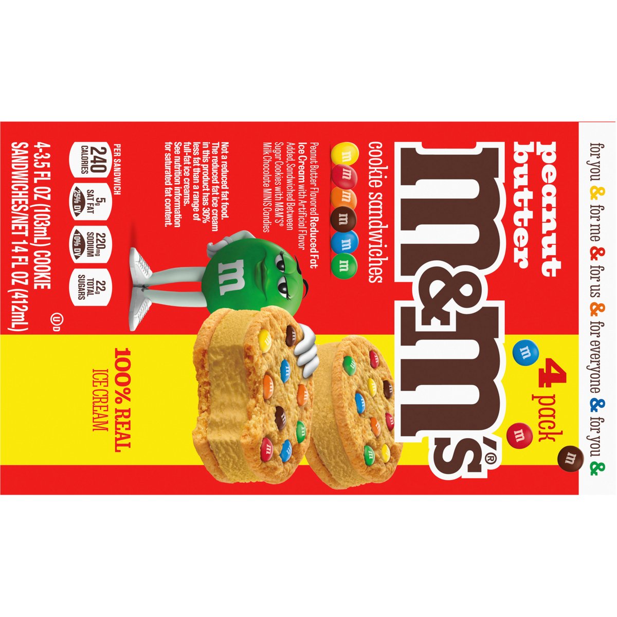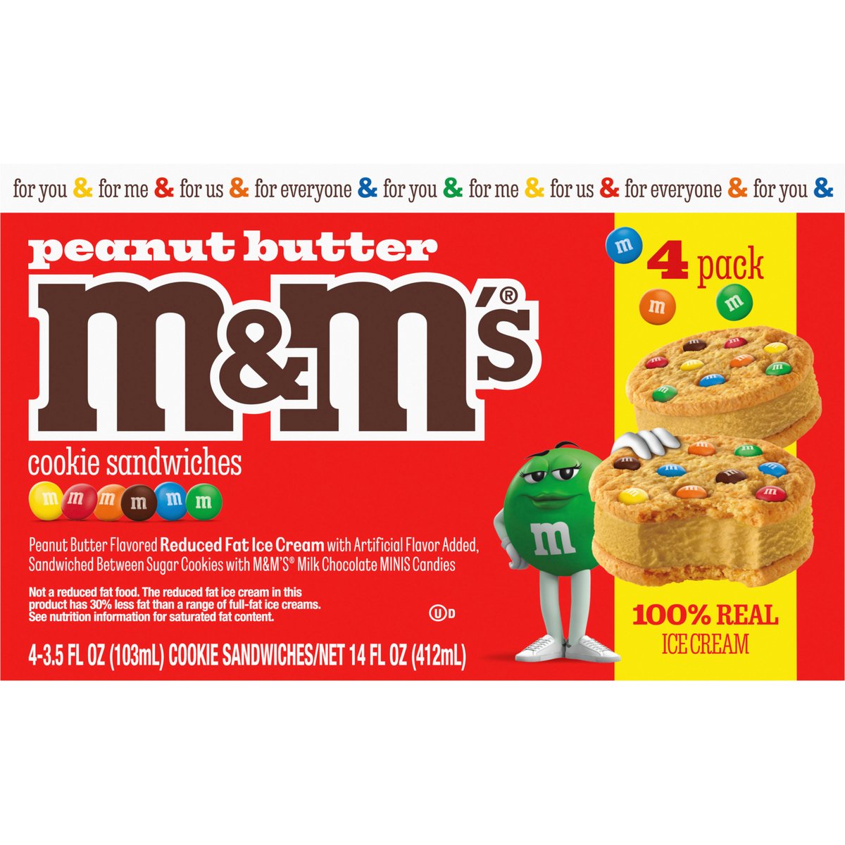 Peanut butter flavored reduced fat ice cream with artificial flavor added. Sandwiched between sugar cookies with M&M's milk chocolate minis candies. Per Sandwich: 240 calories; 5 g sat fat (25% DV); 220 mg sodium (10% DV); 22 g total sugars. Not a reduced fat food. The reduced fat ice cream in this product has 30% less fat than a range of full-fat ice creams. See nutrition information for saturated fat content. Not a reduced fat food. The reduced fat ice cream in this product has 4 g fat. A range of full-fat ice creams has an average of 6 g fat. Contains bioengineered food ingredients. For you & for me & for us & for everyone. We value your questions or comments. Call 1-800-551-0895. Please save the empty carton. Recyclable.