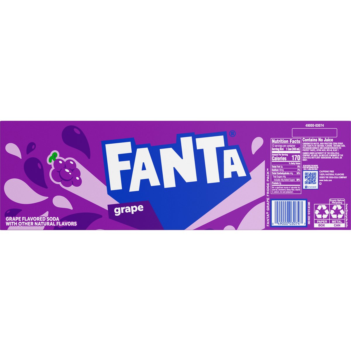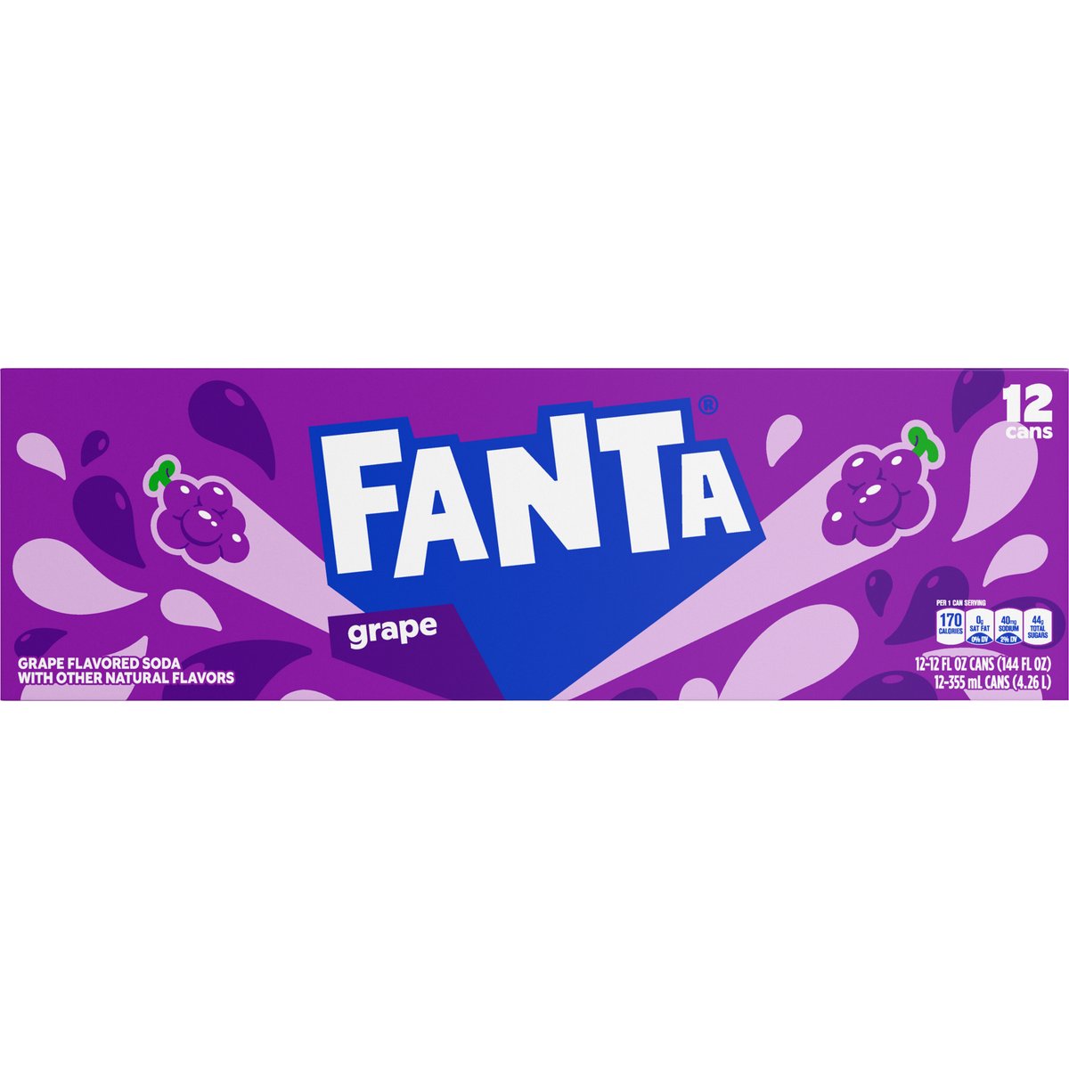 Grape flavored soda with other natural flavors. 100% natural flavors. Per 1 Can Serving: 170 calories; 0 g sat fat (0% DV); 40 mg sodium (2% DV); 44 g total sugars. Caffeine free. www.fanta.com. how2recycle.info. SmartLabel: Scan for more food information or call 1-800-438-2653. 1-800-438-2653. Recycle me. See you again soon!