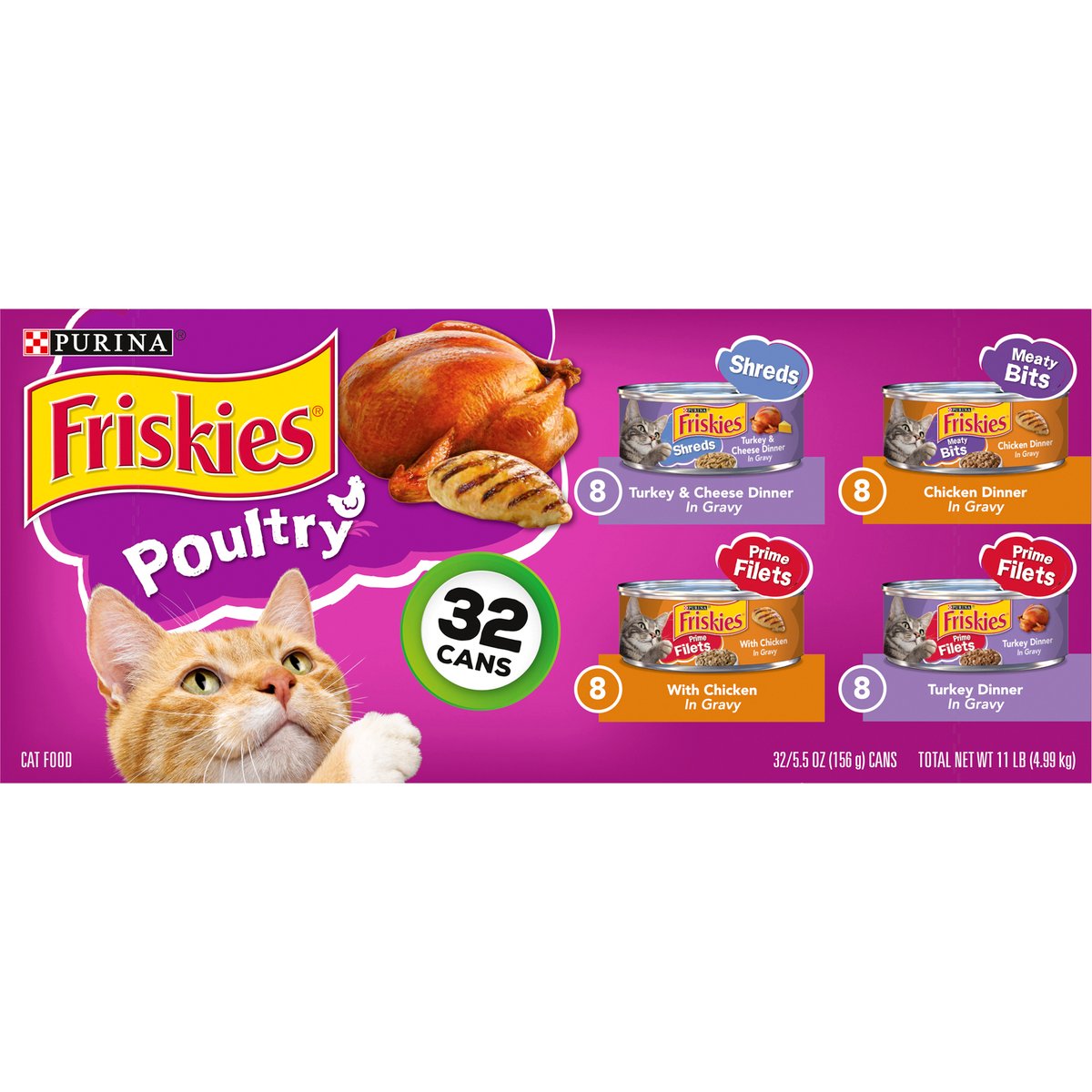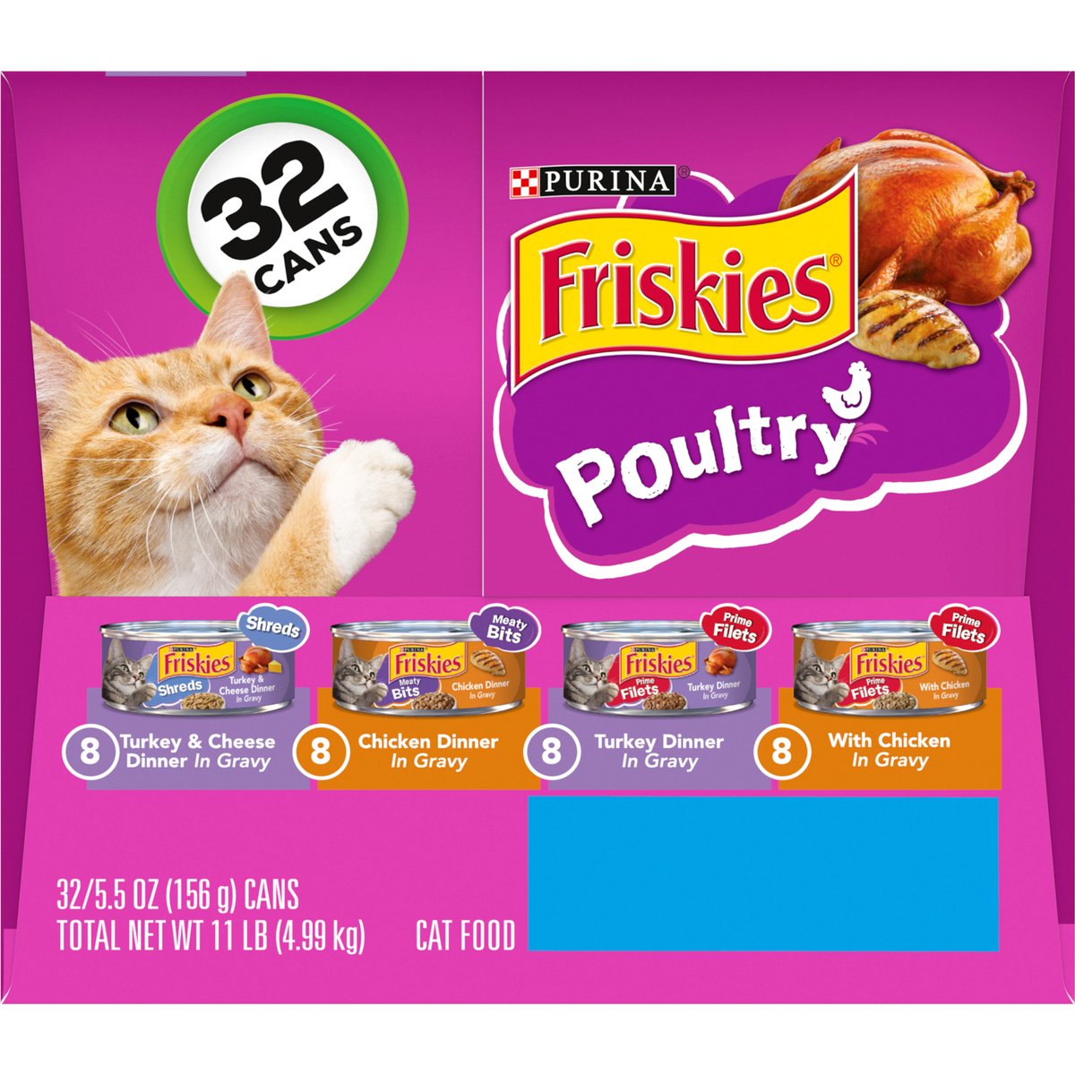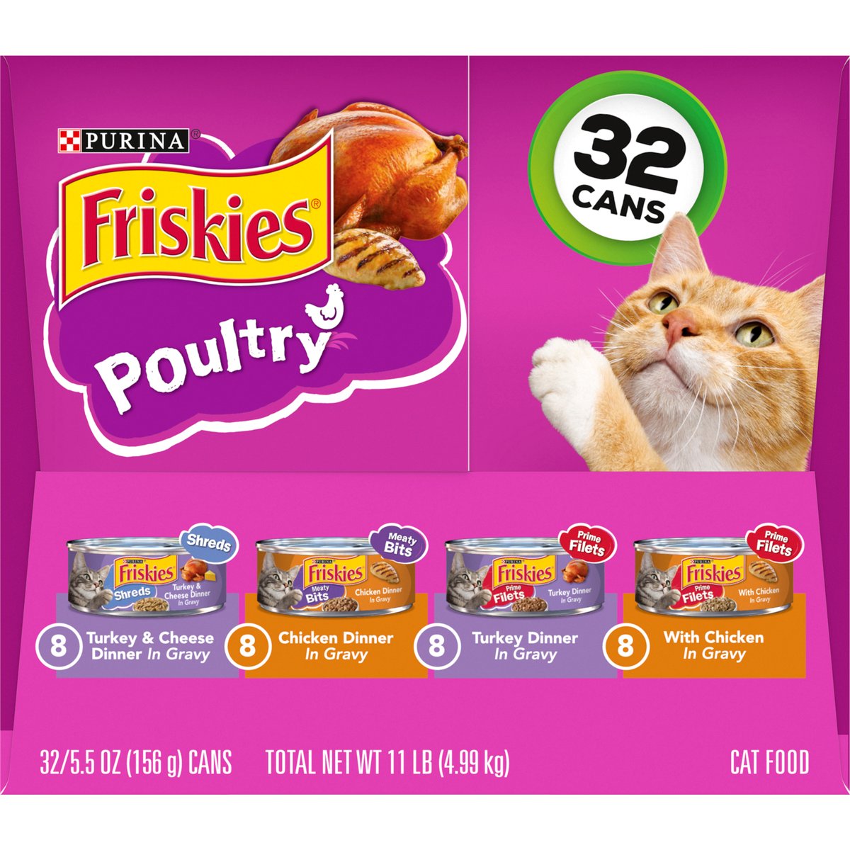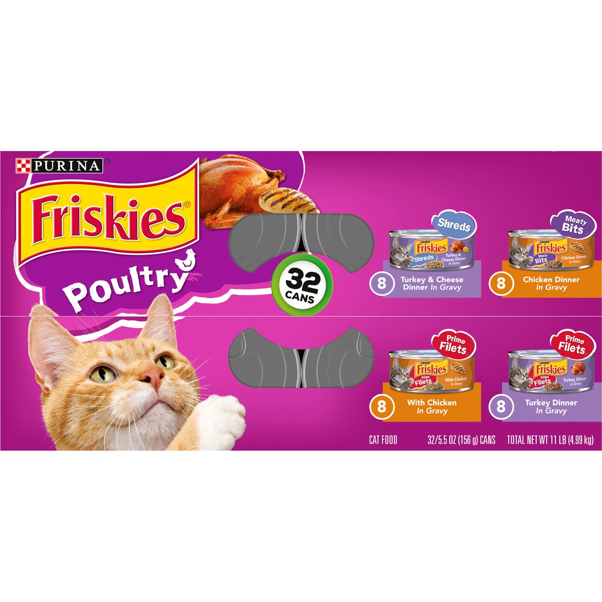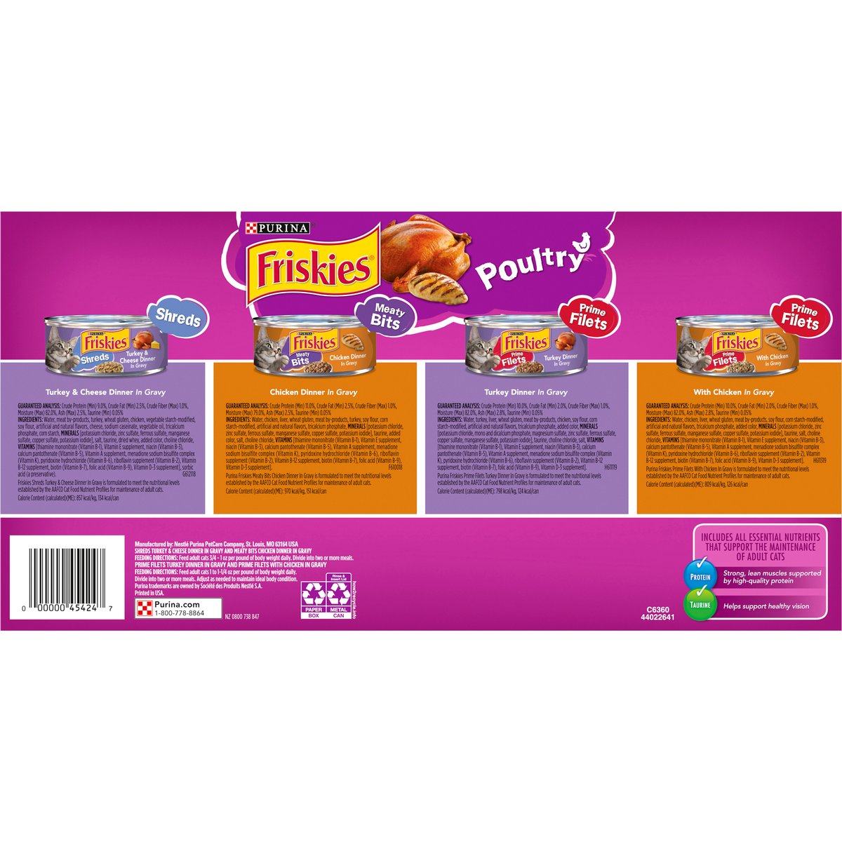 8 - Shreds Turkey & Cheese Dinner in Gravy. 8 - Meaty Bits Chicken Dinner in Gravy. 8 - Prime Filets with Chicken in Gravy. 8 - Prime Filets Turkey Dinner in Gravy. Includes all essential nutrients that support the maintenance of adult cats. Protein: Strong, lean muscles supported by high-quality protein. Taurine: Helps support healthy vision. purina.com. how2recycle.info. Printed in USA.