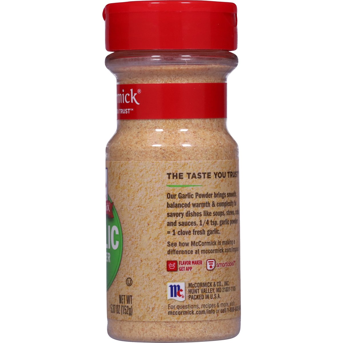 Non-GMO. The taste you trust. mccormick.com/impact. mccormick.com/info. Flavor maker get App. SmartLabel. See how McCormick is making a difference at mccormick.com/impact. For questions, recipes & more, visit mccormick.com/info or call 1-800-632-5847. Packed in U.S.A.