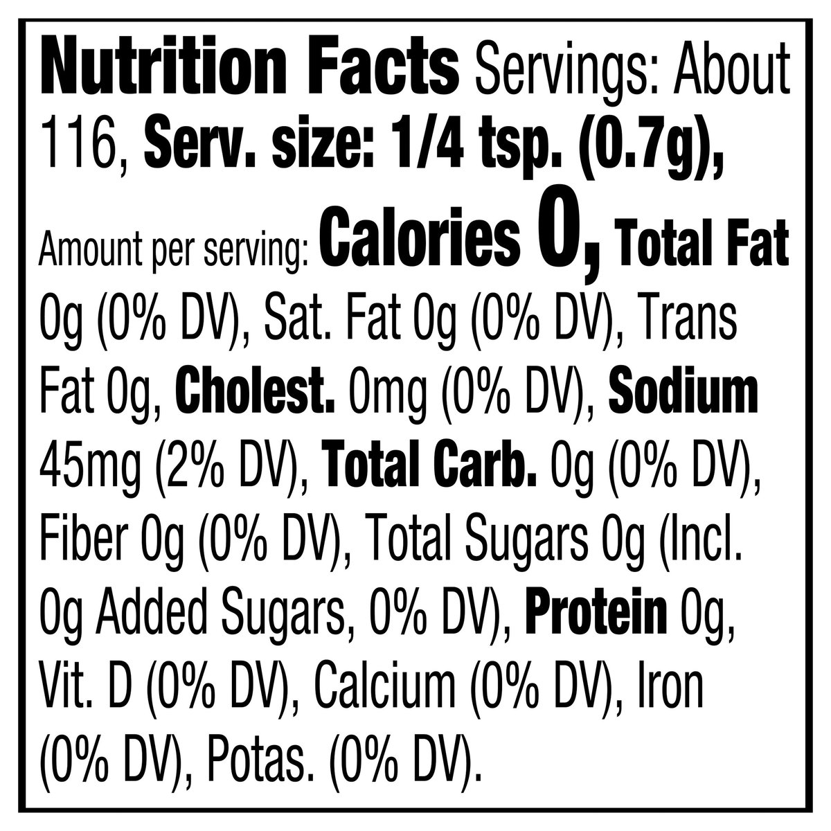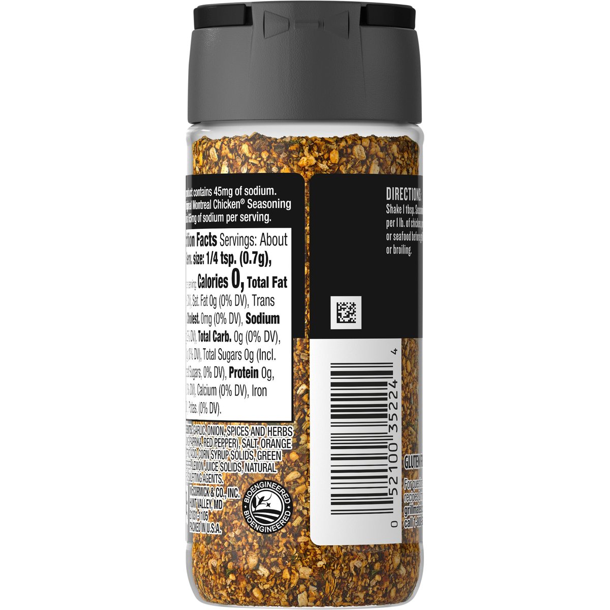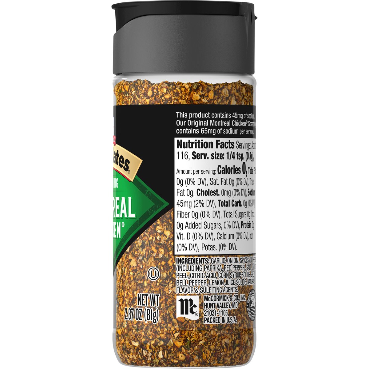 This product contains 45 mg of sodium. Our original Montreal Chicken seasoning contains 65 mg of sodium per serving. Gluten free. 25% less sodium than our original. See nutrition information for sodium content. Bioengineered. grillmates.com/info. For questions, recipes & more, visit grillmates.com/info or call 1-800-632-5847. Packed in U.S.A.