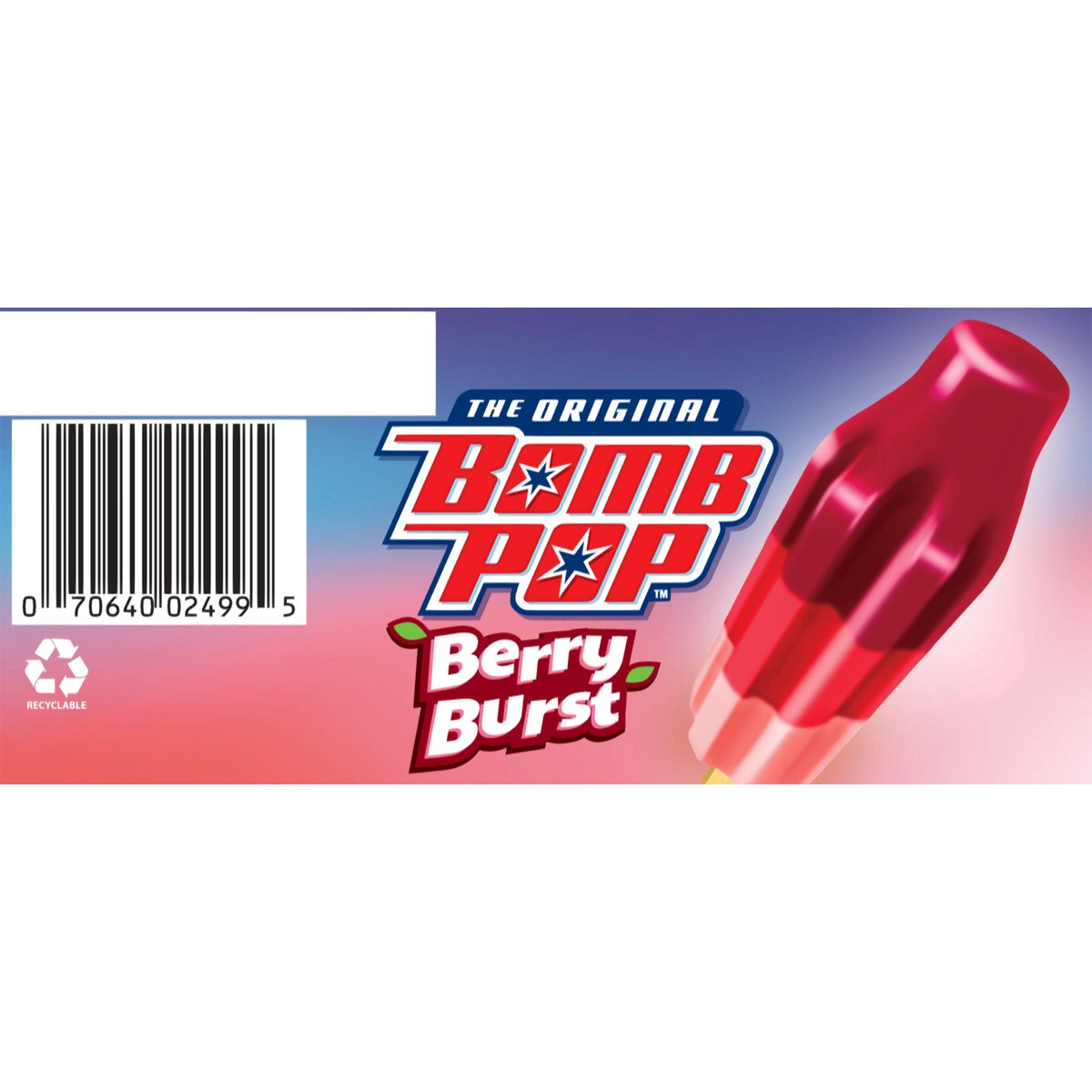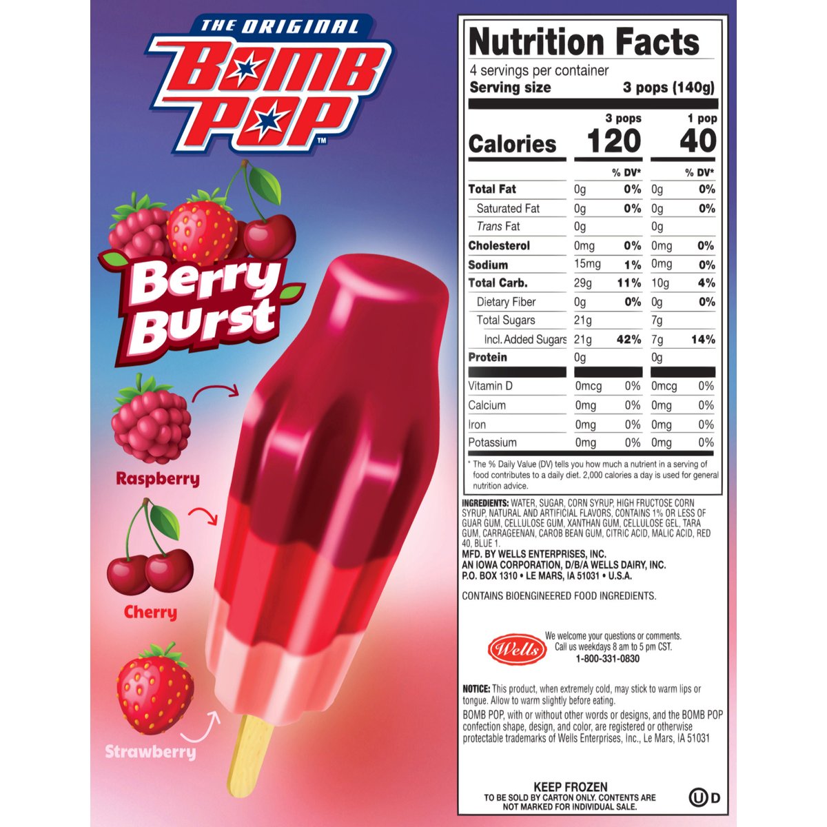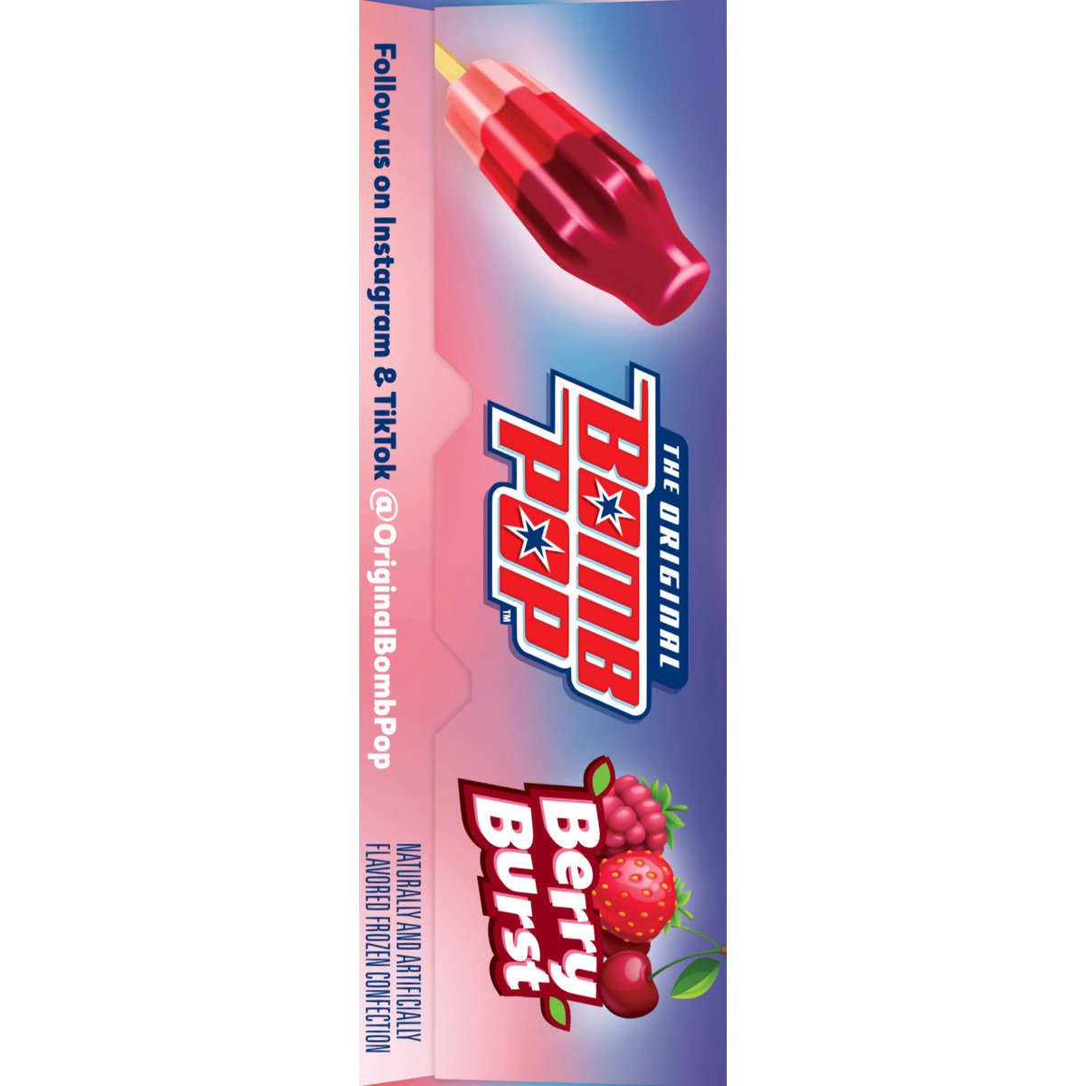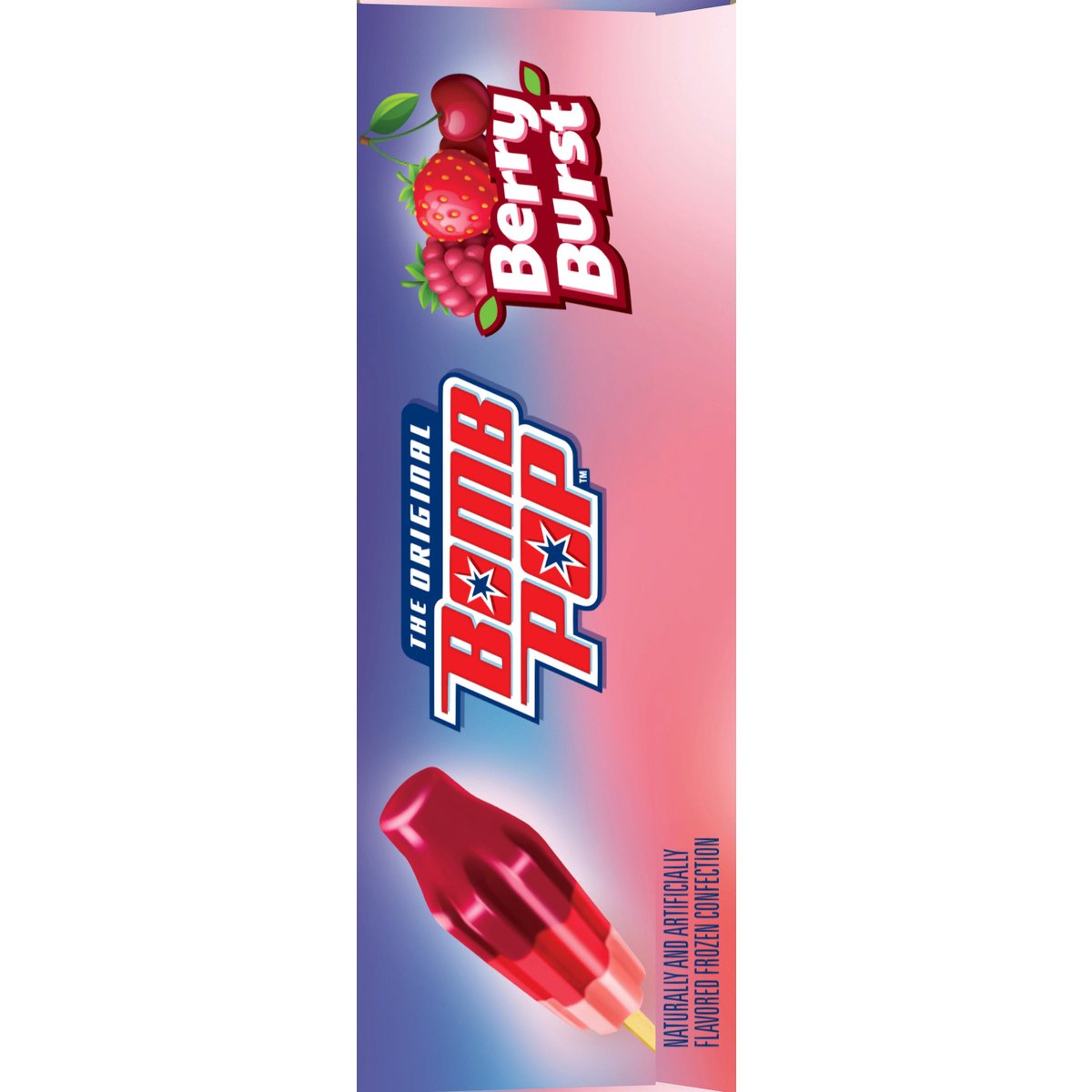 Raspberry cherry & strawberry. Naturally and artificially flavored frozen confection. Contains bioengineered food ingredients. The original. Pink lemonade. Sweet berry. Frosted cupcake. To be sold by carton only. Contents are not marked for individual sale. Follow us on Instagram & TikTok @OriginalBobmPop. We welcome your questions or comments. Call us weekdays 8 am to 5 pm CST. 1-800-331-0830. Recyclable.