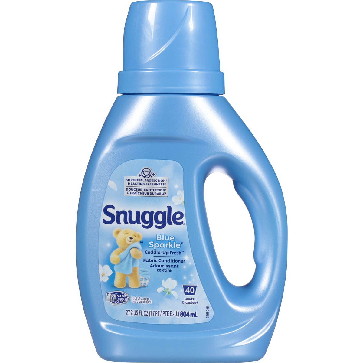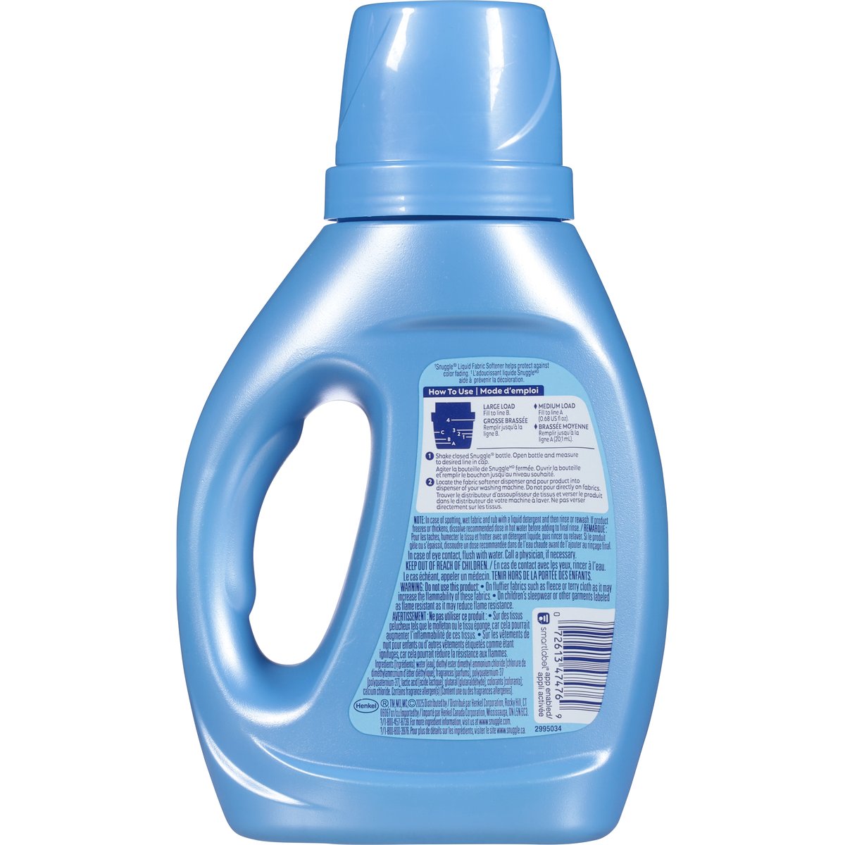 40 loads(c). (c)Medium load fill to line A (0.68 us fl oz), Softness, protection(a) & lasting freshness(b). Cuddle-up fresh. (a) Snuggle Liquid Fabric Softener helps protect against color fading. (b) Out of storage. HE. For both. www.snuggle.com. SmartLabel app enabled. ?/1-800-457-8739. For more ingredient information, visit us at www.snuggle.com.