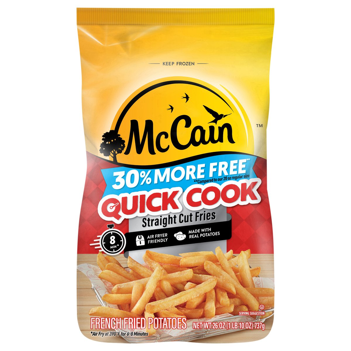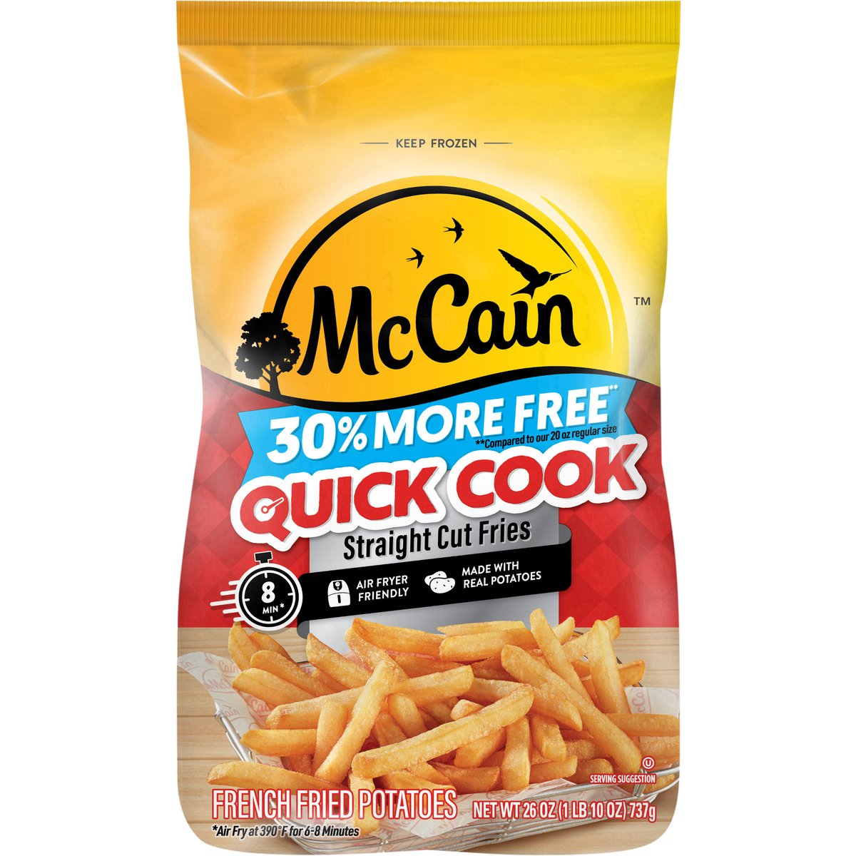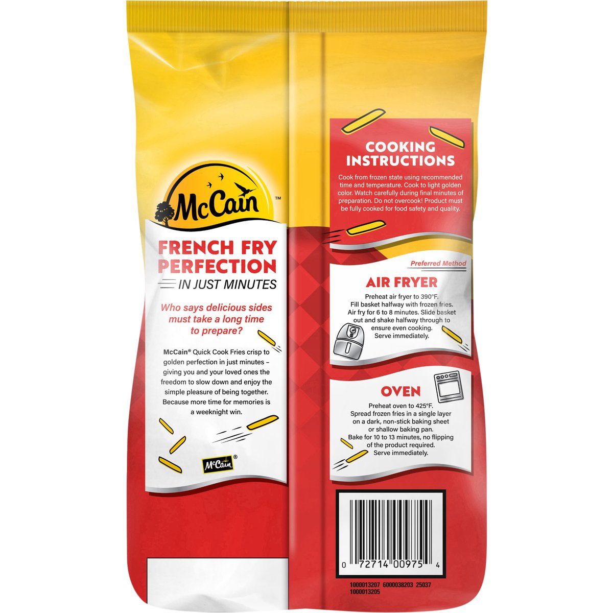 No artificial flavors. 0 g trans fat per serving. Contains a bioengineered food ingredient. 8 mins*. Air fryer friendly. French fry perfection in just minutes. Who says delicious sides must take a long time to prepare? McCain Quick Cook fries crisp to golden perfection in just minutes- giving you and your loved ones the freedom to slow down and enjoy the simple pleasure of being together. Because more time for memories is weeknight win. * Air fry at 390 degrees f for 6-8 minutes. mccainfoodsusa.com. how2recycle.info. Follow us social media. Facebook. Instagram. Comments or questions? Please contact us! mccainfoodsusa.com. Toll free 1-877-804-6198. Mon. to fri. 8AM to 4:30PM CST.