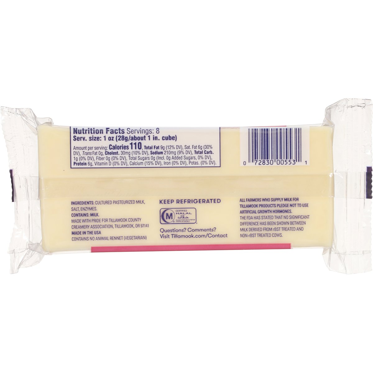 Certified Halal: Islamic Food and Nutrition Council of America. Contains no animal rennet (vegetarian). Farmed owned. Est.1909 Oregon. Made with pride for Tillamook County. All farmers who supply milk for Tillamook products pledge not to use artificial growth hormones. The FDA has stated that no significant difference has been shown between milk derived from rBST treated and non-rBST treated cows. Tastes better because it's made right. When you want award-winning flavor, this is the cheese to choose. Tillamook.com/Contact. Questions? Comments? Visit Tillamook.com/Contact. Certified B Corporation: As a proud certified B Corp we promise to put the land, cows and people first - always. Learn more at Tillamook.com. Made in the USA.