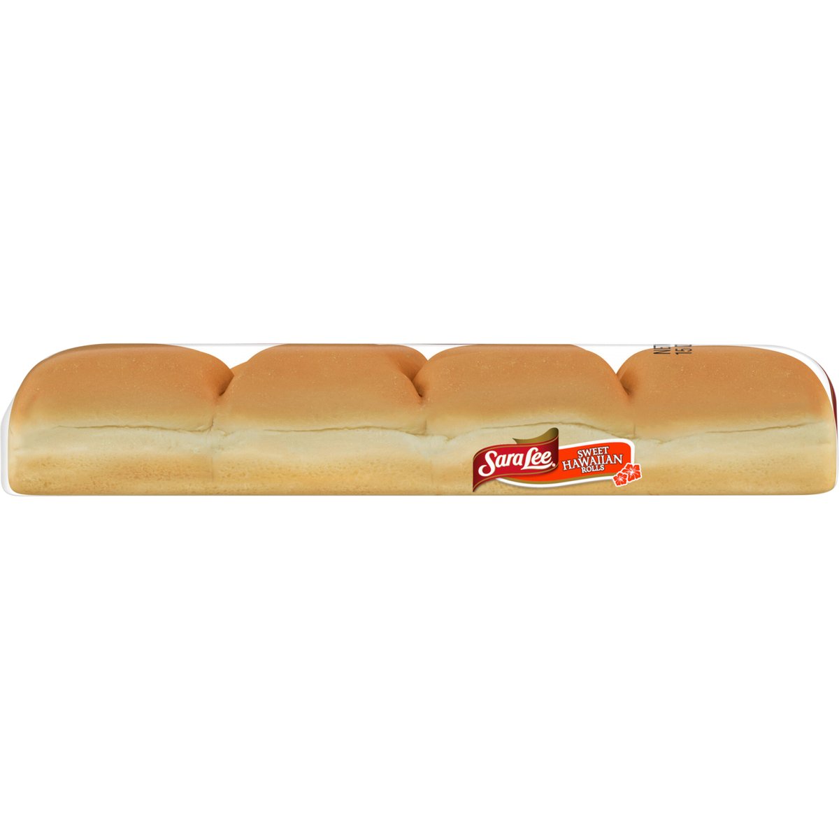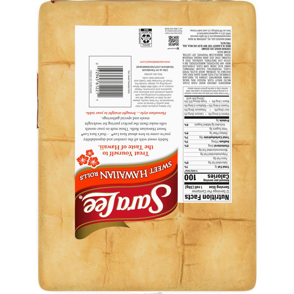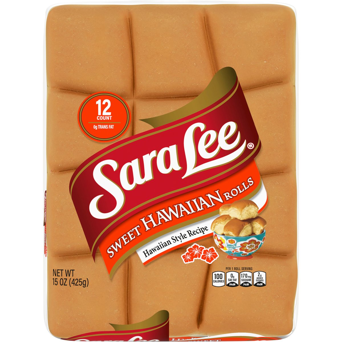 0 g trans fat. Per 1 Roll Serving: 100 calories; 0 g sat fat (0% DV); 170 mg sodium (7% DV); 2 g added sugars (4% DV). Treat Yourself to the Taste of Hawaii. Subtly sweet with all the comfort and dependability you've come to love about Sara Lee - that's Sara Lee Sweet Hawaiian Rolls. These melt-in-your-mouth rolls make them the perfect pairing for weeknight meals and special gatherings. Hawaiian style - brought straight to your table. www.saraleebread.com. SmartLabel: Scan for more food information or call 1-800-432-8266. Like us on Facebook. facebook/saraleebread. We are committed to providing you with quality products and welcome your questions and comments. Please contact us at 1-800-984-0989. When contacting us, please include the Proof-of-Purchase (Bar Code) and stamped date code.
