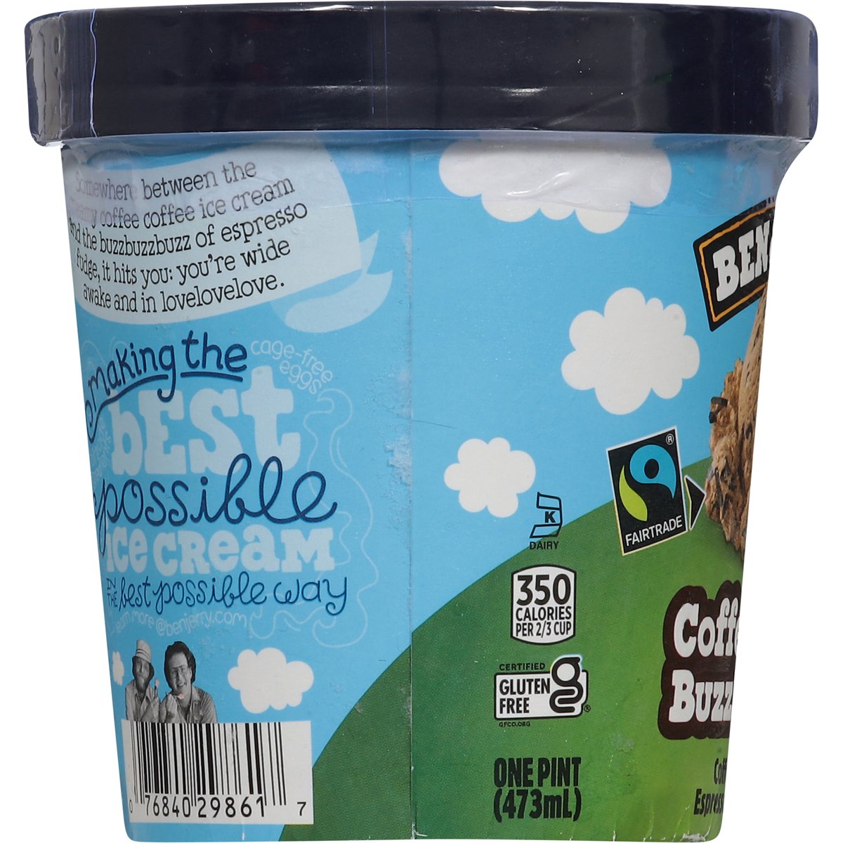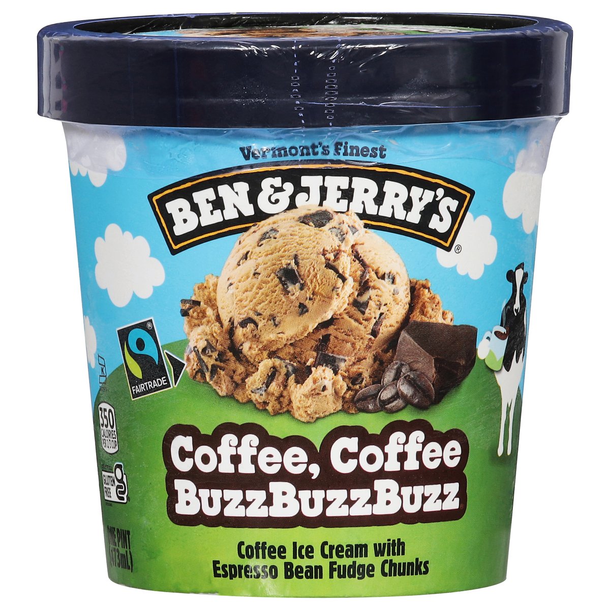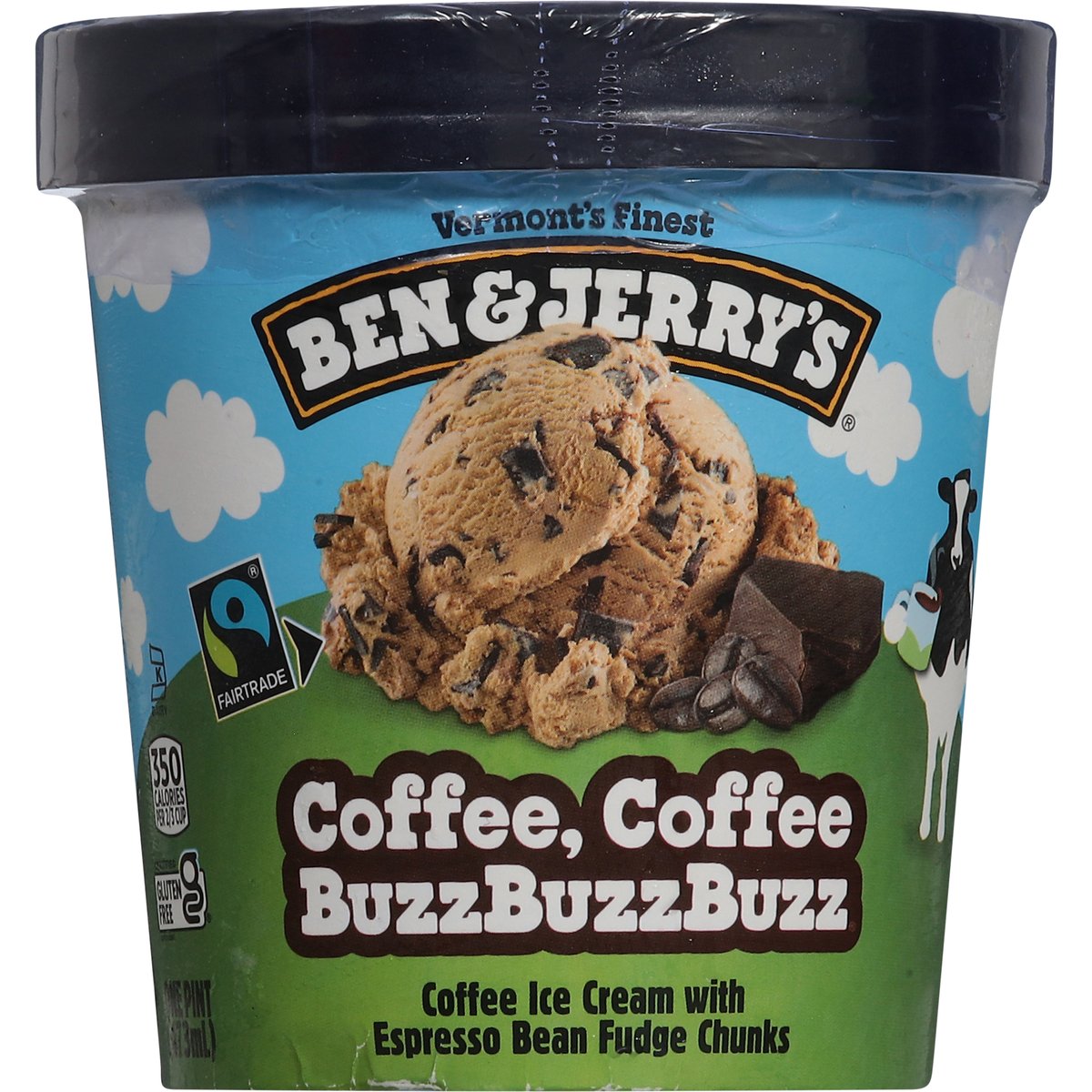 Coffee ice cream with espresso bean fudge chunks. 350 calories per 2/3 cup. Certified gluten free. gfco.org. Vermont's finest. Somewhere between the creamy coffee coffee ice cream and the buzzbuzzbuzz of espresso fudge, it hits you: You’re wide awake and in lovelovelove. Making best possible ice cream in the best possible way. Fair-trade ingredients. Cage-free eggs. Your satisfaction guaranteed. benjerry.com. how2recycle.info. Get in touch with us: benjerry.com/contact-us. Learn more at benjerry.com. Certified Fair Trade by FLOCert. FSC: Mix packaging. Cocoa, coffee, sugar, & vanilla: Mass balance is used to match fairtraded sourcing, total 78%, excluding water & dairy. info.fairtrade.net/sourcing