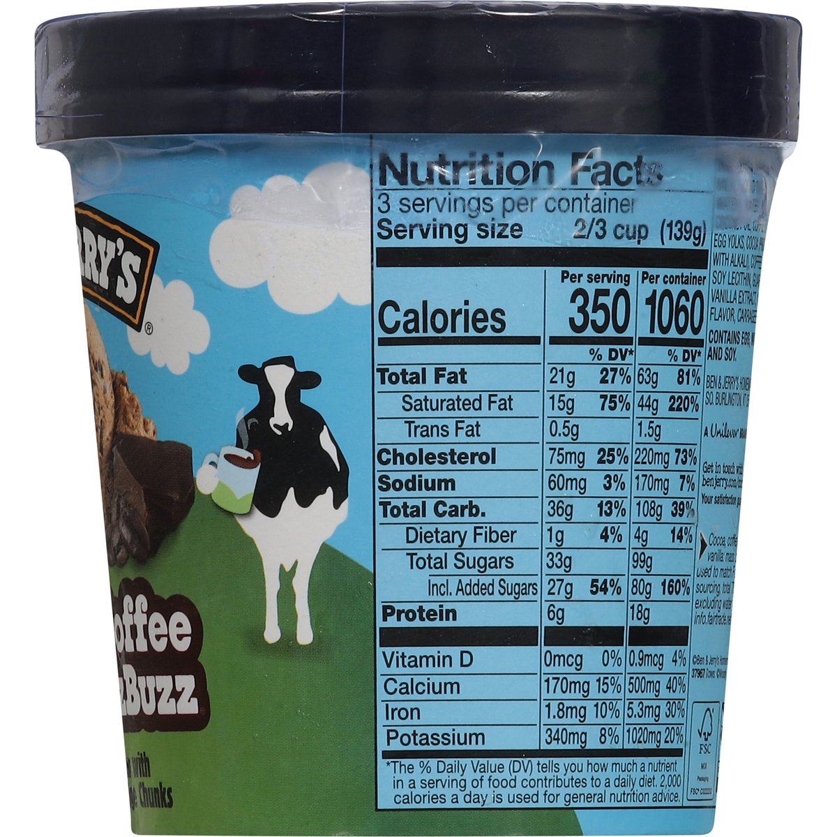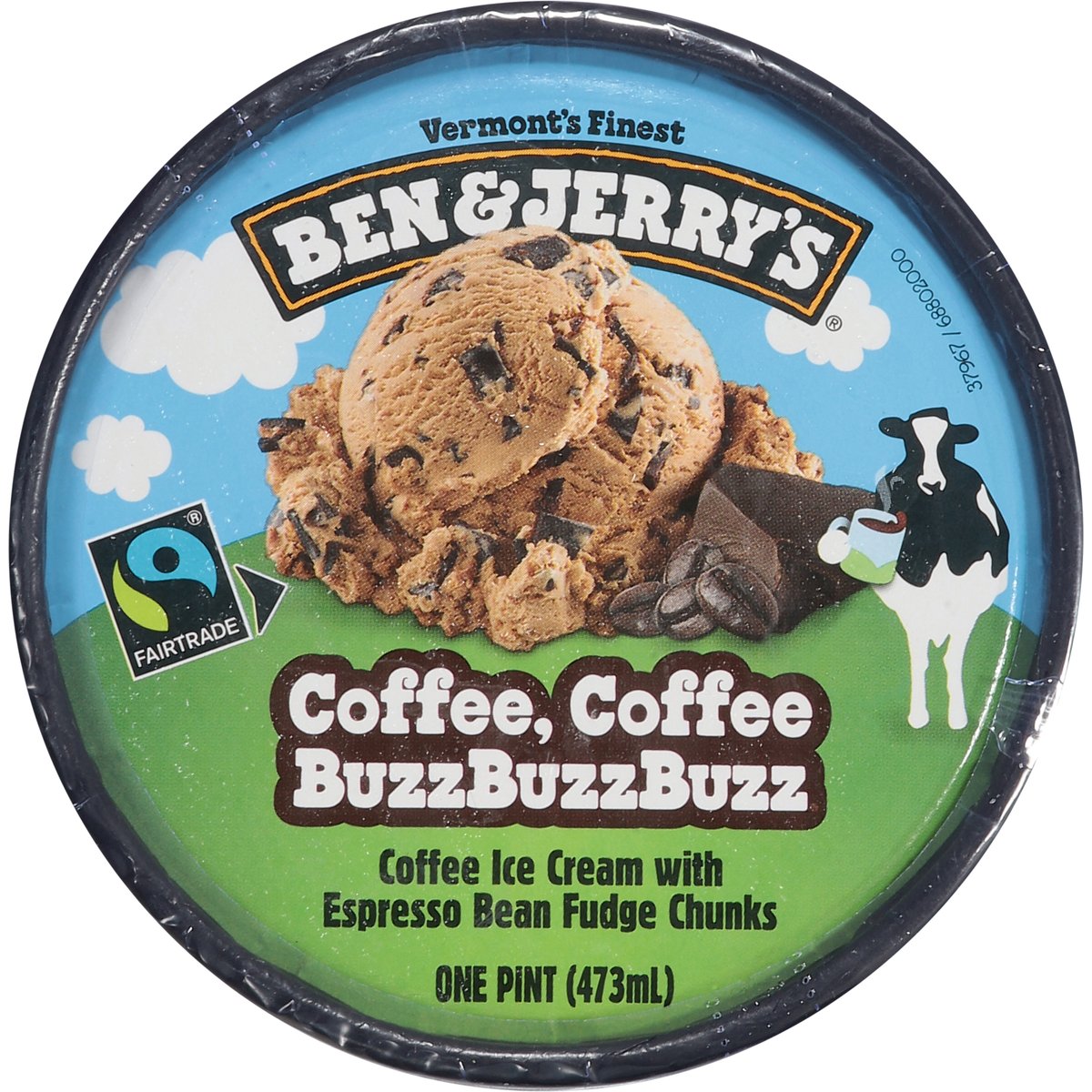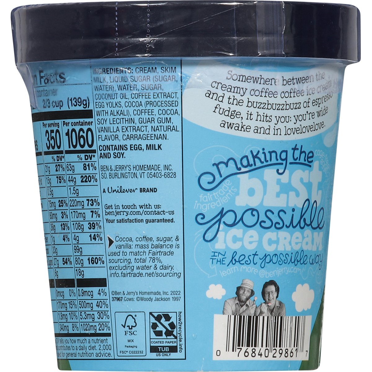 Coffee ice cream with espresso bean fudge chunks. 350 calories per 2/3 cup. Certified gluten free. gfco.org. Vermont's finest. Somewhere between the creamy coffee coffee ice cream and the buzzbuzzbuzz of espresso fudge, it hits you: You’re wide awake and in lovelovelove. Making best possible ice cream in the best possible way. Fair-trade ingredients. Cage-free eggs. Your satisfaction guaranteed. benjerry.com. how2recycle.info. Get in touch with us: benjerry.com/contact-us. Learn more at benjerry.com. Certified Fair Trade by FLOCert. FSC: Mix packaging. Cocoa, coffee, sugar, & vanilla: Mass balance is used to match fairtraded sourcing, total 78%, excluding water & dairy. info.fairtrade.net/sourcing