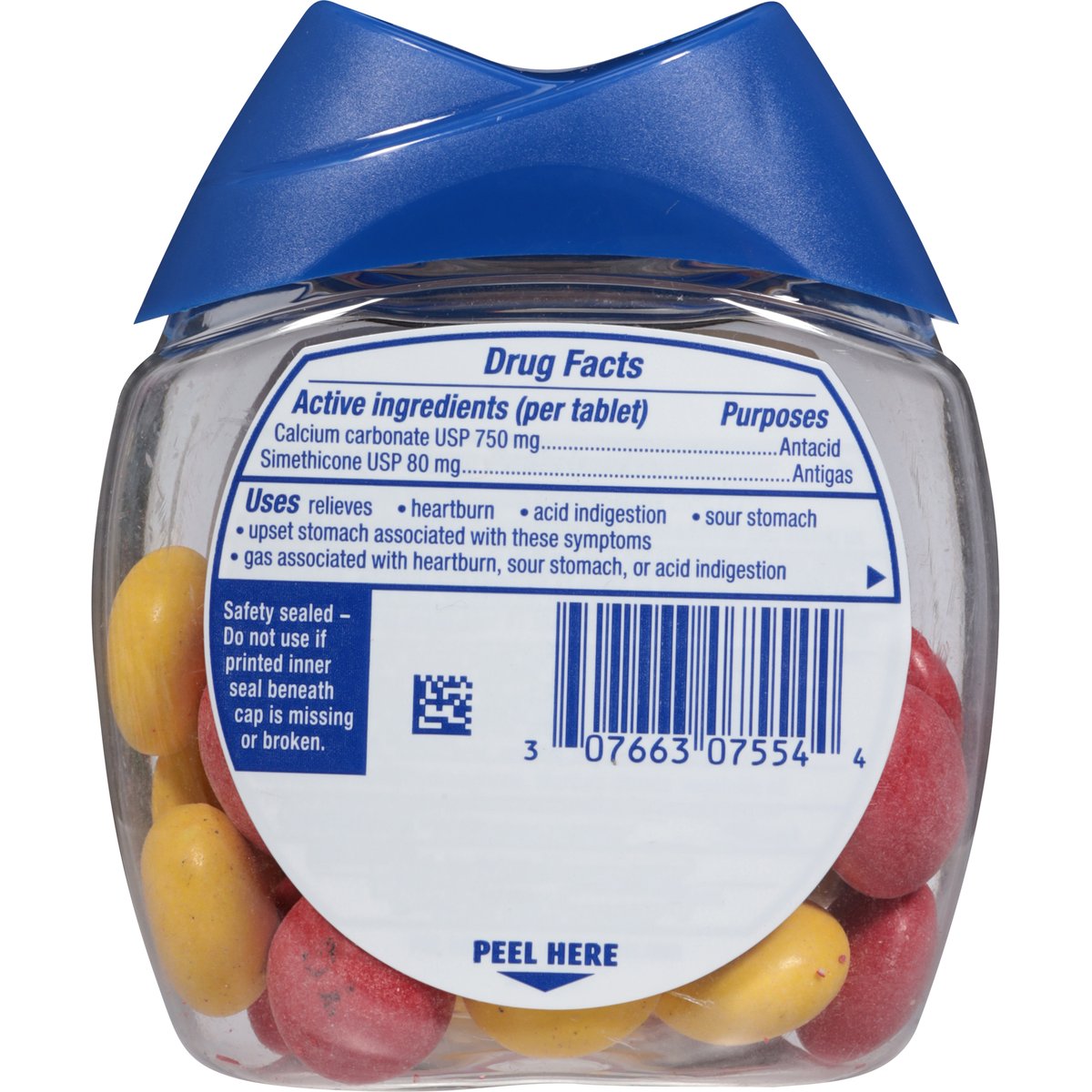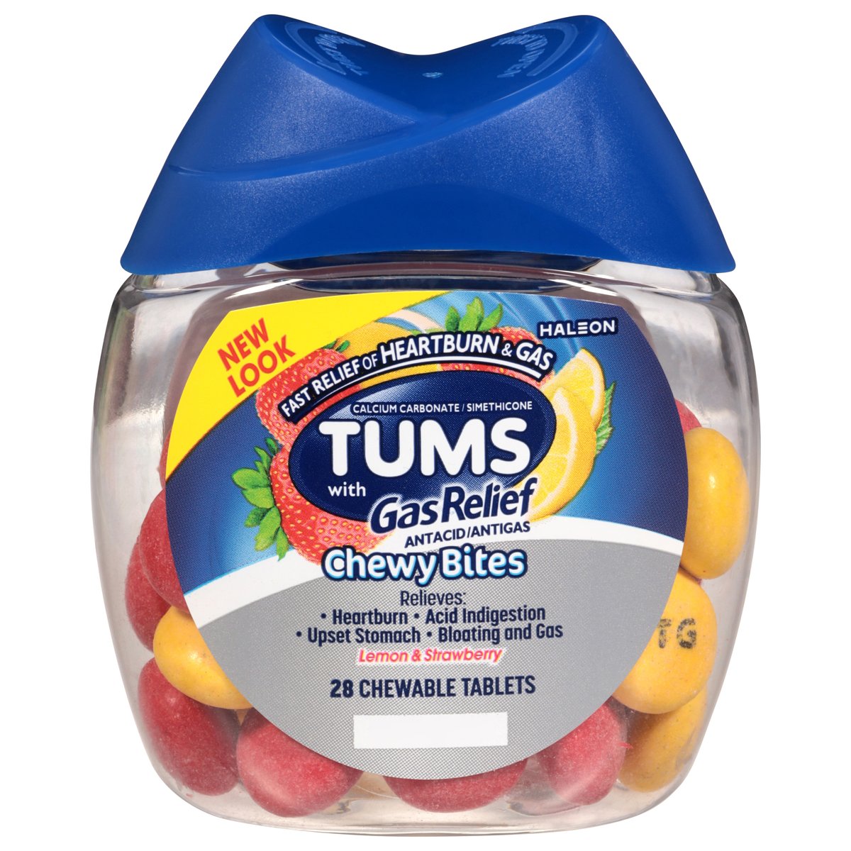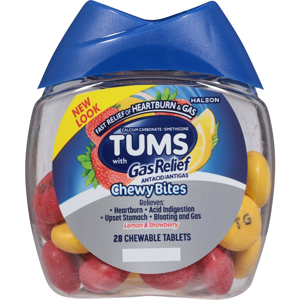Per Tablet: Other Information: Each chewable tablet contains: elemental calcium 300 mg. Do not store above 25 degrees C (77 degrees F). Contains FD&C Yellow No. 5 (tartrazine) as a color additive. New look. Fast relief of heartburn & gas. Relieves: Heartburn, acid indigestion, upset stomach, bloating and gas. Questions or comments? 1-800-897-7535.