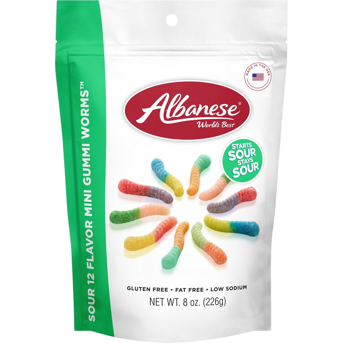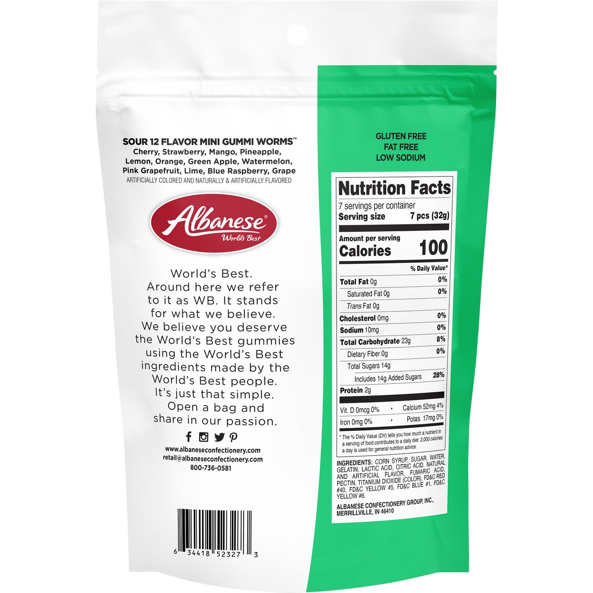 Sour 12 Flavor Gummi Worms: Cherry, strawberry, mango, pineapple, lemon, orange, green apple, watermelon, pink grapefruit, lime, blue raspberry, grape. Artificially colored and naturally & artificially flavored. Gluten free. Fat free. Low sodium. Starts sour stays sour. World's best. Around here we refer to it as WB. It stands for what we believe. We believe you deserve the World's Best gummies using the World's Best ingredients made by the World's Best people. It's just that simple. Open a bag and share in our passion. www.albaneseconfectionery.com. Facebook. Instagram. Twitter. Pintrest. Made in the USA.