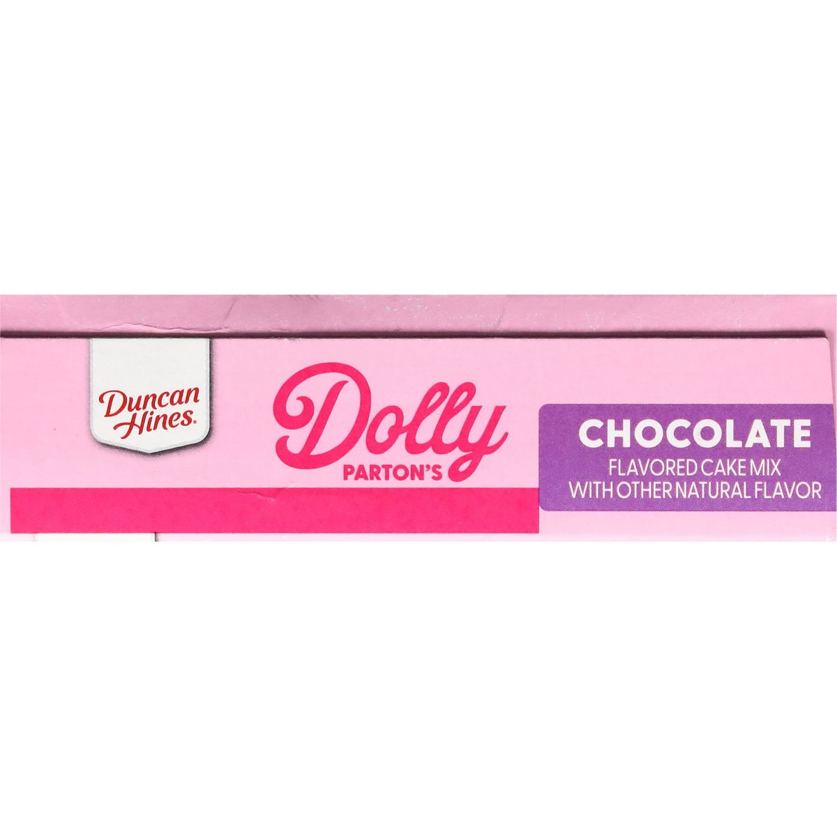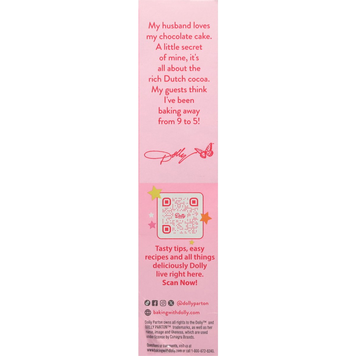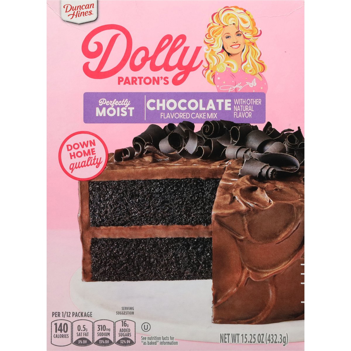Chocolate flavored cake mix with other natural flavor. Per 1/12 Package: 140 calories; 0.5 g sat fat (3% DV); 310 mg sodium (13% DV); 16 g added sugars (32% DV). See nutrition facts for "as baked" information. Perfectly moist. Down home quality. My husband loves my chocolate cake. A little secret of mine, it's all about the rich Dutch cocoa. My guests think I've been baking away from 9 to 5! - Dolly. bakingwithdolly.com. how2recycle.info. Tasty tips, easy recipes and all things deliciously Dolly live right here. Scan Now! Tiktok. Facebook. Instagram. Twitter. @dollyparton. SmartLabel: Scan for more food information or call 1-800-672-8240. Questions or comments, visit us at ww.bakingwithdolly.com or call 1-800-672-8240.