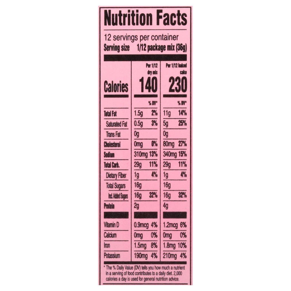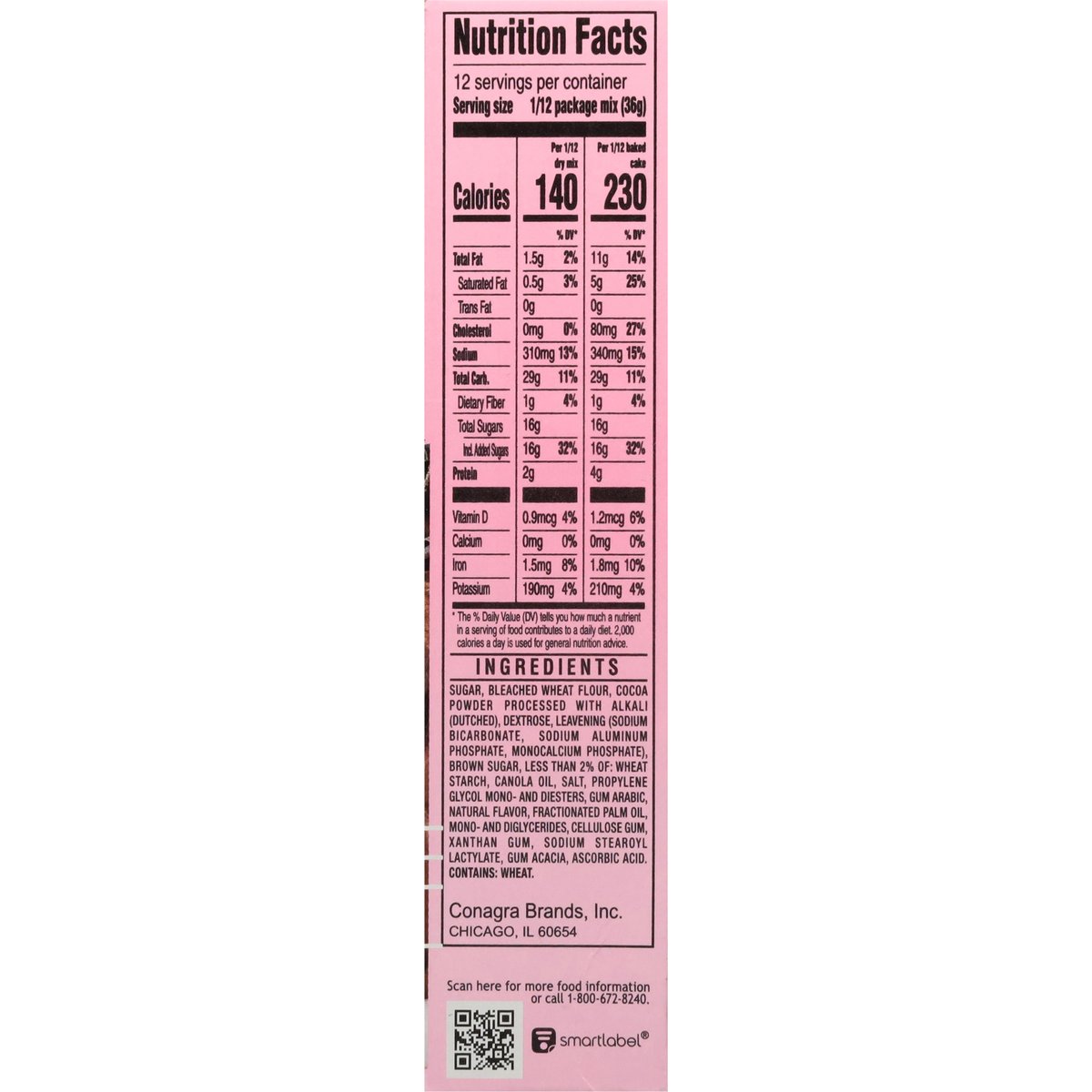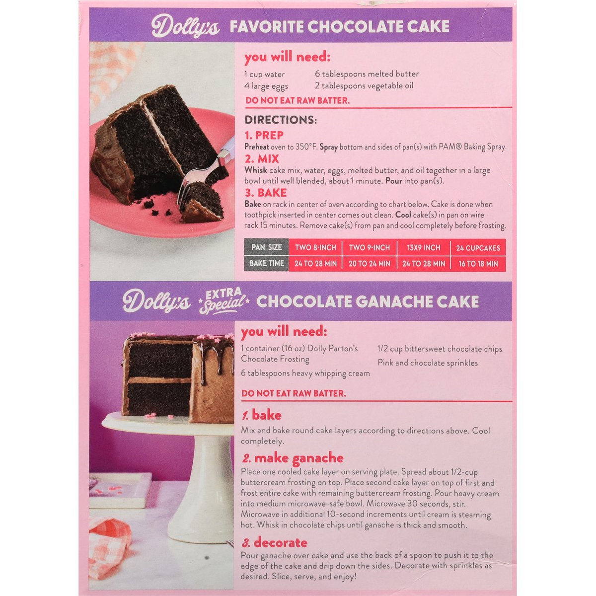Chocolate flavored cake mix with other natural flavor. Per 1/12 Package: 140 calories; 0.5 g sat fat (3% DV); 310 mg sodium (13% DV); 16 g added sugars (32% DV). See nutrition facts for "as baked" information. Perfectly moist. Down home quality. My husband loves my chocolate cake. A little secret of mine, it's all about the rich Dutch cocoa. My guests think I've been baking away from 9 to 5! - Dolly. bakingwithdolly.com. how2recycle.info. Tasty tips, easy recipes and all things deliciously Dolly live right here. Scan Now! Tiktok. Facebook. Instagram. Twitter. @dollyparton. SmartLabel: Scan for more food information or call 1-800-672-8240. Questions or comments, visit us at ww.bakingwithdolly.com or call 1-800-672-8240.
