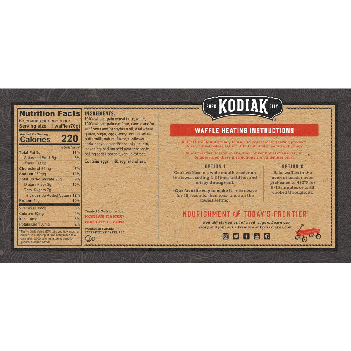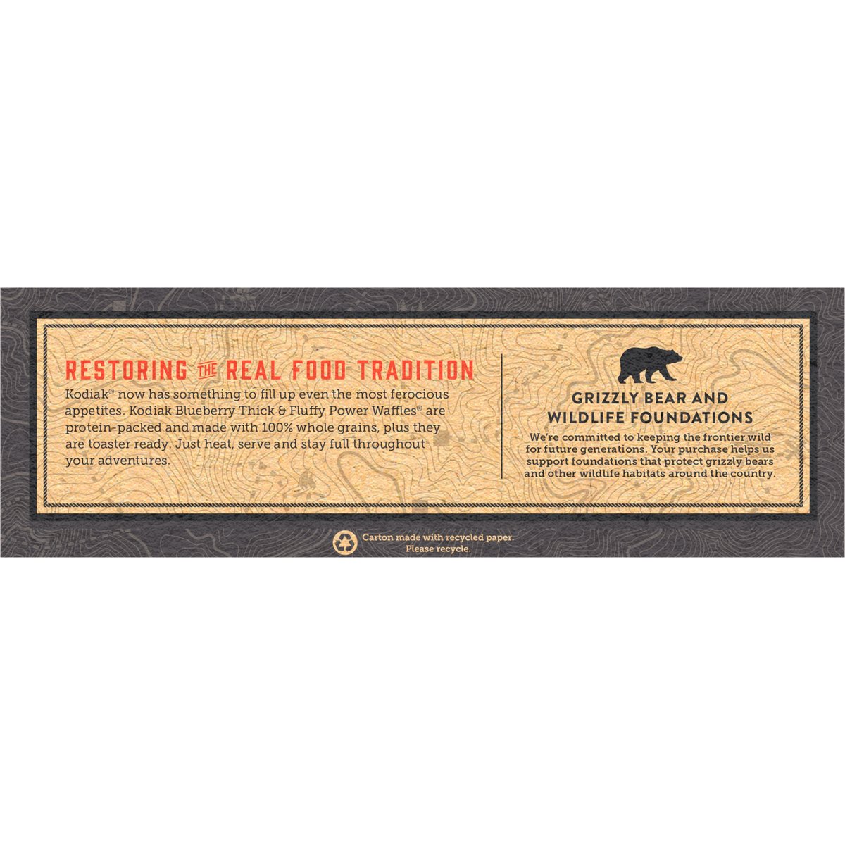 10 g protein per serving. Crafted with 100% whole grains. Protein packed. Whole grains taste better. Restoring the real food tradition. Kodiak now has something to fill up even the most ferocious appetites. Kodiak Blueberry Thick & Fluffy Power Waffles are protein-packed and made with 100% whole grains, plus they are toaster ready. Just heat, serve and stay full throughout your adventures. kodiakcakes.com. Instagram. Twitter. Facebook. YouTube. Pinterest. Nourishment for Today's Frontier: Kodiak started out of a red wagon. Learn our story and join our adventure at kodiakcakes.com. Grizzly Bear and Wildlife Foundations: We're committed to keeping the frontier wild for future generations. Your purchase helps us support foundations that protect grizzly bears and other wildlife habitats around the country. Discover Another Frontier Favorite: Flapjack & waffle mix; Protein-packed oatmeal; Muffin power-cups. Carton made with recycled paper. Please recycle. Product of Canada.