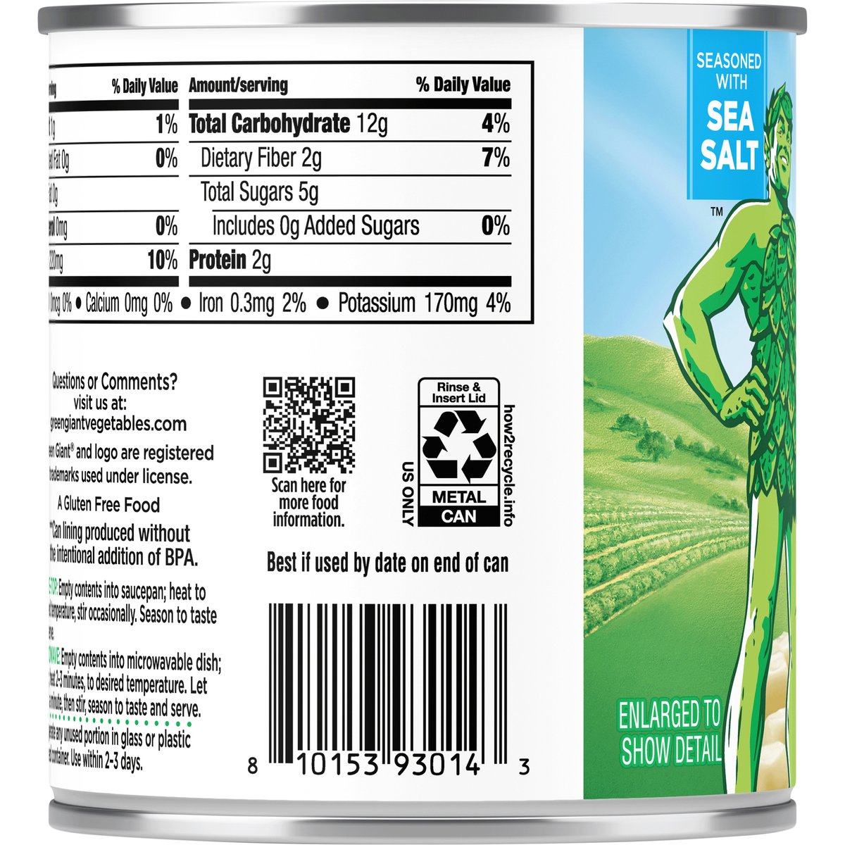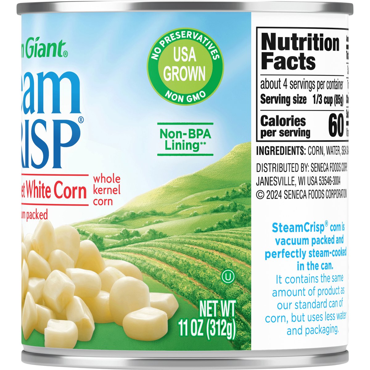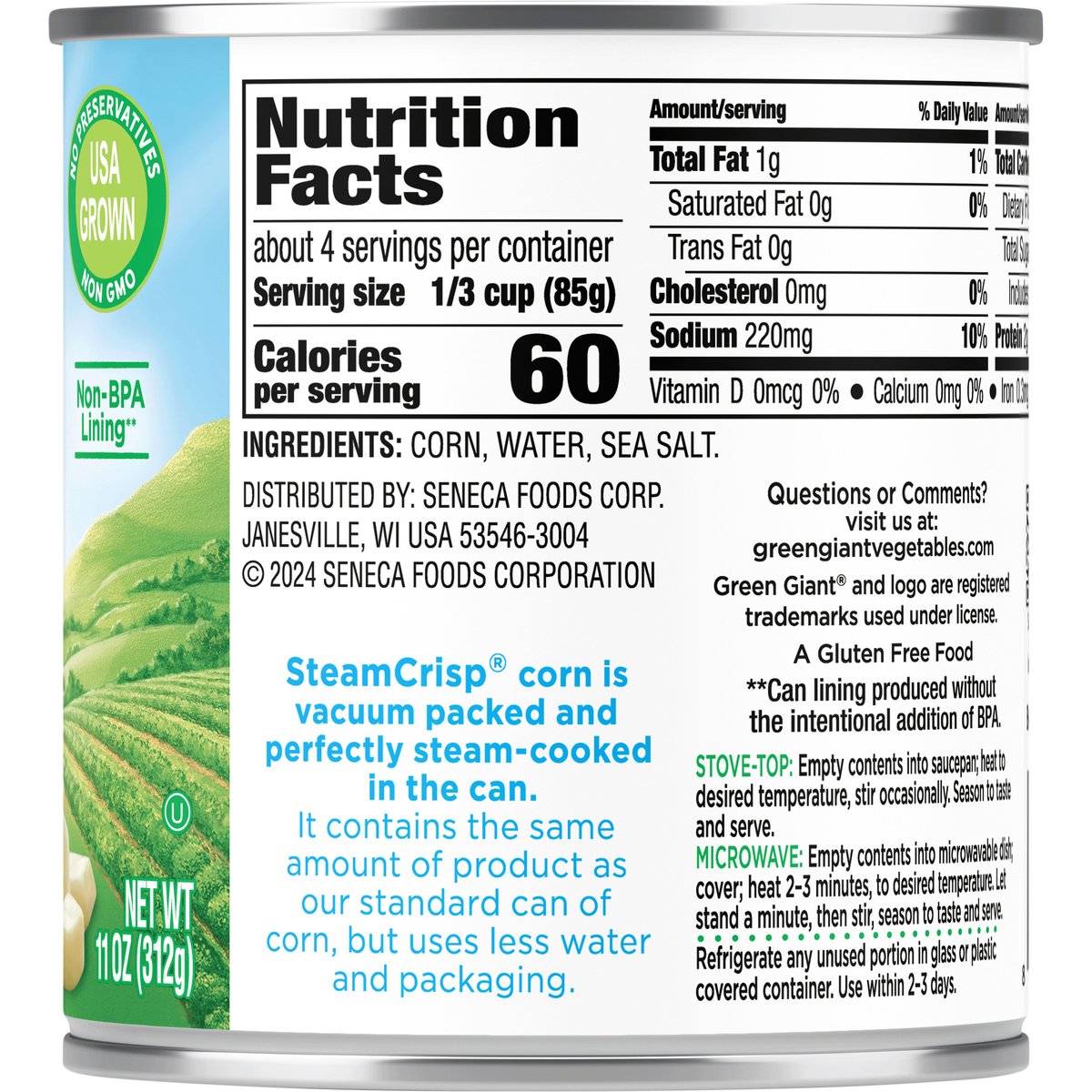 Seasoned with sea salt. Whole kernel corn. A gluten free food. Non GMO. SteamCrisp corn is vacuum packed and perfectly steam-cooked in the can. It contains the same amount of product as our standard can of corn, but uses less water and packaging. No preservatives. greengiantvegetables.com. how2recycle.info. Scan for more food information. Questions or comments? Visit us at: greengiantvegetables.com. Non-BPA lining**. ** Can lining produced without the intentional addition of BPA. USA grown.